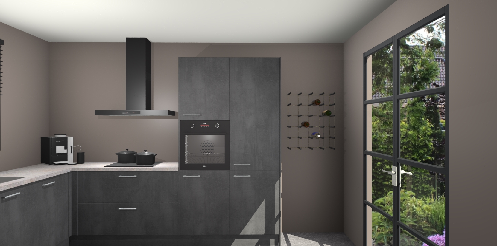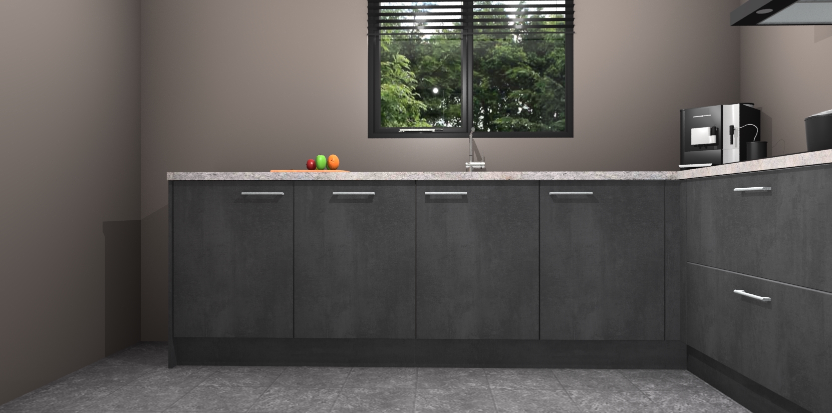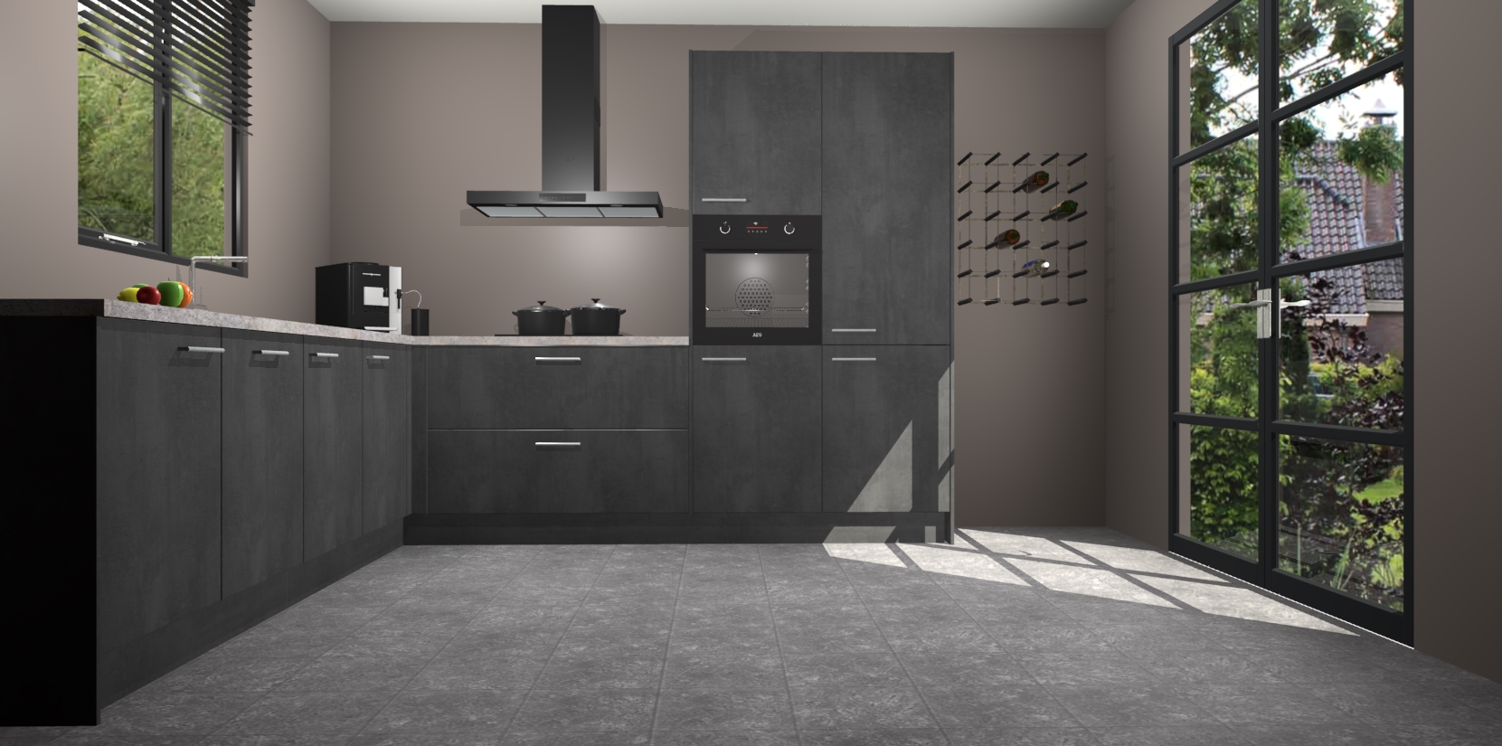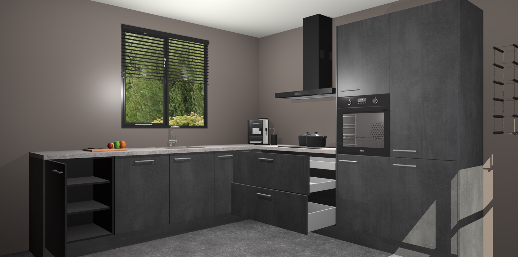 De Beton Zwarte keuken Porto heeft 5 ingebouwde apparaten - een oven, inductiekookplaat, afzuigkap, vaatwasser en koelkast - waarmee u in een handomdraai heerlijke gerechten bereidt. Soft-close deuren zorgen voor nog meer functionaliteit en gemak. En dit alles voor een onverslaanbaar vaste prijs. En als u nu bestelt, duurt de levering maar 7 weken! Wat nog ongelooflijker is, is dat onze kasten voor gemonteerd worden geleverd.