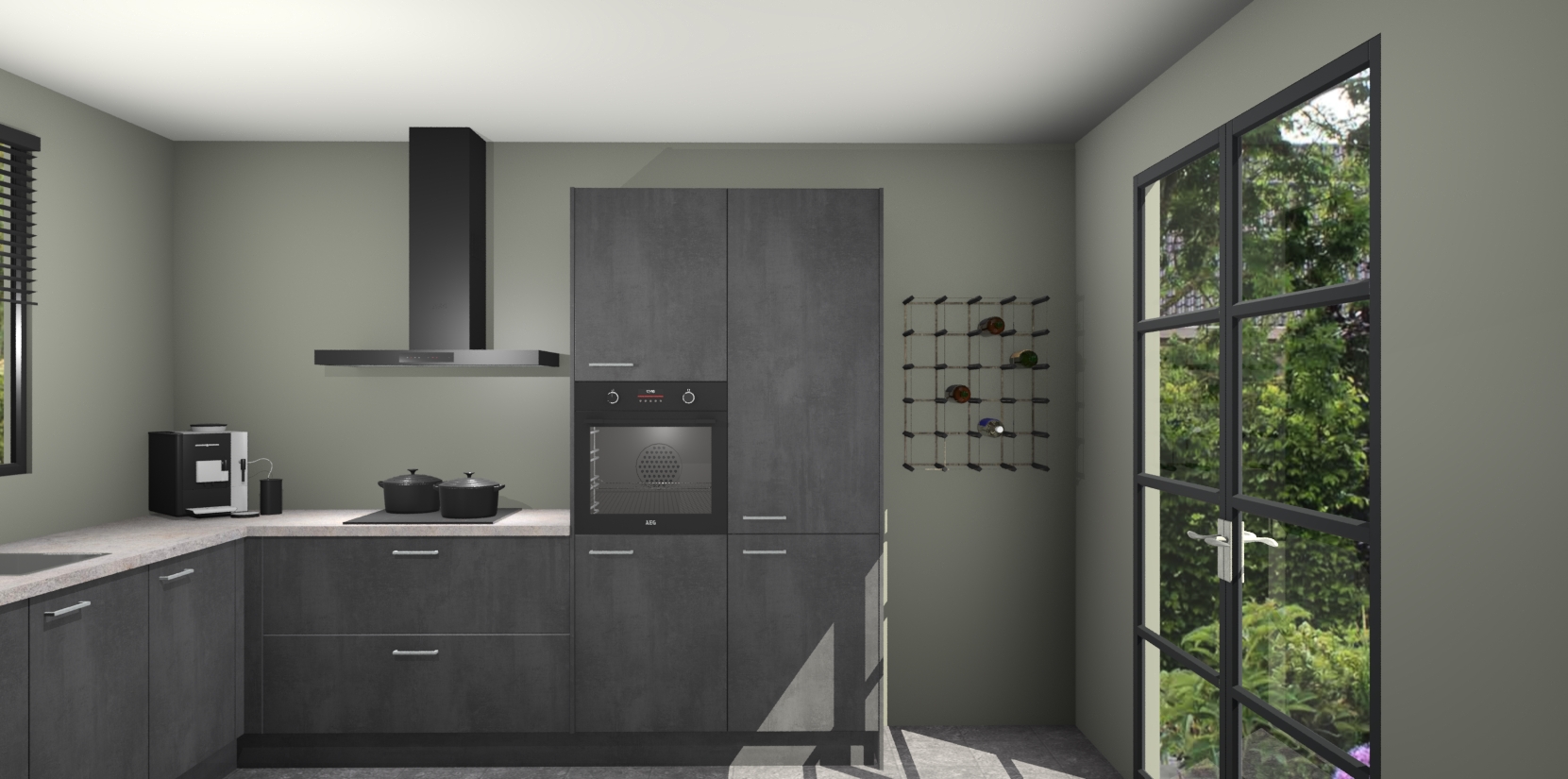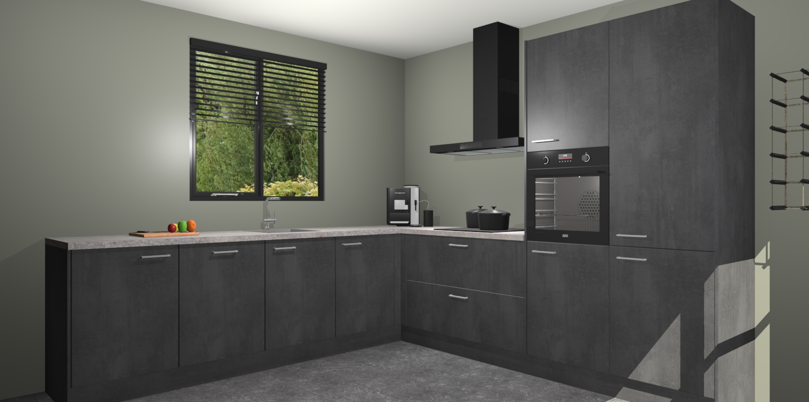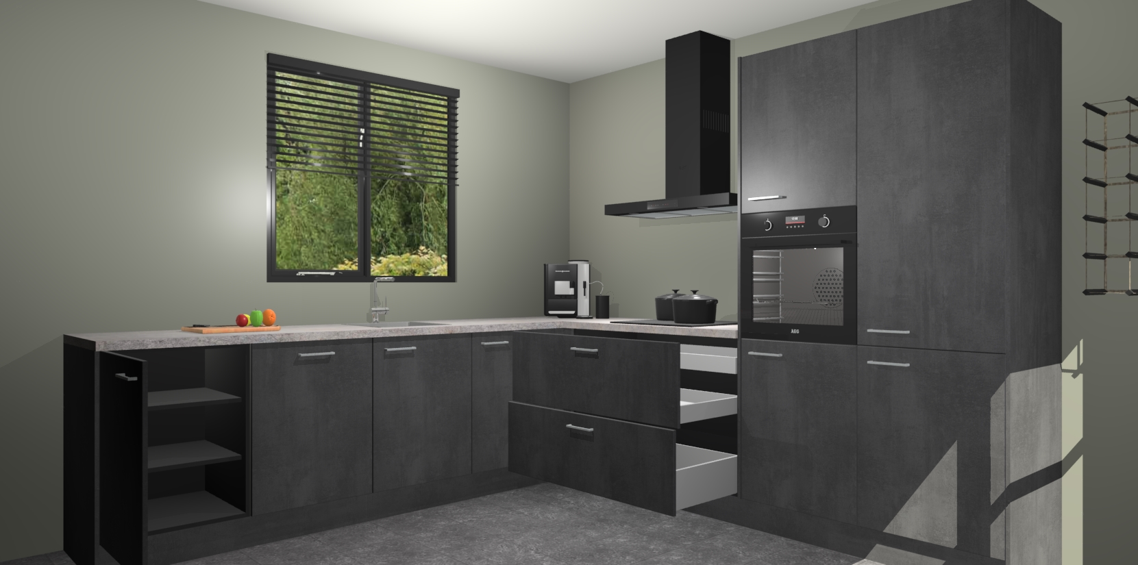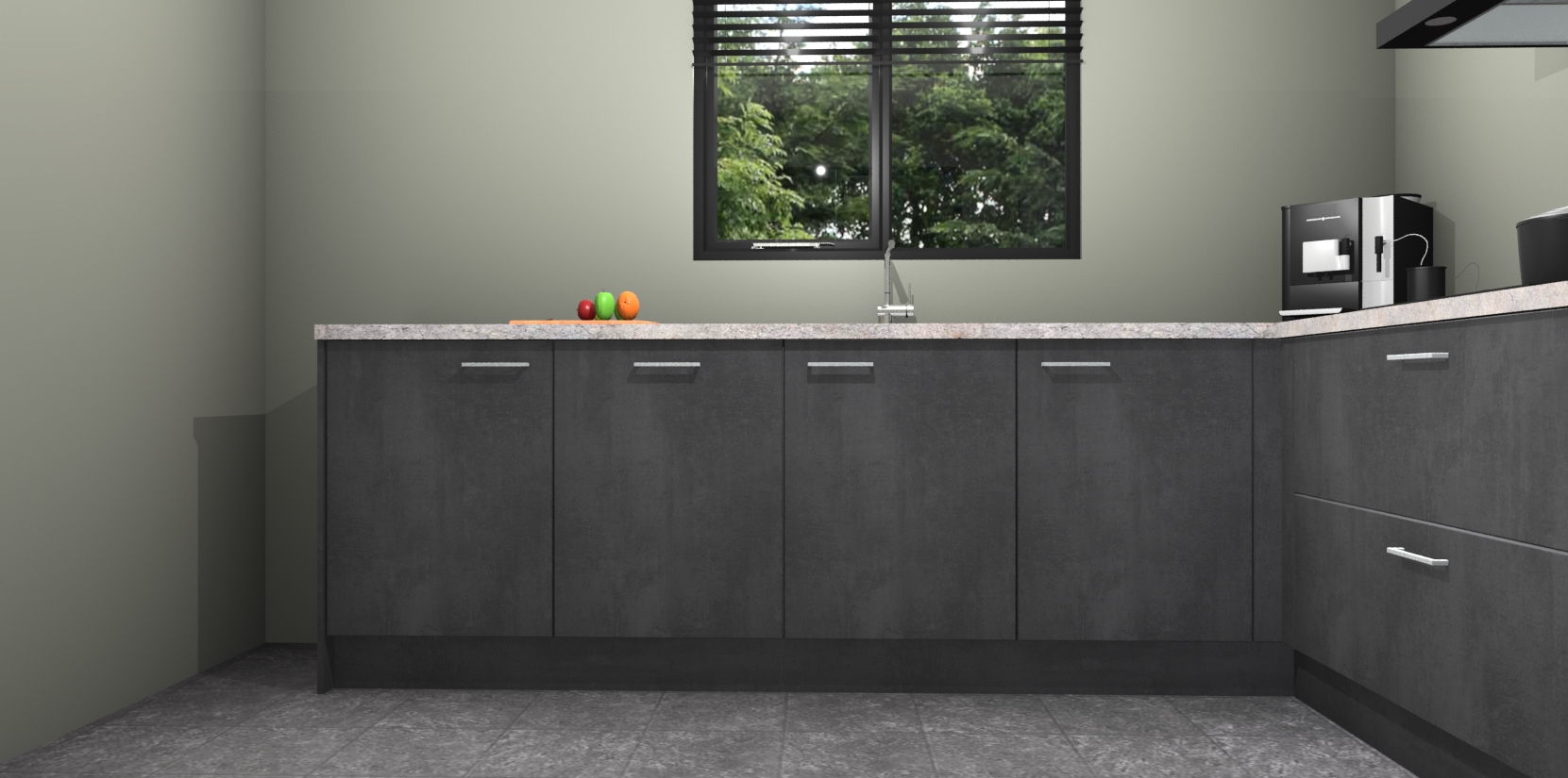 De Beton Zwarte keuken Porto heeft 5 ingebouwde apparaten - een oven, inductiekookplaat, afzuigkap, vaatwasser en koelkast - waarmee u in een handomdraai heerlijke gerechten bereidt. Soft-close deuren zorgen voor nog meer functionaliteit en gemak. En dit alles voor een onverslaanbaar vaste prijs. En als u nu bestelt, duurt de levering maar 7 weken! Wat nog ongelooflijker is, is dat onze kasten voor gemonteerd worden geleverd.