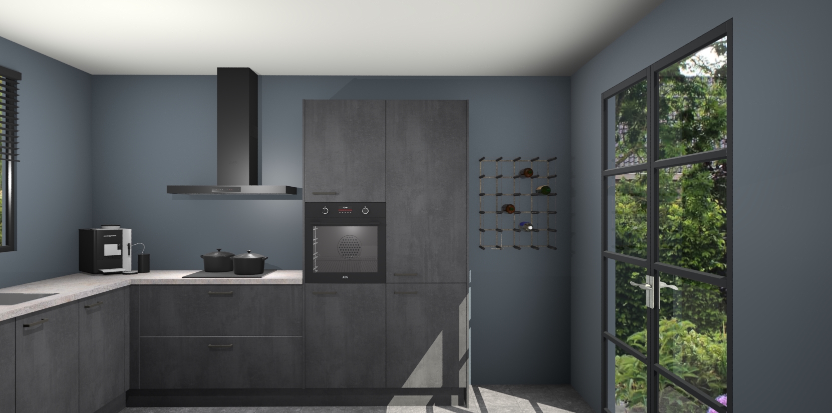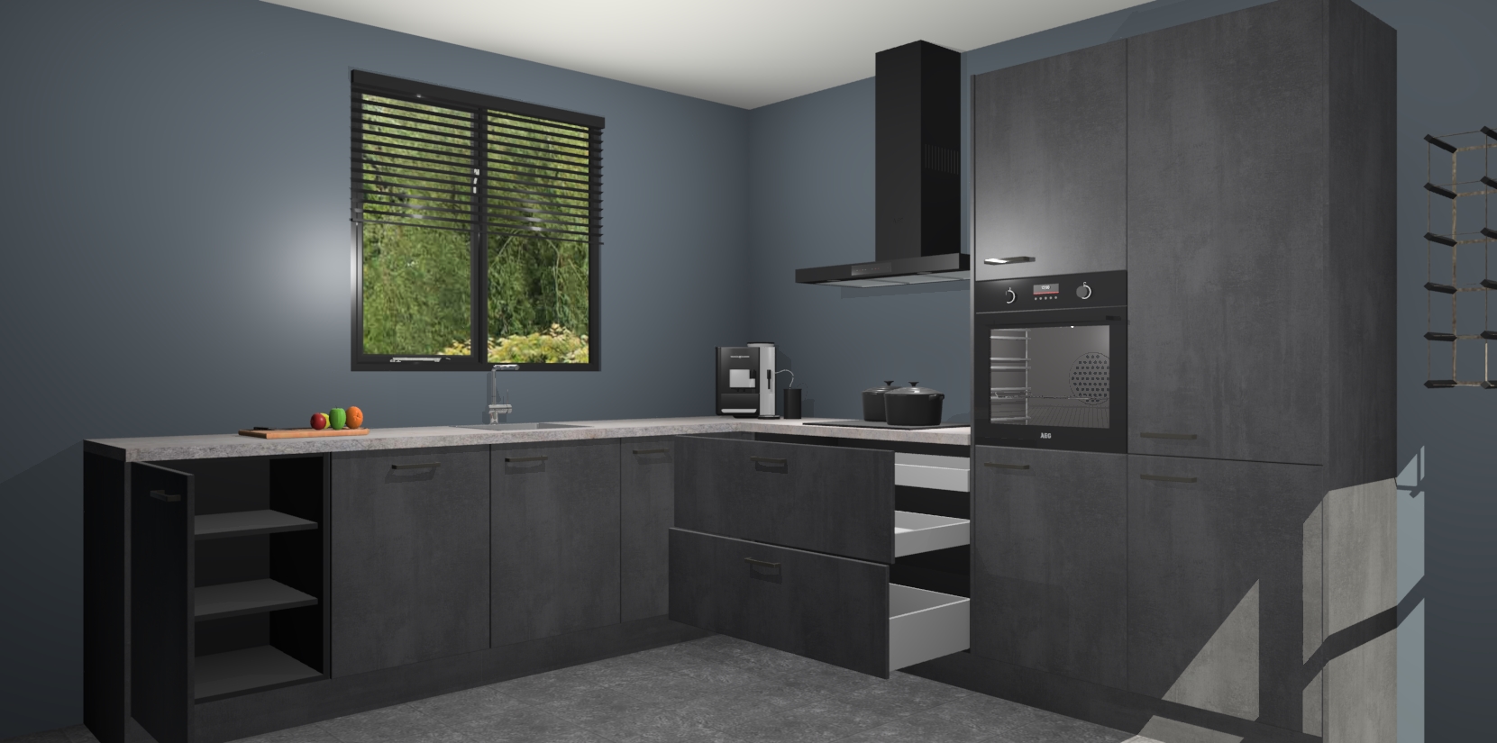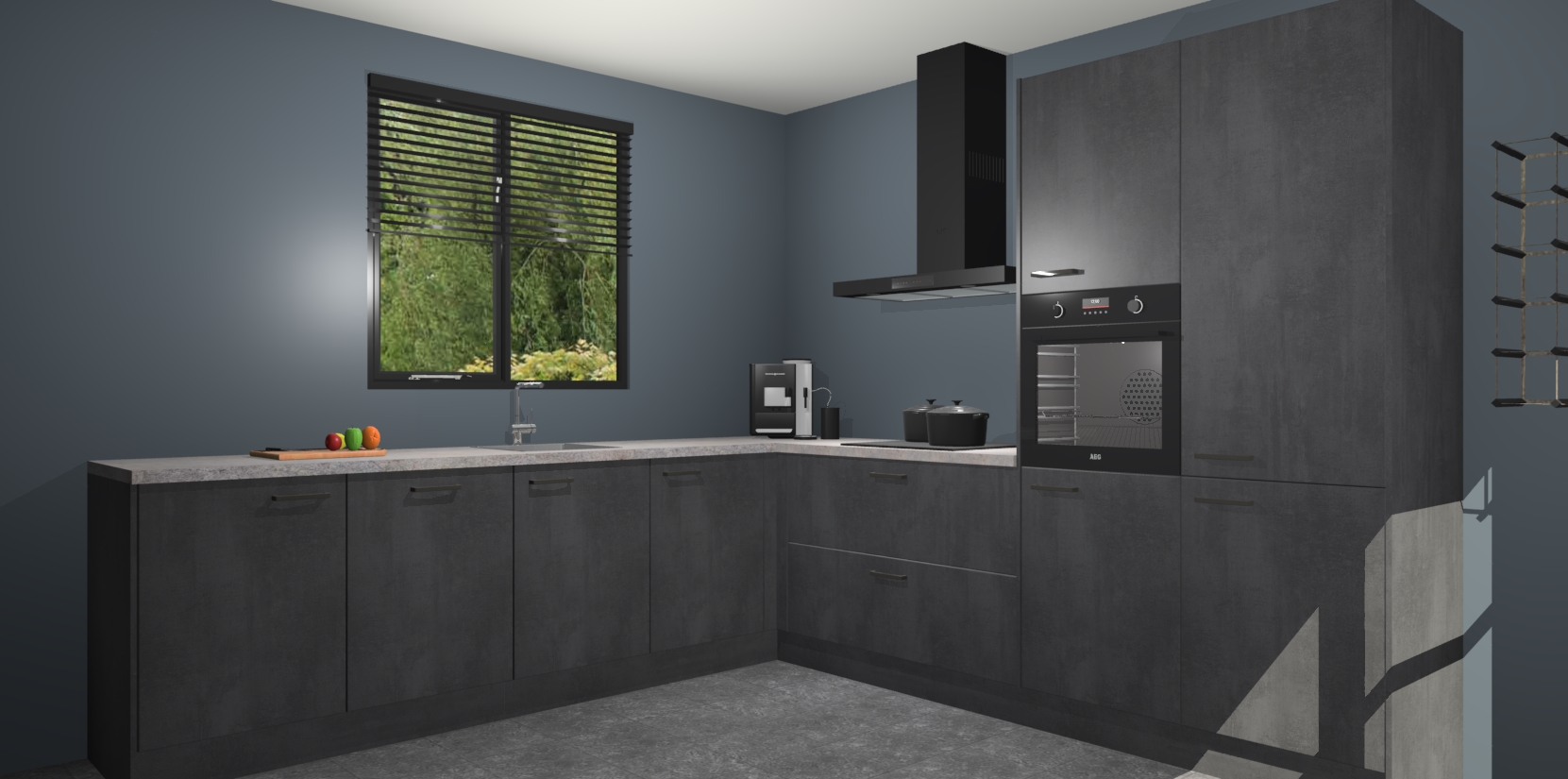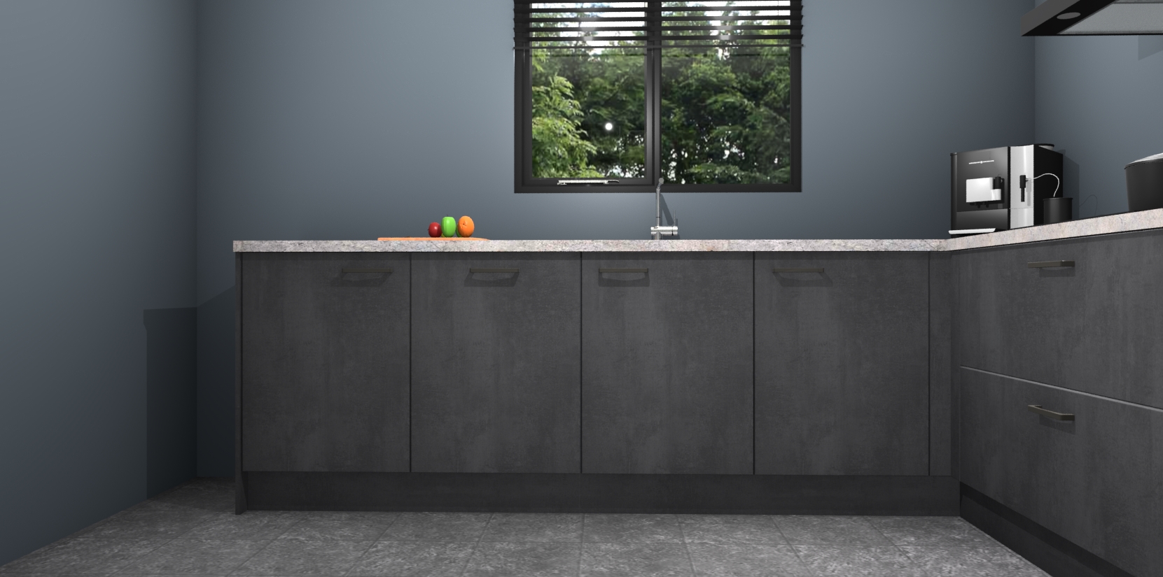 De Beton Zwarte keuken Porto heeft 5 ingebouwde apparaten - een oven, inductiekookplaat, afzuigkap, vaatwasser en koelkast - waarmee u in een handomdraai heerlijke gerechten bereidt. Soft-close deuren zorgen voor nog meer functionaliteit en gemak. En dit alles voor een onverslaanbaar vaste prijs. En als u nu bestelt, duurt de levering maar 7 weken! Wat nog ongelooflijker is, is dat onze kasten voor gemonteerd worden geleverd.