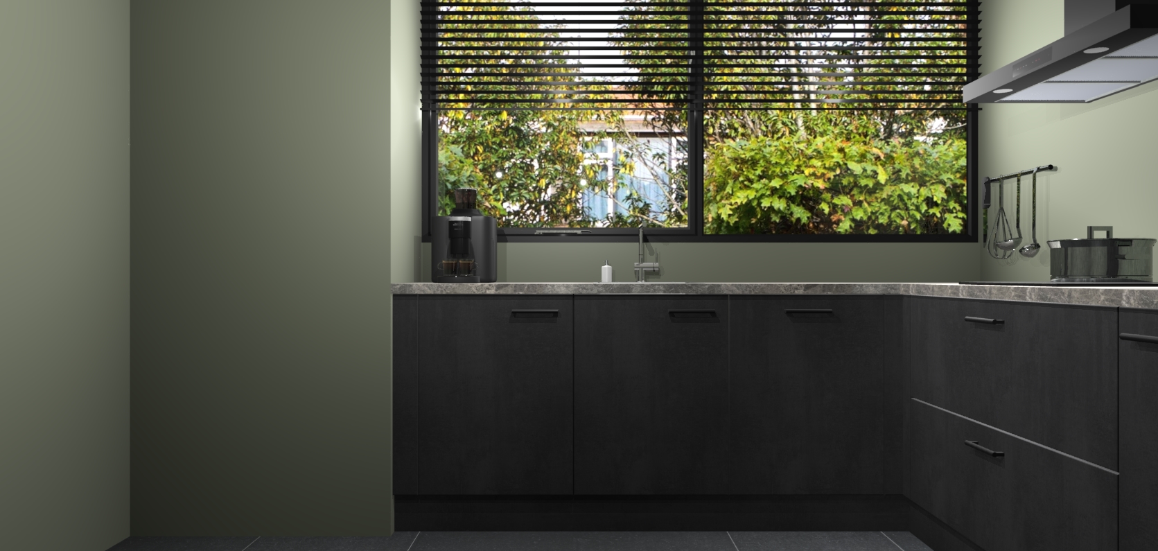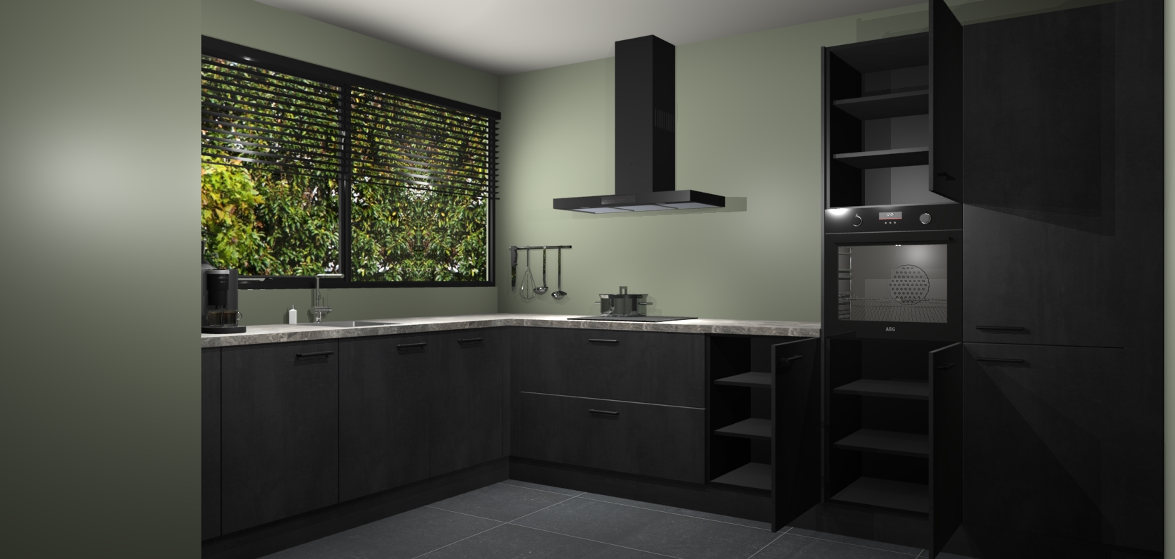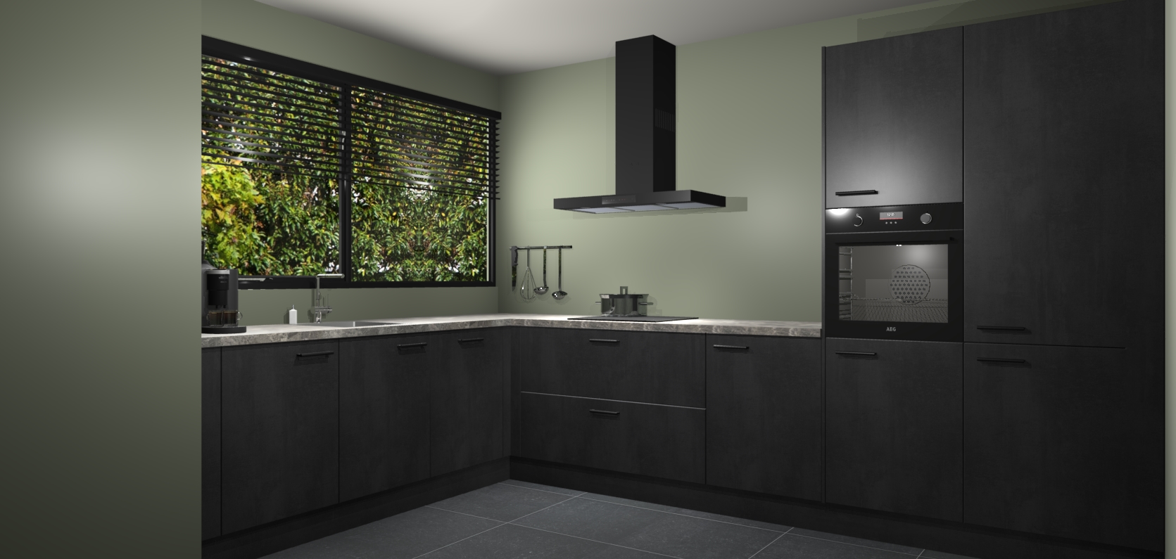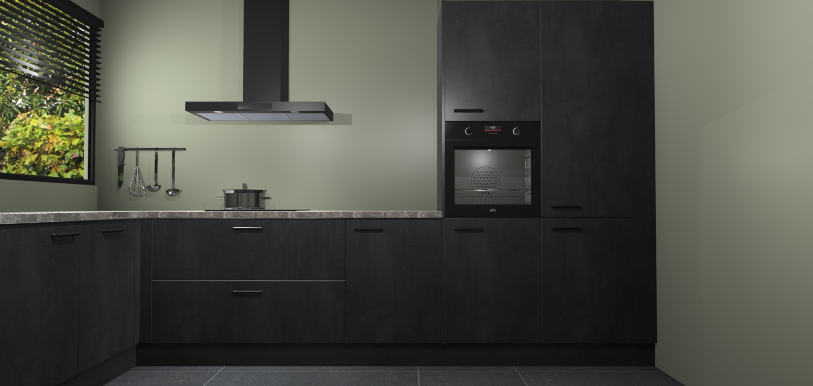 Wij presenteren de revolutie in keukens: de Beton Zwarte keuken Rhodos. Met modern design, een tijdloos uiterlijk en kasten die al voor gemonteerd worden geleverd, laat deze stijlvolle keuken uw kookervaring op een hele nieuwe manier transformeren.