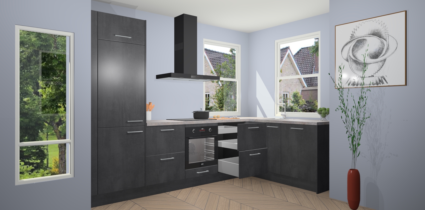 Welkom bij de Beton Zwarte keuken Salzburg! Met een chique combinatie van een prachtig houten werkblad, klassiek design en altijd concurrerende prijzen is de Beton Zwarte keuken Salzburg de keuken van uw dromen! Deze keuken is perfect voor alle huisformaten en decorstijlen en straalt stijl en verfijning uit. Van het tijdloze design tot de functionele functies, er is geen betere manier om de look van uw woon- of kookruimte te verbeteren.