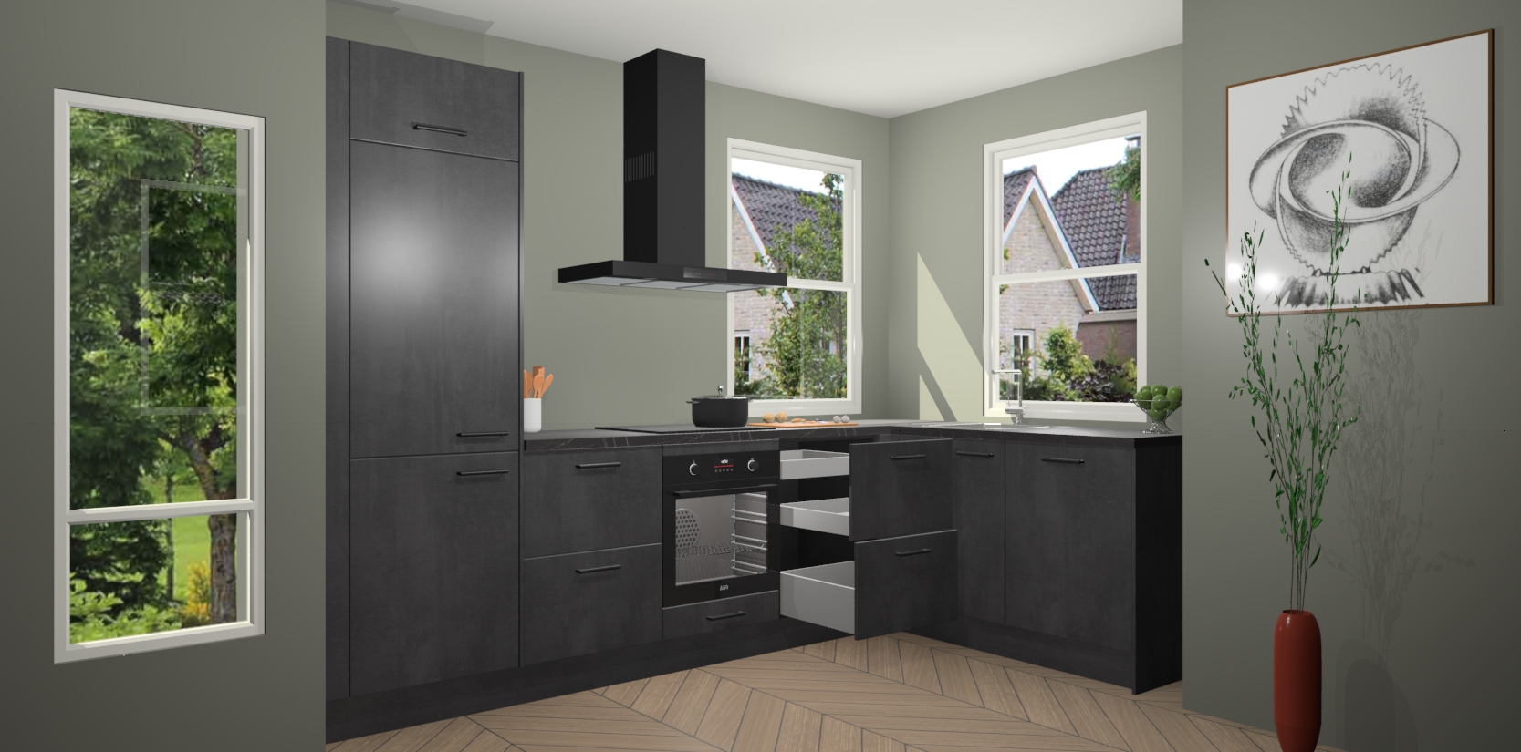 Welkom bij de Beton Zwarte keuken Salzburg! Met een chique combinatie van een prachtig houten werkblad, klassiek design en altijd concurrerende prijzen is de Beton Zwarte keuken Salzburg de keuken van uw dromen! Deze keuken is perfect voor alle huisformaten en decorstijlen en straalt stijl en verfijning uit. Van het tijdloze design tot de functionele functies, er is geen betere manier om de look van uw woon- of kookruimte te verbeteren.