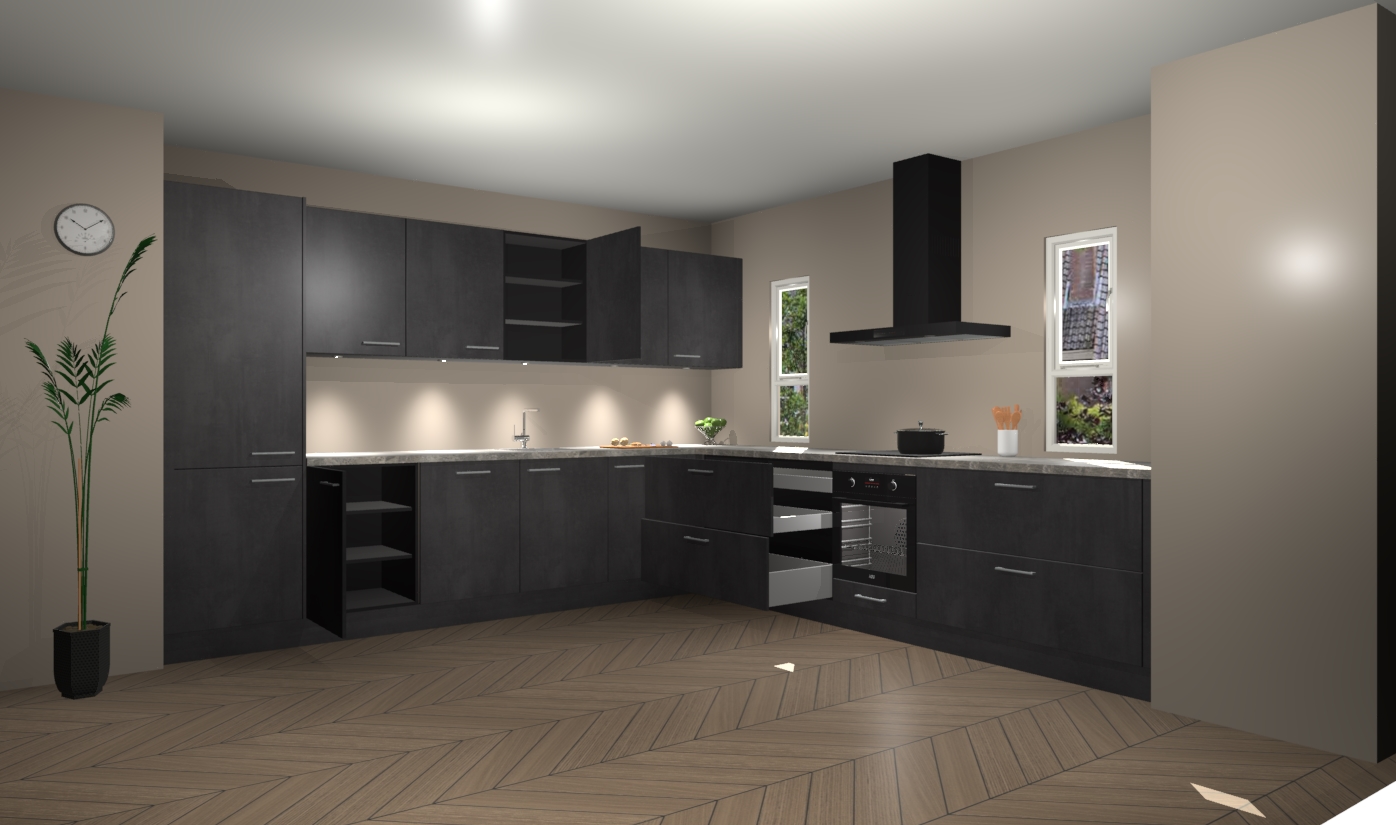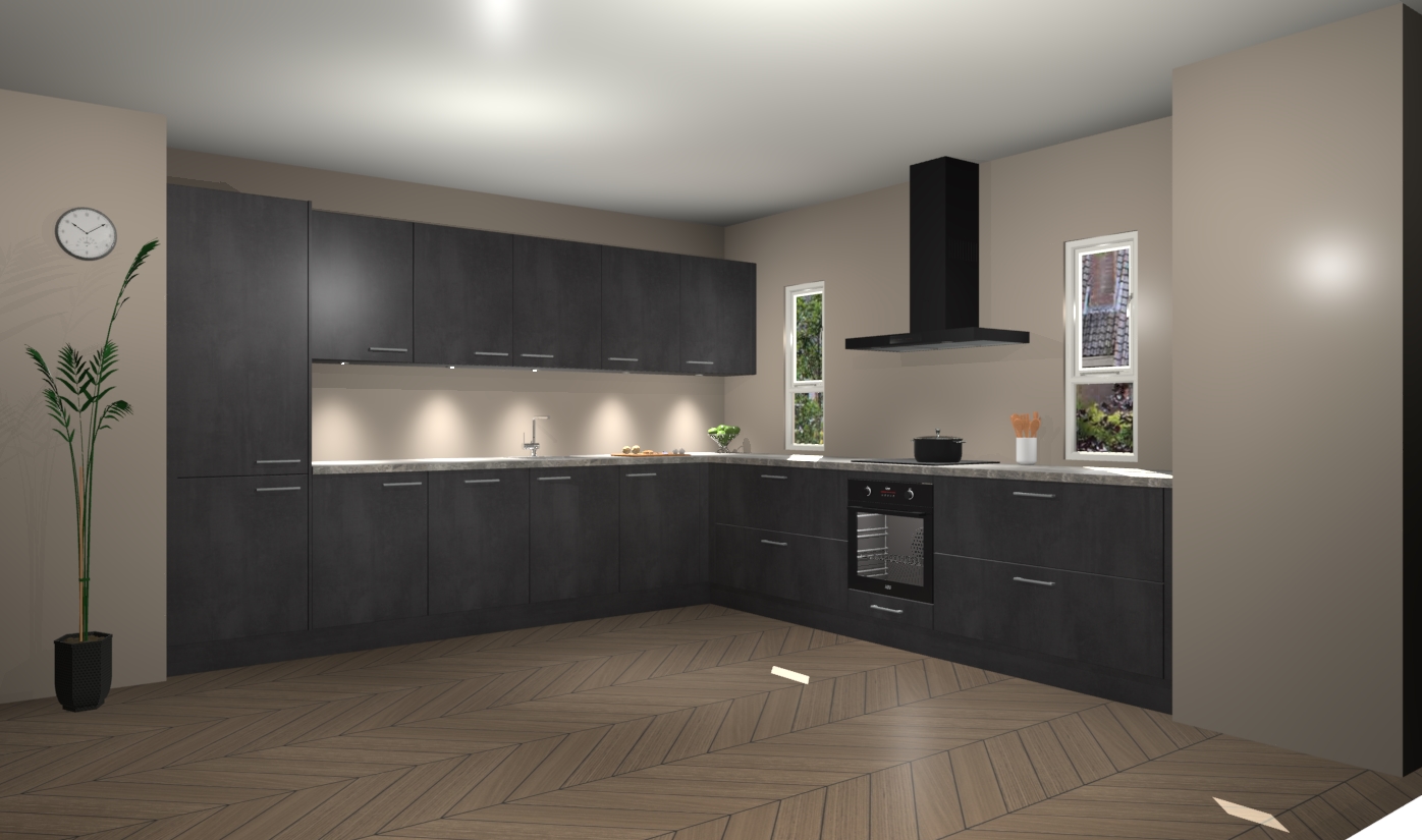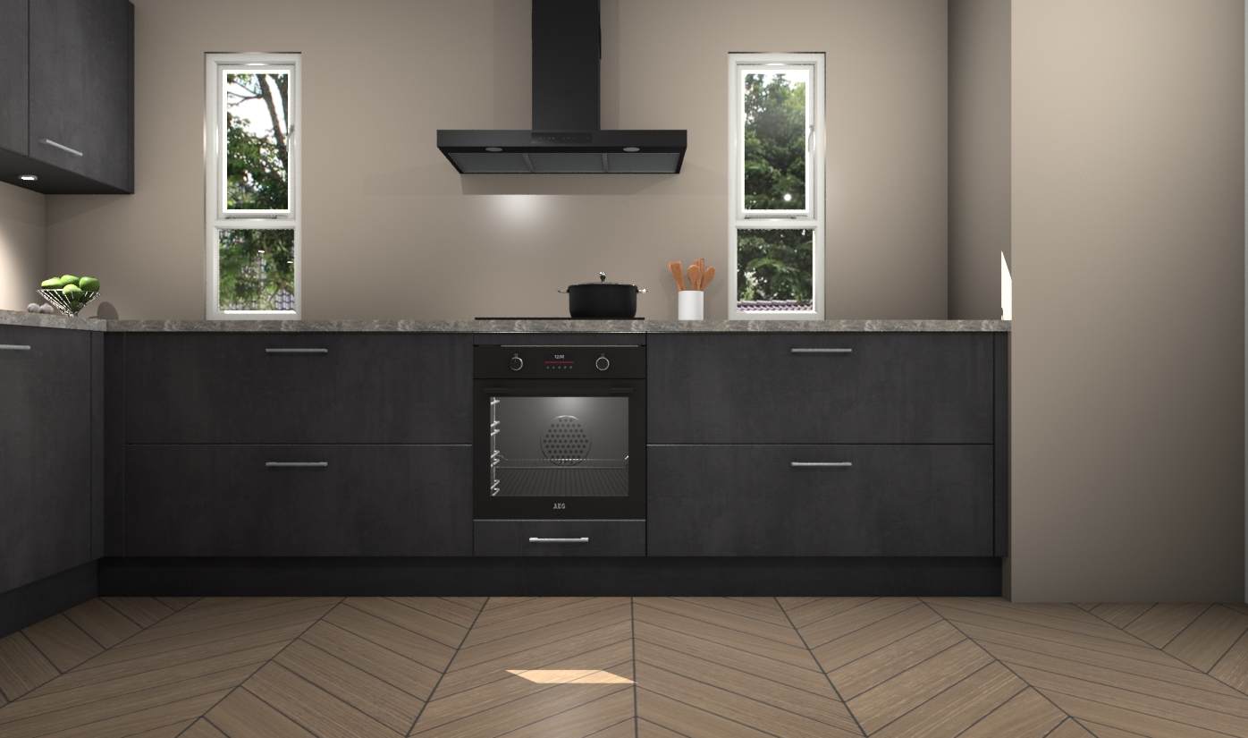 De beton zwarte keuken is een ideale hoekkeuken en heeft alle functies en apparatuur die u maar nodig kunt hebben. Bij de bestelling krijgt u een oven, inductiekookplaat, afzuigkap, vaatwasser en koelkast - deze kunnen desgewenst eenvoudig worden uitgebreid naar AEG na bestellen. Elke kast wordt ook voor gemonteerd geleverd met soft close deuren die jarenlang gebruik beloven. Stelt u zich voor dat u geen gedoe heeft met vervelende montage - vanaf het moment dat u uw bestelling plaats, duurt het slechts 7 weken voor het bij u thuis geleverd wordt.