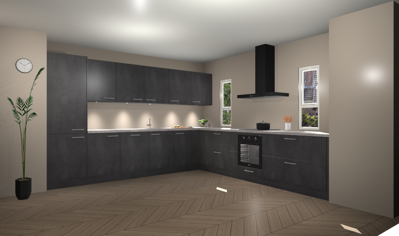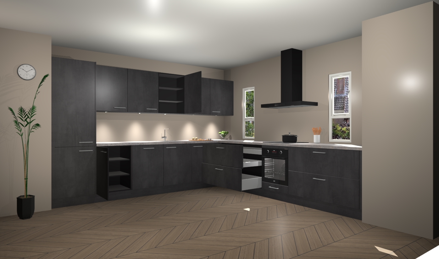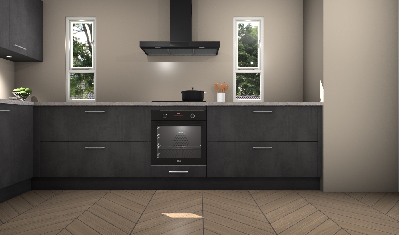 De beton zwarte keuken is een ideale hoekkeuken en heeft alle functies en apparatuur die u maar nodig kunt hebben. Bij de bestelling krijgt u een oven, inductiekookplaat, afzuigkap, vaatwasser en koelkast - deze kunnen desgewenst eenvoudig worden uitgebreid naar AEG na bestellen. Elke kast wordt ook voor gemonteerd geleverd met soft close deuren die jarenlang gebruik beloven. Stelt u zich voor dat u geen gedoe heeft met vervelende montage - vanaf het moment dat u uw bestelling plaats, duurt het slechts 7 weken voor het bij u thuis geleverd wordt.