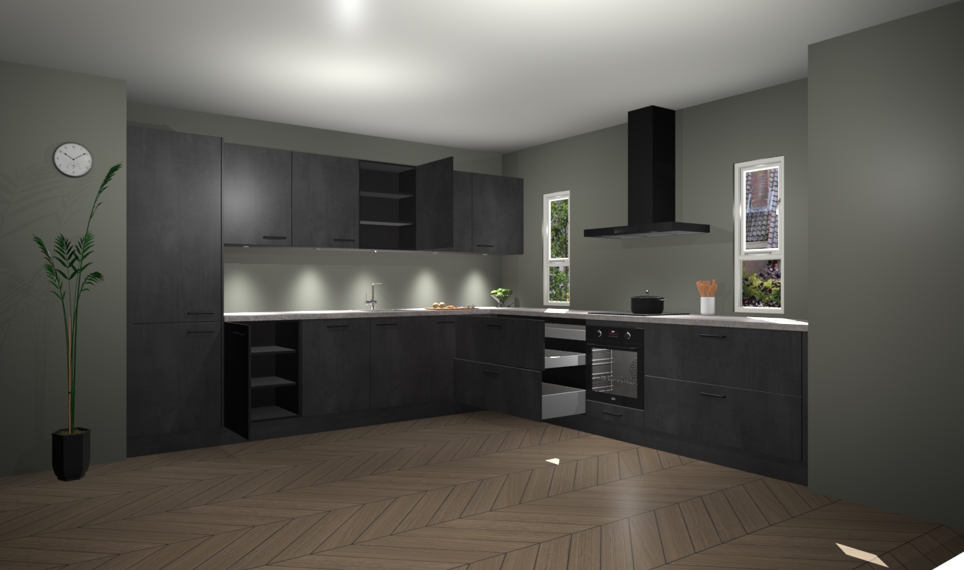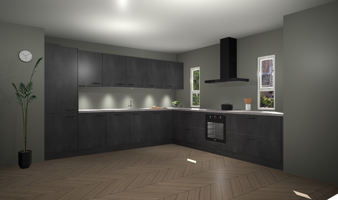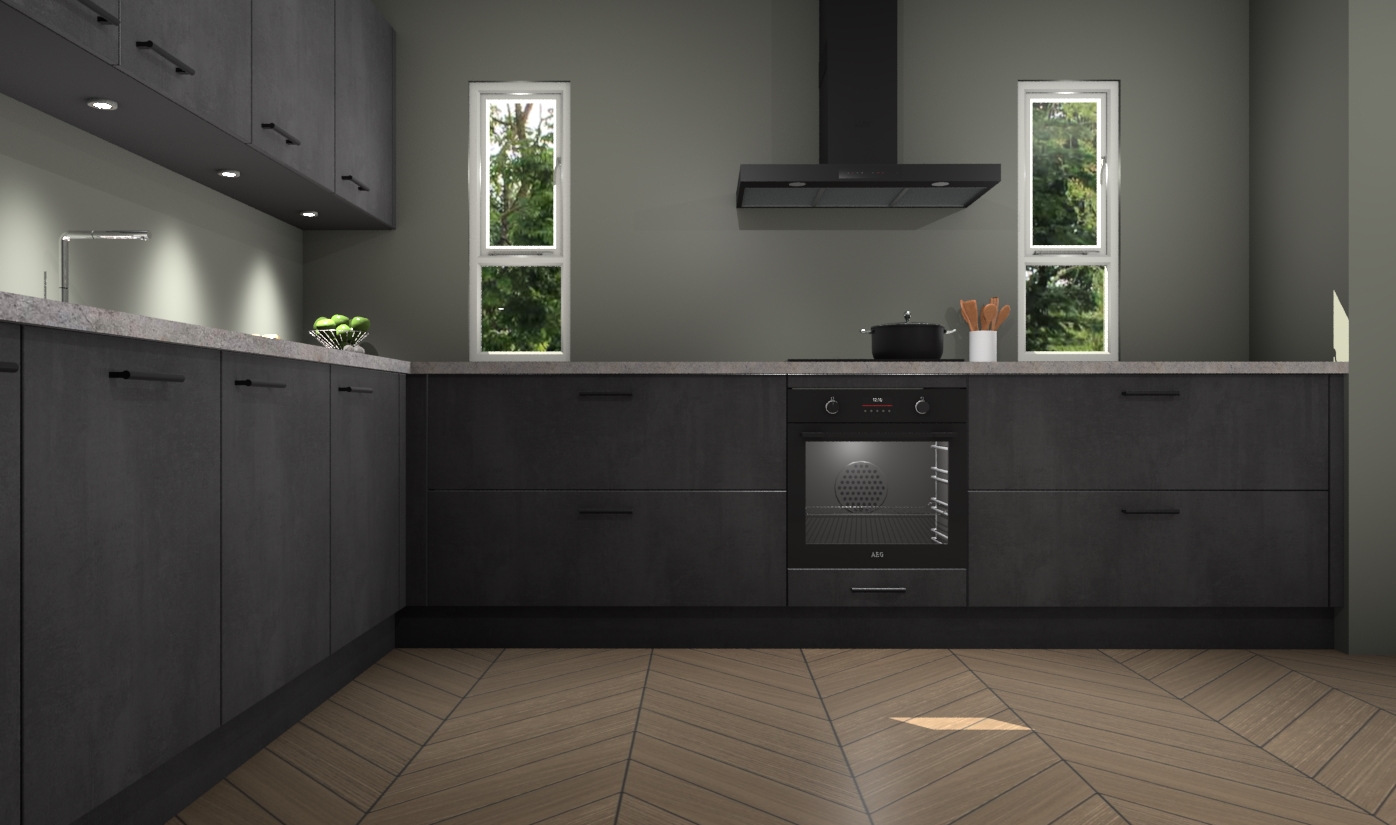 De beton zwarte keuken is een ideale hoekkeuken en heeft alle functies en apparatuur die u maar nodig kunt hebben. Bij de bestelling krijgt u een oven, inductiekookplaat, afzuigkap, vaatwasser en koelkast - deze kunnen desgewenst eenvoudig worden uitgebreid naar AEG na bestellen. Elke kast wordt ook voor gemonteerd geleverd met soft close deuren die jarenlang gebruik beloven. Stelt u zich voor dat u geen gedoe heeft met vervelende montage - vanaf het moment dat u uw bestelling plaats, duurt het slechts 7 weken voor het bij u thuis geleverd wordt.