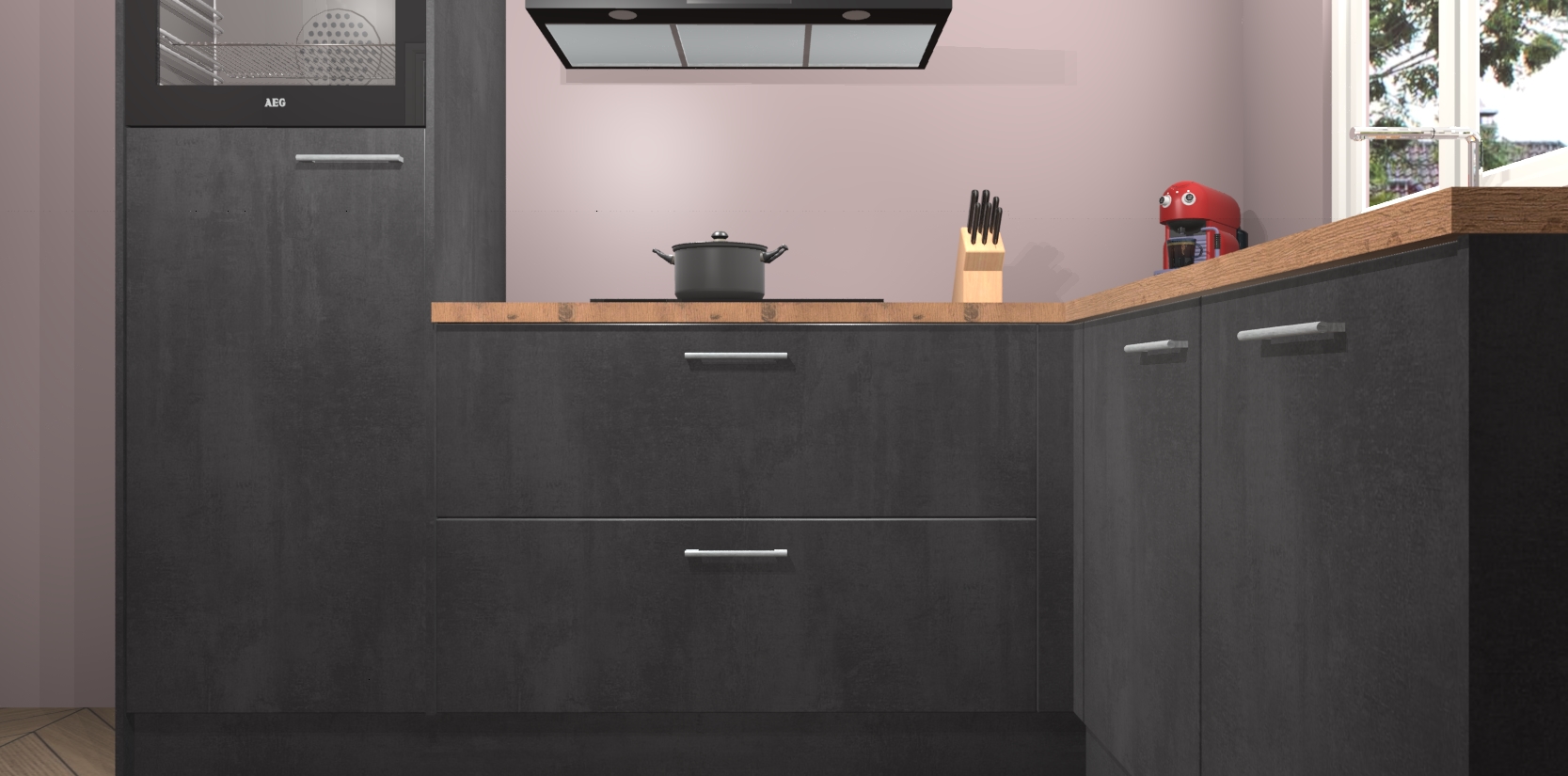 Dit model biedt u voldoende opbergruimte en vijf ingebouwde apparaten: een oven, inductiekookplaat, afzuigkap, vaatwasser en koelkast. Deze apparaten kunnen gemakkelijk worden geüpgrade naar AEG nadat u besteld heeft. De verschillende laden en kastjes bevatten softclose-deuren waardoor ze gezellig dichtvallen met een geruststellend helemaal geruisloos geluid. En dat is nog niet alles! We garanderen ook dat de prijs altijd laag blijft - dus haal nu uw Beton Zwarte keuken Victoria terwijl het kan.