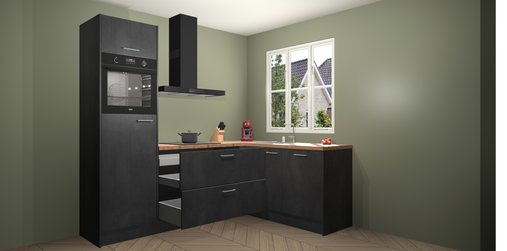 Dit model biedt u voldoende opbergruimte en vijf ingebouwde apparaten: een oven, inductiekookplaat, afzuigkap, vaatwasser en koelkast. Deze apparaten kunnen gemakkelijk worden geüpgrade naar AEG nadat u besteld heeft. De verschillende laden en kastjes bevatten softclose-deuren waardoor ze gezellig dichtvallen met een geruststellend helemaal geruisloos geluid. En dat is nog niet alles! We garanderen ook dat de prijs altijd laag blijft - dus haal nu uw Beton Zwarte keuken Victoria terwijl het kan.
