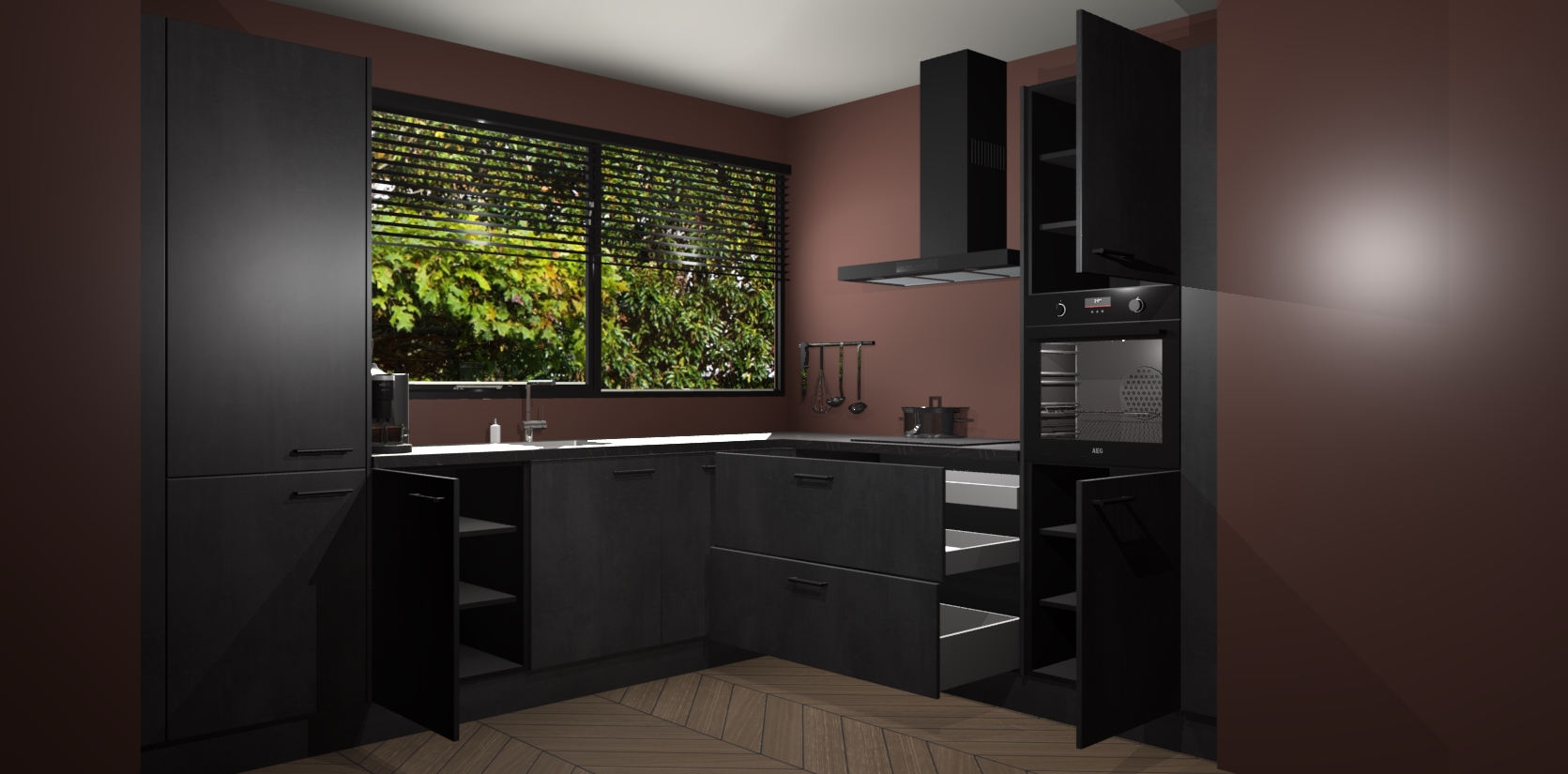 Wij presenteren de revolutie in keukens: de beton zwarte keuken Vogar. Met modern design, een tijdloos uiterlijk en kasten die al voor gemonteerd worden geleverd, laat deze stijlvolle keuken uw kookervaring op een hele nieuwe manier transformeren.
