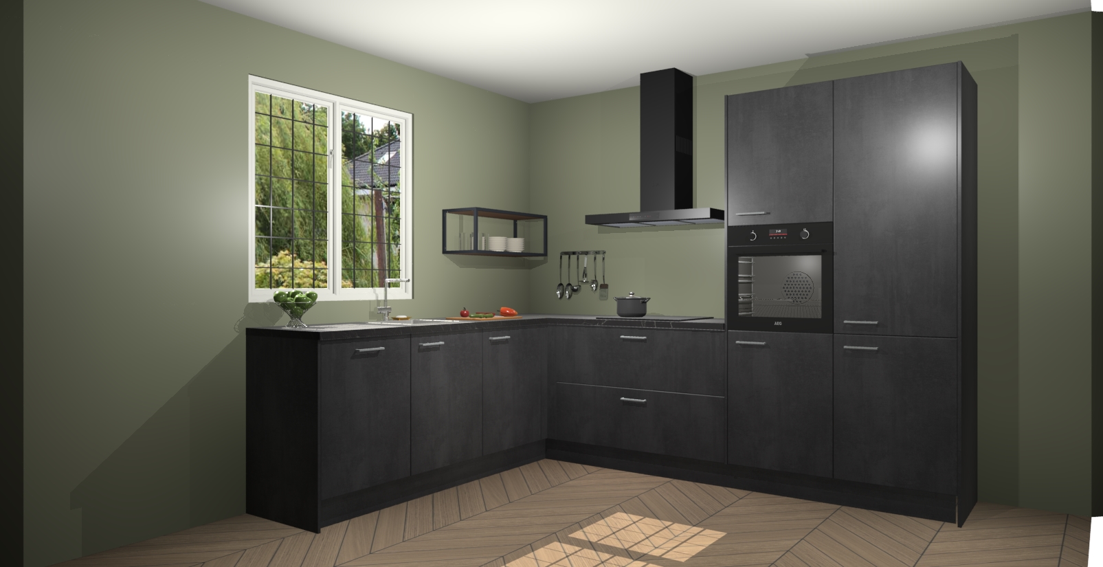 Onze beton zwarte keuken Willemstad biedt een luxueuze, stijlvolle look en biedt alle functionaliteit waar u naar verlangt. De betonlook straalt luxe uit, waardoor uw keuken makkelijk gezien wordt als een kunstwerk. Hoewel het beton het exterieur aanprijst, is binnenin de kasten juist prachtig donker van kleur.