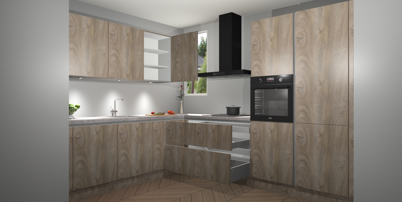 De ruime opbergruimte van dit model maakt het bereiden van voedsel en het gebruik van apparaten snel en gemakkelijk. Het beste van alles is dat het wordt geleverd met vijf inbouwapparaten: een oven, inductiekookplaat, afzuigkap, vaatwasser en koelkast - die allemaal gemakkelijk kunnen worden opgewaardeerd naar AEG na aankoop. Wat de gemaksfactor nog groter maakt, is het feit dat alle cabines voorgemonteerd worden geleverd, zodat u er meteen mee aan de slag kunt!