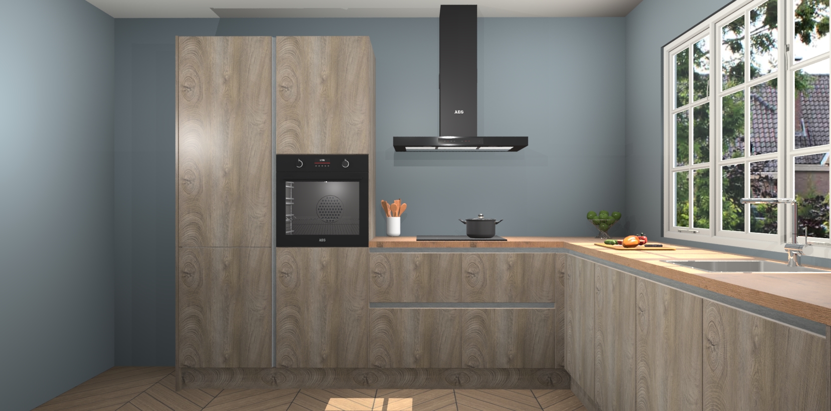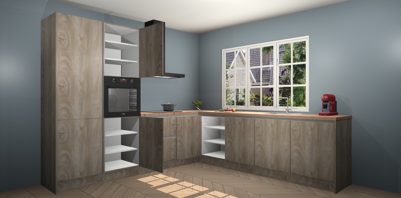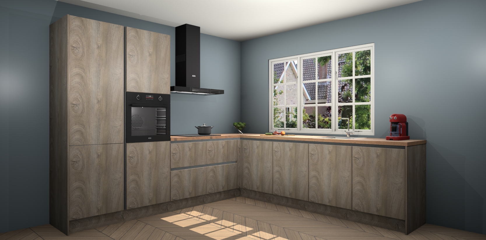 De keuken heeft veel opbergruimte, waardoor u alle ingrediënten gemakkelijk bereikbaar hebt staan. En daarnaast bevat deze volledig uitgeruste keuken ook 5 ingebouwde apparaten: een oven, inductiekookplaat, afzuigkap, vaatwasser en koelkast. Deze zijn heel eenvoudig na bestellen te upgraden naar AEG als u dit wilt. Bovendien zijn de softclose-kastdeuren ideaal; geef ze gewoon even een tikje en ze sluiten automatisch met geruisloze precisie.