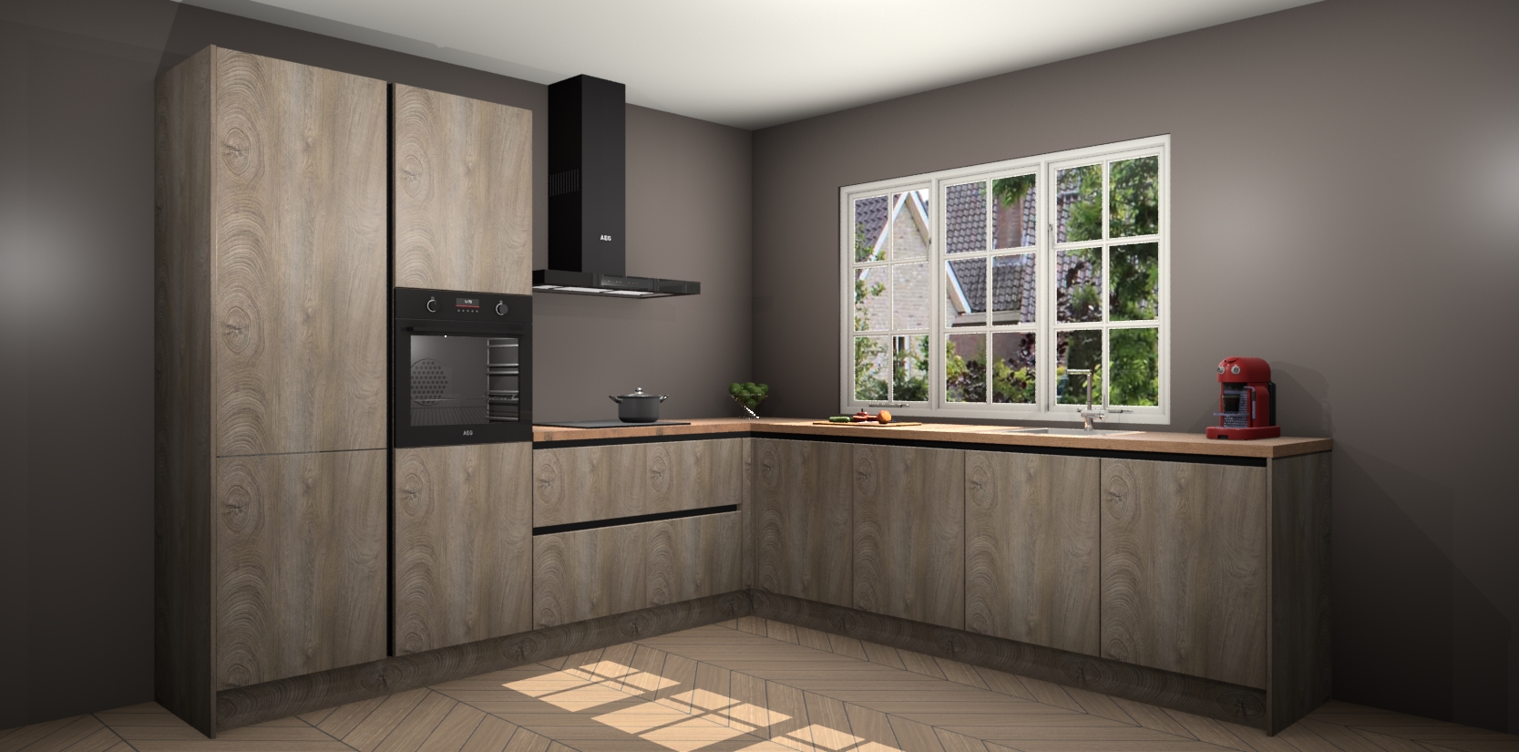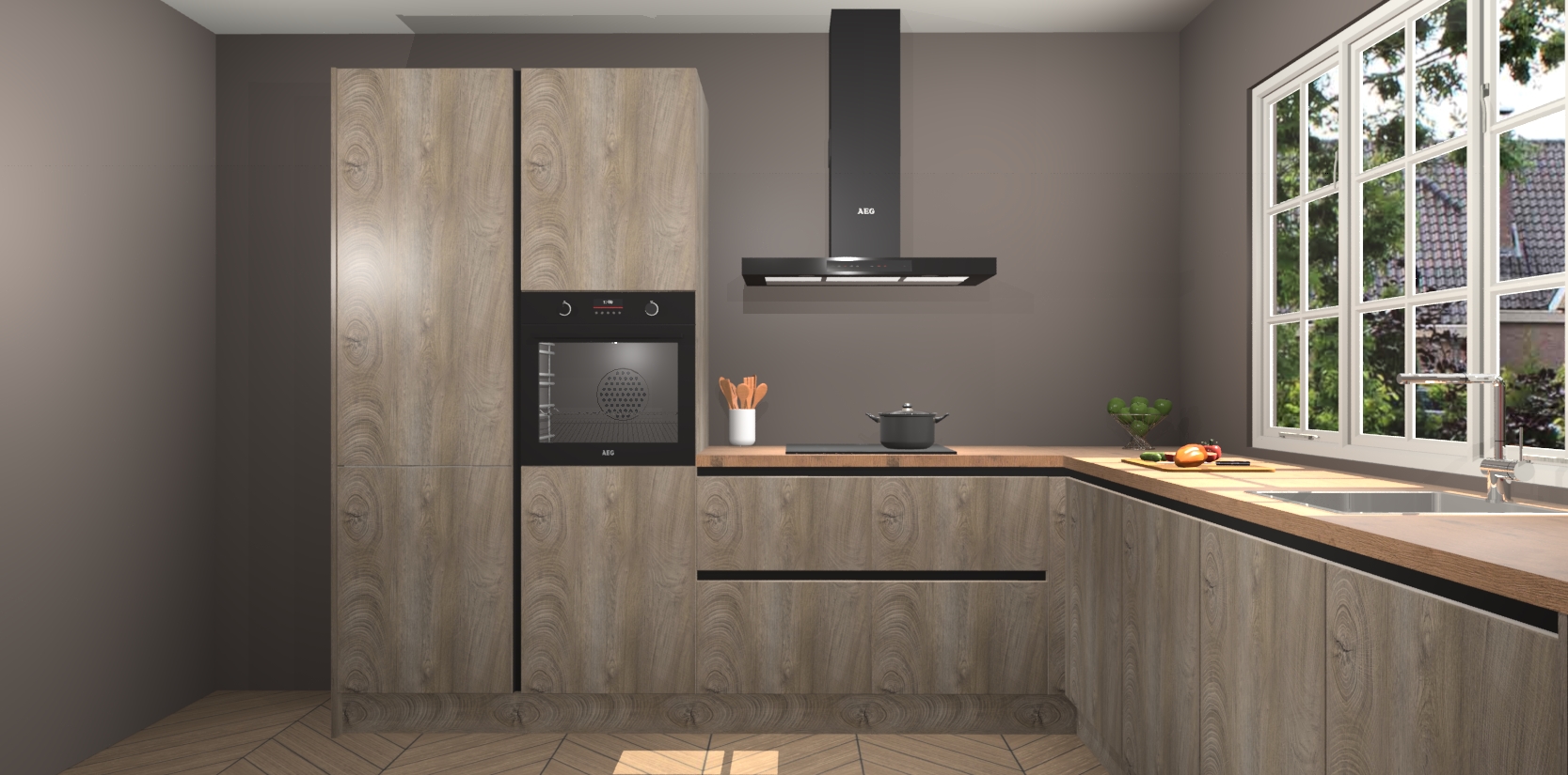 De keuken heeft veel opbergruimte, waardoor u alle ingrediënten gemakkelijk bereikbaar hebt staan. En daarnaast bevat deze volledig uitgeruste keuken ook 5 ingebouwde apparaten: een oven, inductiekookplaat, afzuigkap, vaatwasser en koelkast. Deze zijn heel eenvoudig na bestellen te upgraden naar AEG als u dit wilt. Bovendien zijn de softclose-kastdeuren ideaal; geef ze gewoon even een tikje en ze sluiten automatisch met geruisloze precisie.