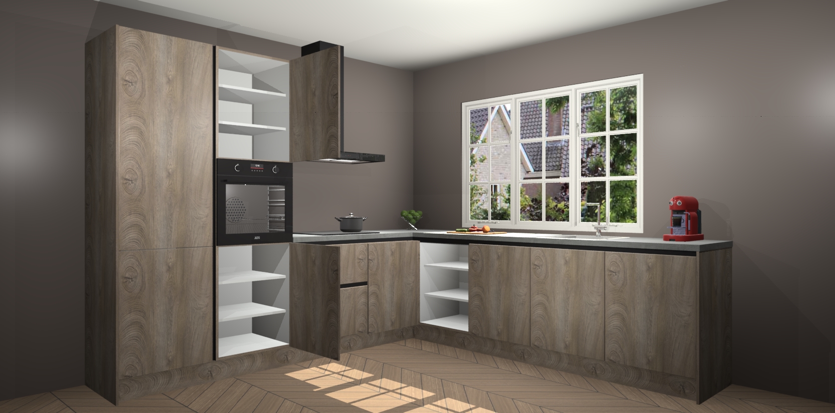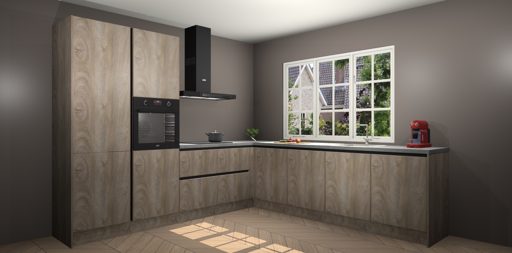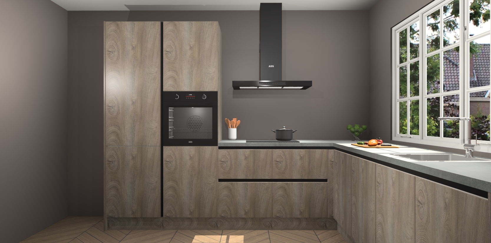 De keuken heeft veel opbergruimte, waardoor u alle ingrediënten gemakkelijk bereikbaar hebt staan. En daarnaast bevat deze volledig uitgeruste keuken ook 5 ingebouwde apparaten: een oven, inductiekookplaat, afzuigkap, vaatwasser en koelkast. Deze zijn heel eenvoudig na bestellen te upgraden naar AEG als u dit wilt. Bovendien zijn de softclose-kastdeuren ideaal; geef ze gewoon even een tikje en ze sluiten automatisch met geruisloze precisie.