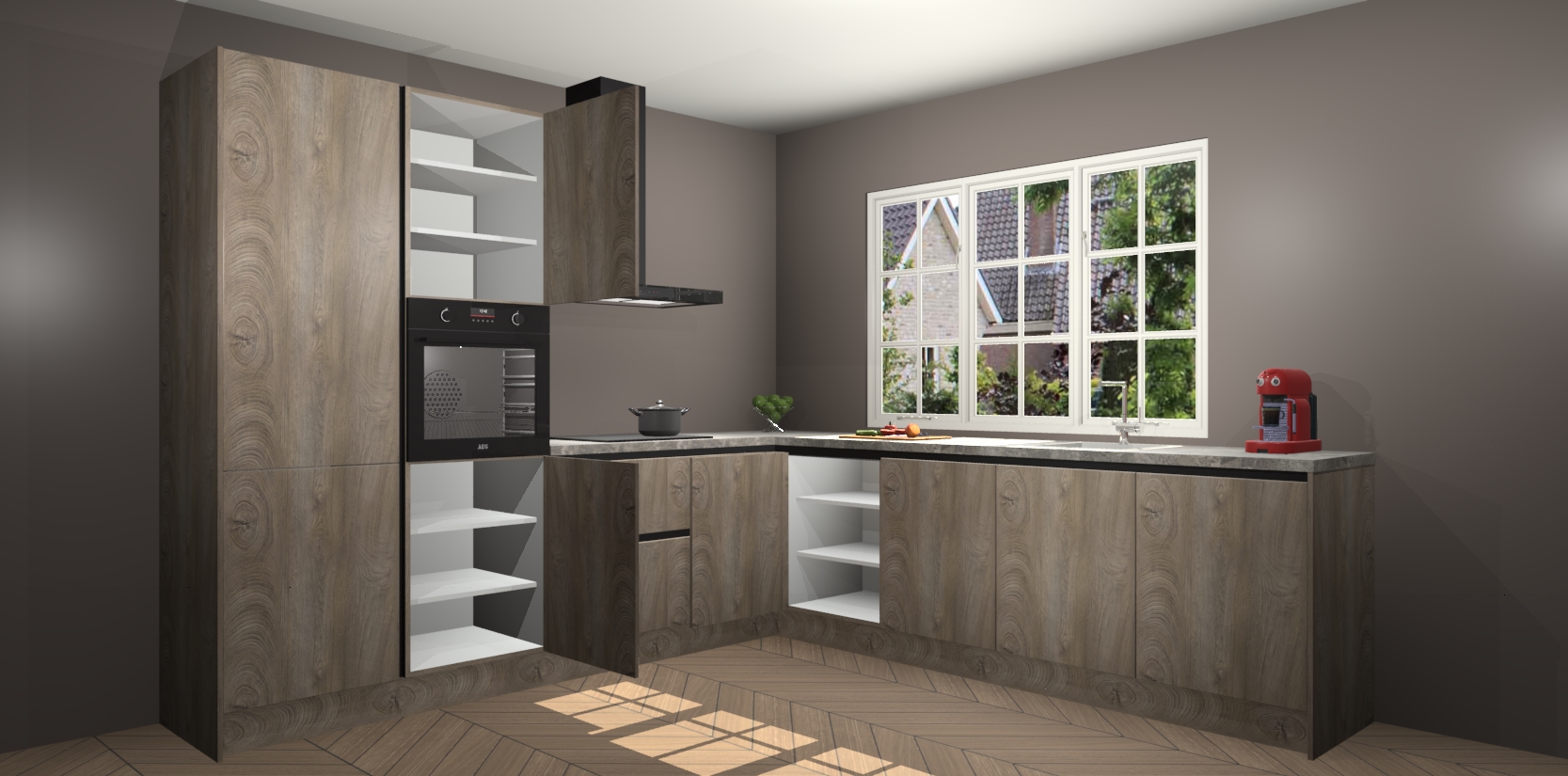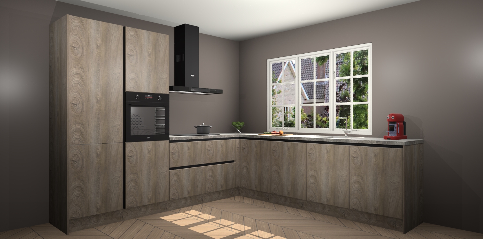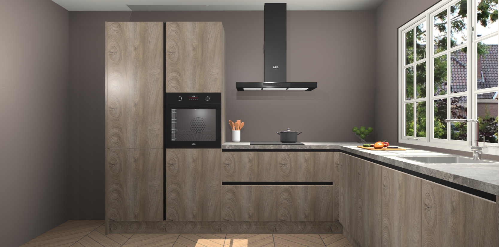 De keuken heeft veel opbergruimte, waardoor u alle ingrediënten gemakkelijk bereikbaar hebt staan. En daarnaast bevat deze volledig uitgeruste keuken ook 5 ingebouwde apparaten: een oven, inductiekookplaat, afzuigkap, vaatwasser en koelkast. Deze zijn heel eenvoudig na bestellen te upgraden naar AEG als u dit wilt. Bovendien zijn de softclose-kastdeuren ideaal; geef ze gewoon even een tikje en ze sluiten automatisch met geruisloze precisie.