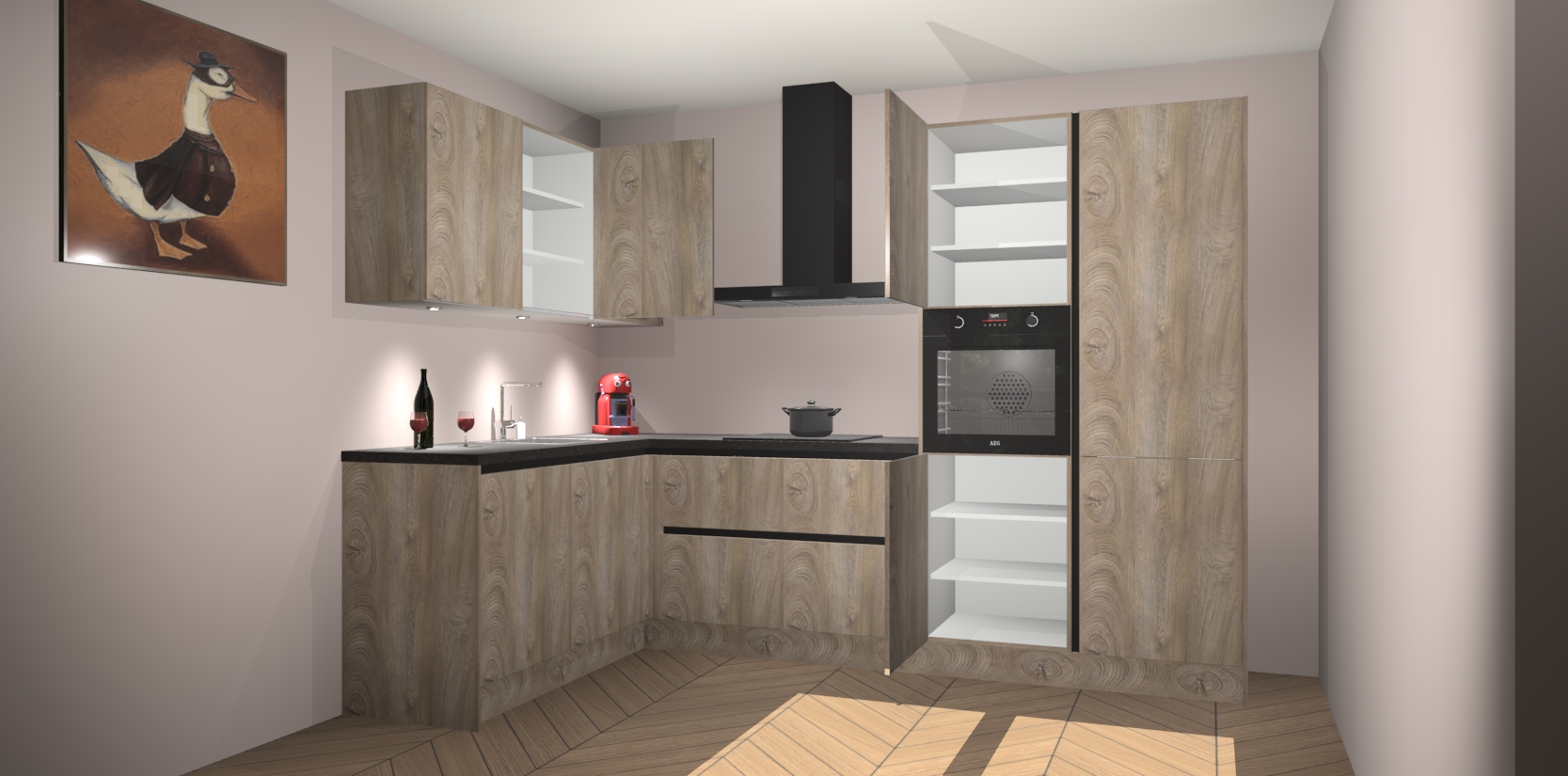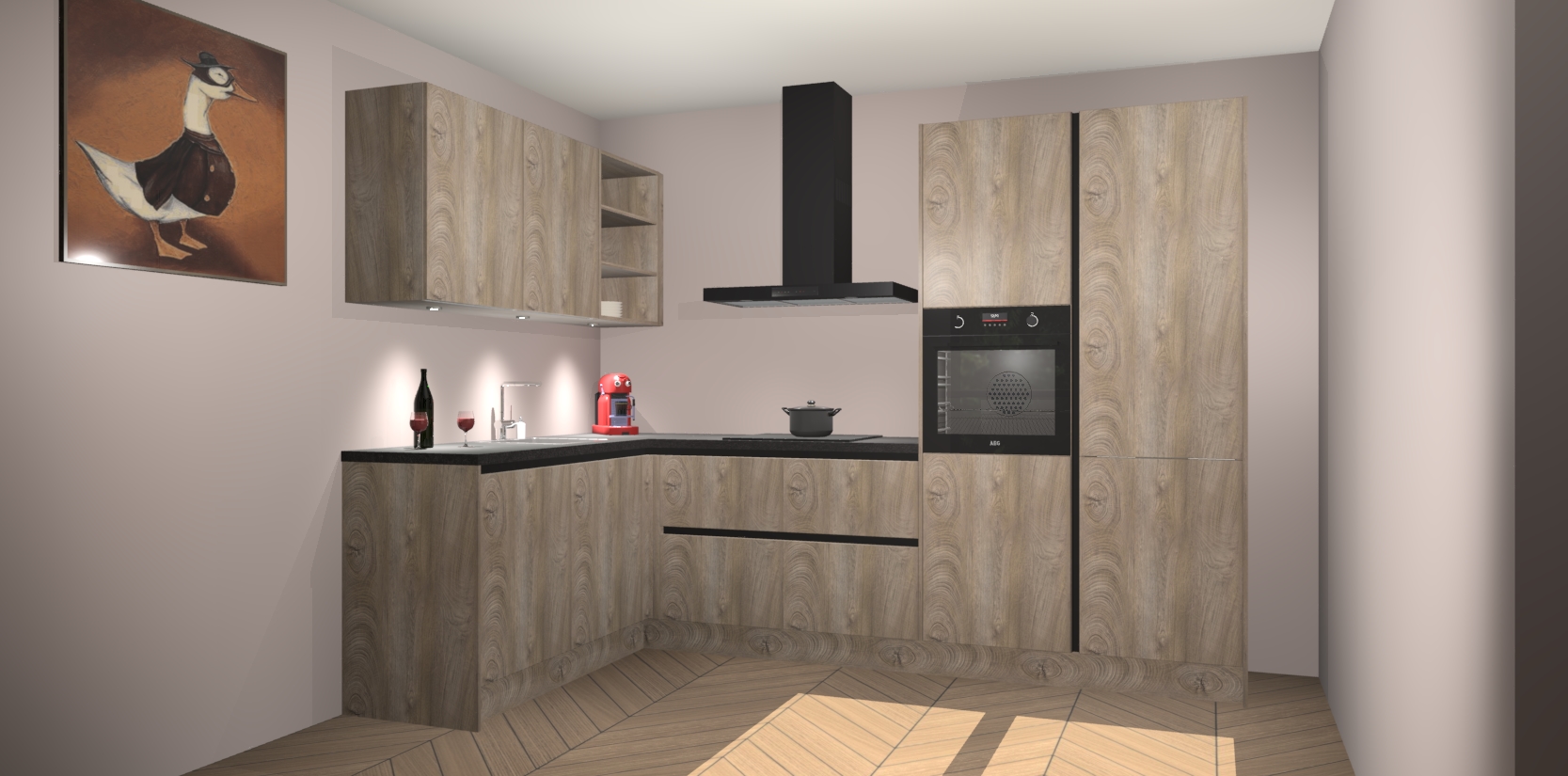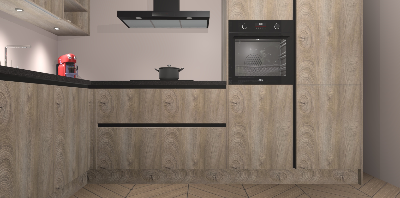 De Cantaro Eiken greeploze keuken Cognac is een adembenemend ontwerp met een modern en tijdloos uiterlijk. Deze luxe keuken straalt echt aristocratisch uit, waardoor uw koken plezieriger zal worden! Het prachtige design begint bij de hoekkeuken, wat perfect past bij elk type interieur. Bovendien bevat deze hoogwaardige set vijf inbouwapparaten - van oven tot koelkast - die via bestelling naar AEG geüpgraded kunnen worden!
