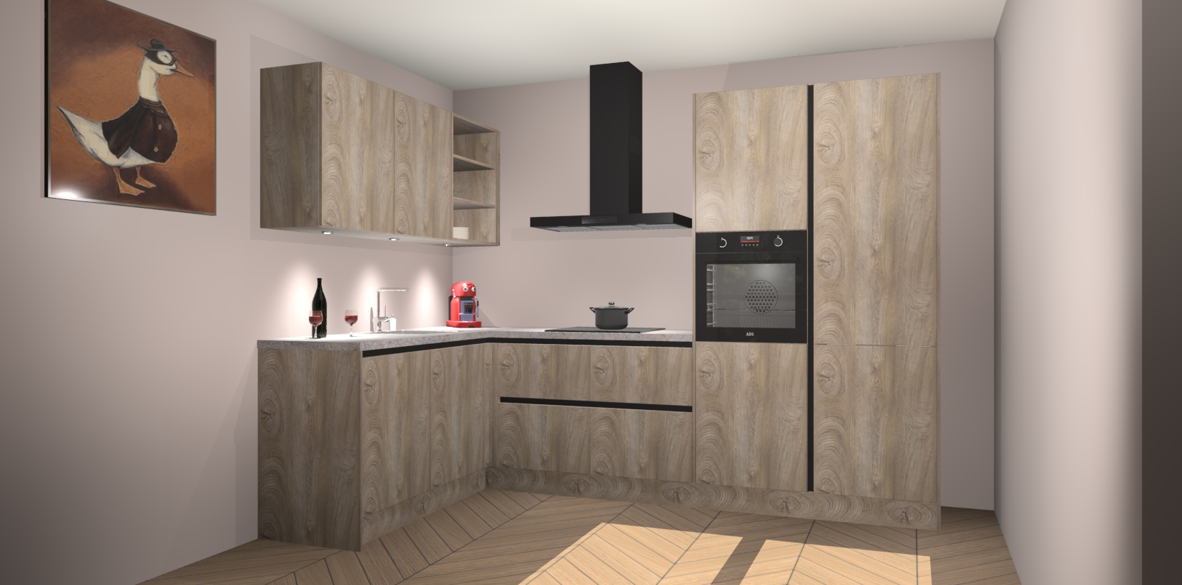 De Cantaro Eiken greeploze keuken Cognac is een adembenemend ontwerp met een modern en tijdloos uiterlijk. Deze luxe keuken straalt echt aristocratisch uit, waardoor uw koken plezieriger zal worden! Het prachtige design begint bij de hoekkeuken, wat perfect past bij elk type interieur. Bovendien bevat deze hoogwaardige set vijf inbouwapparaten - van oven tot koelkast - die via bestelling naar AEG geüpgraded kunnen worden!