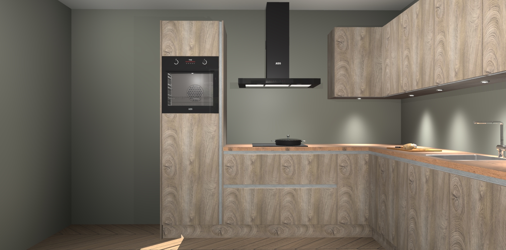 De Cantaro Eiken greeploze keuken Debar is uitgerust met vijf inbouwapparaten die elke kooktaak handig en efficiënt maken. Een oven, inductiekookplaat, afzuigkap, vaatwasser en koelkast zijn standaard, maar kunnen na bestelling eenvoudig worden geupgrade naar AEG. Profiteer vervolgens van de softclose deuren voor snelle toegang en geruisloze toegang.