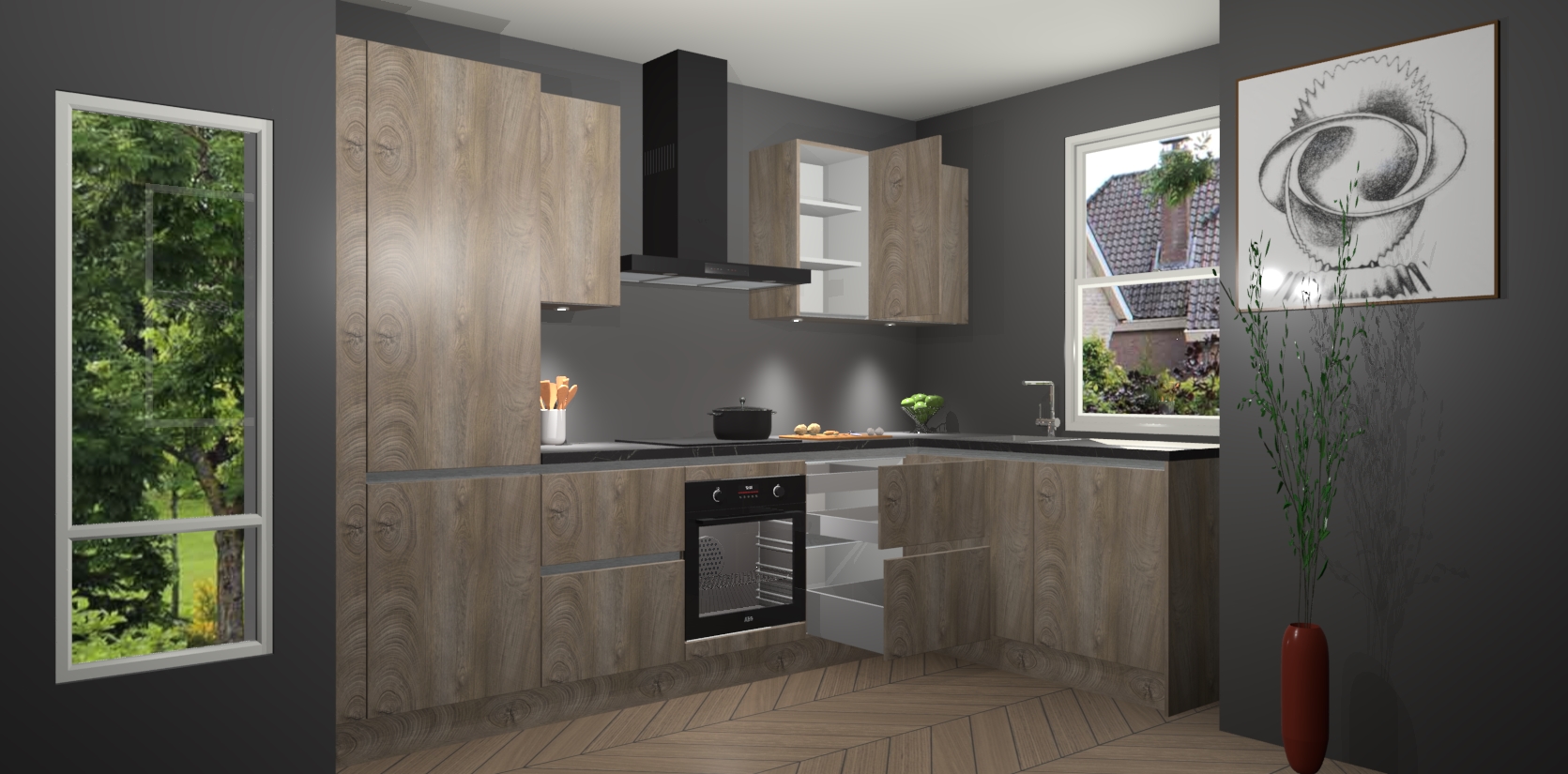 Bent u op zoek naar een moderne en tijdloze keuken die schoonheid in uw huis brengt? Zoek dan niet verder dan de Cantaro Eiken greeploze keuken Geneve - de perfecte keuken voor al uw wensen. Deze hoekkeuken biedt de hoogste Duitse kwaliteit voor een vaste lage prijs en is zeker een blikvanger in uw huis!