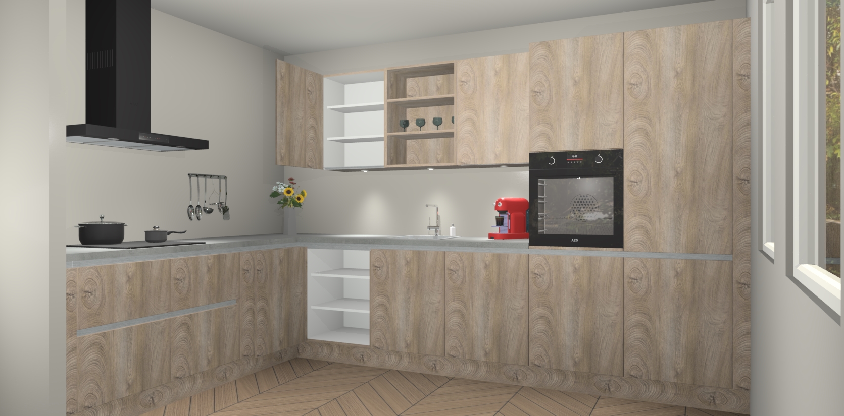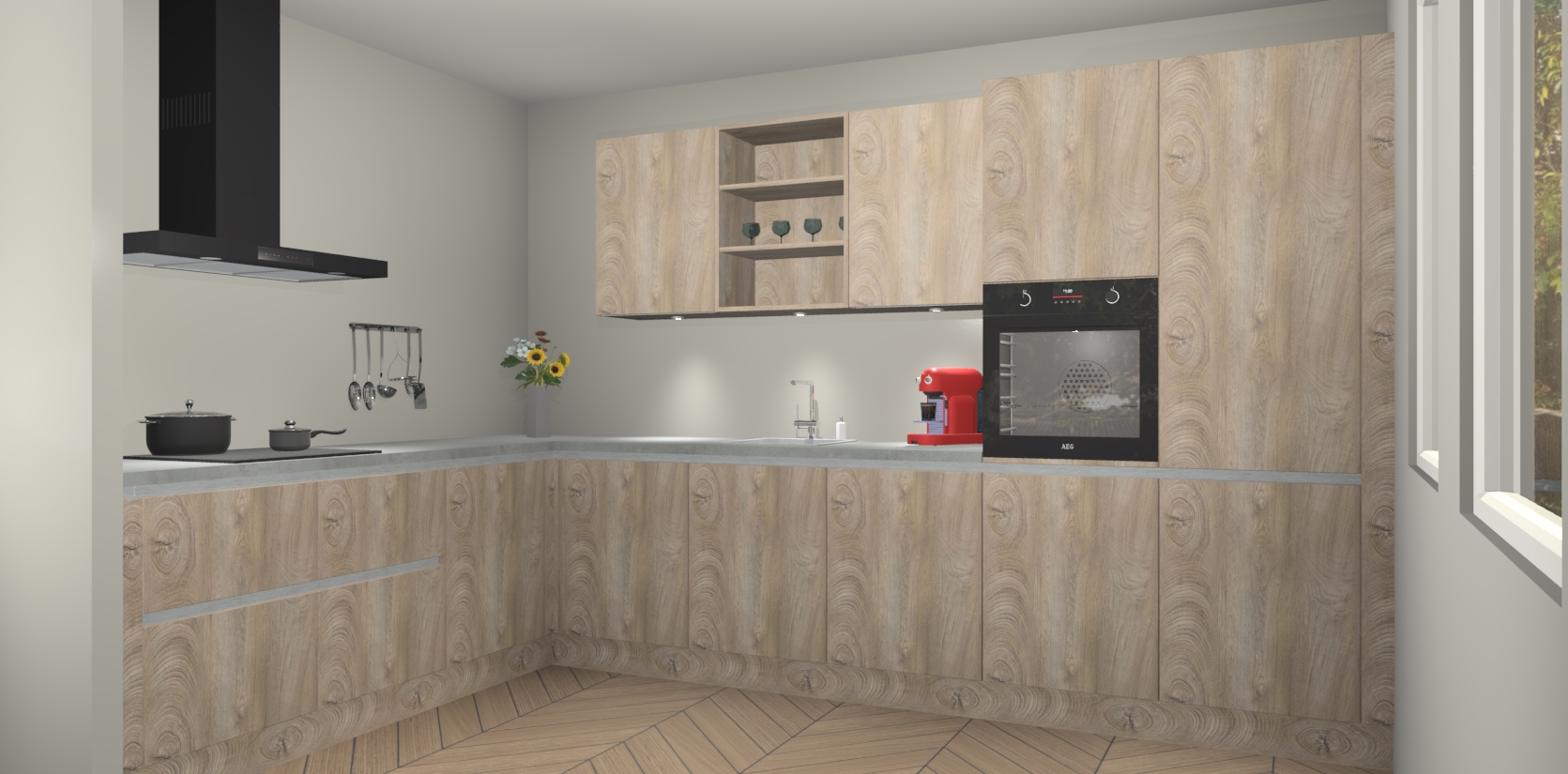 De Cantaro Eiken greeploze keuken Gotenburg is zo ontworpen dat u alle mogelijke vormen van opslagruimte kunt genieten. Bovendien heeft u meteen toegang tot vijf ingebouwde apparaten: een oven, inductiekookplaat, afzuigkap, vaatwasser en koelkast. Gewoon upgraden naar AEG na bestelling? Dit kan heel gemakkelijk worden geregeld. De deuren sluiten zacht dankzij zachtsluitende scharnieren en ze houden warmte vast terwijl ze uitzonderlijk stil blijven wanneer ze worden geopend of gesloten.