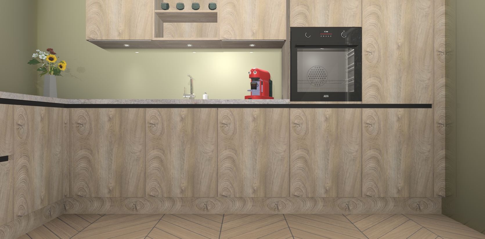 De Cantaro Eiken greeploze keuken Gotenburg is zo ontworpen dat u alle mogelijke vormen van opslagruimte kunt genieten. Bovendien heeft u meteen toegang tot vijf ingebouwde apparaten: een oven, inductiekookplaat, afzuigkap, vaatwasser en koelkast. Gewoon upgraden naar AEG na bestelling? Dit kan heel gemakkelijk worden geregeld. De deuren sluiten zacht dankzij zachtsluitende scharnieren en ze houden warmte vast terwijl ze uitzonderlijk stil blijven wanneer ze worden geopend of gesloten.