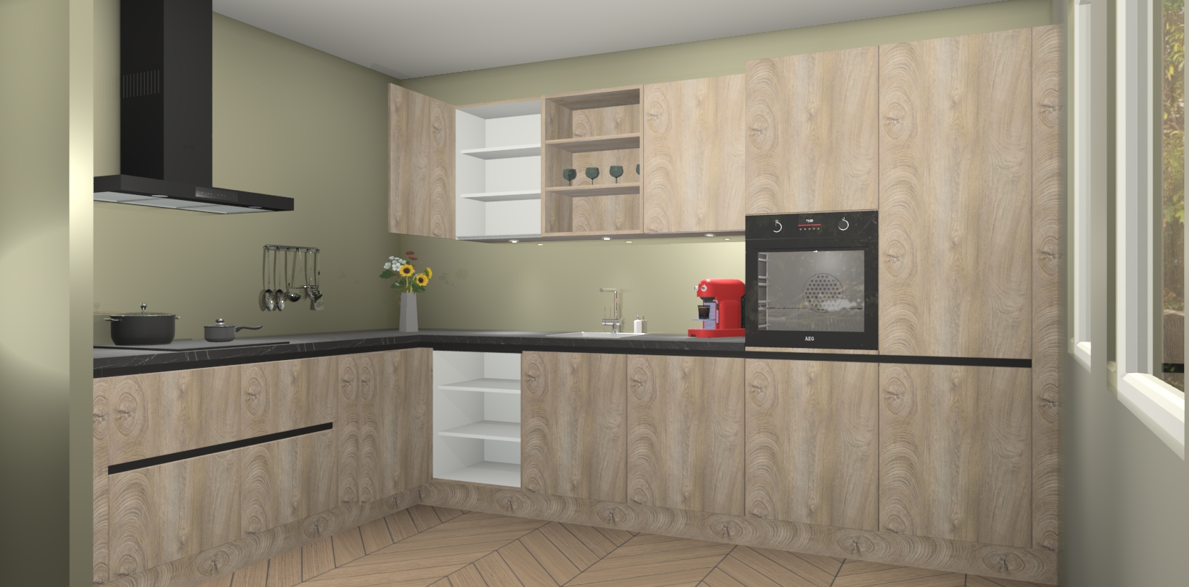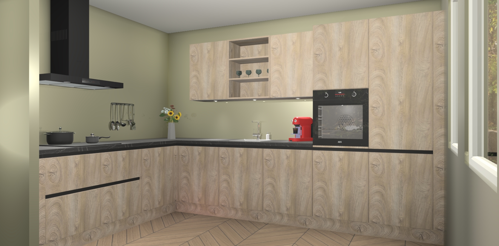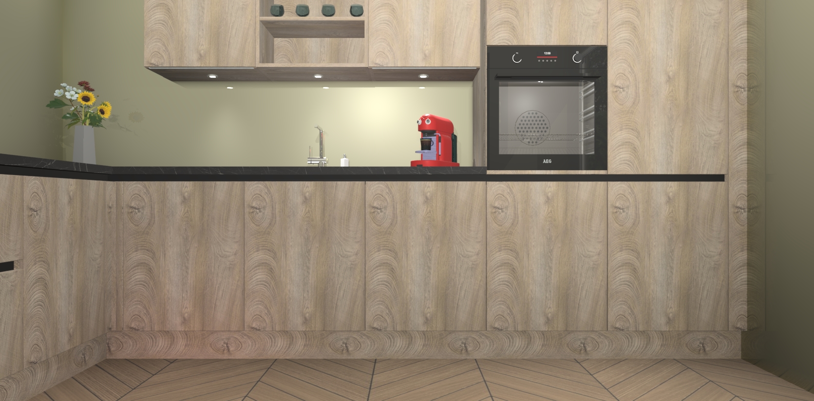 De Cantaro Eiken greeploze keuken Gotenburg is zo ontworpen dat u alle mogelijke vormen van opslagruimte kunt genieten. Bovendien heeft u meteen toegang tot vijf ingebouwde apparaten: een oven, inductiekookplaat, afzuigkap, vaatwasser en koelkast. Gewoon upgraden naar AEG na bestelling? Dit kan heel gemakkelijk worden geregeld. De deuren sluiten zacht dankzij zachtsluitende scharnieren en ze houden warmte vast terwijl ze uitzonderlijk stil blijven wanneer ze worden geopend of gesloten.