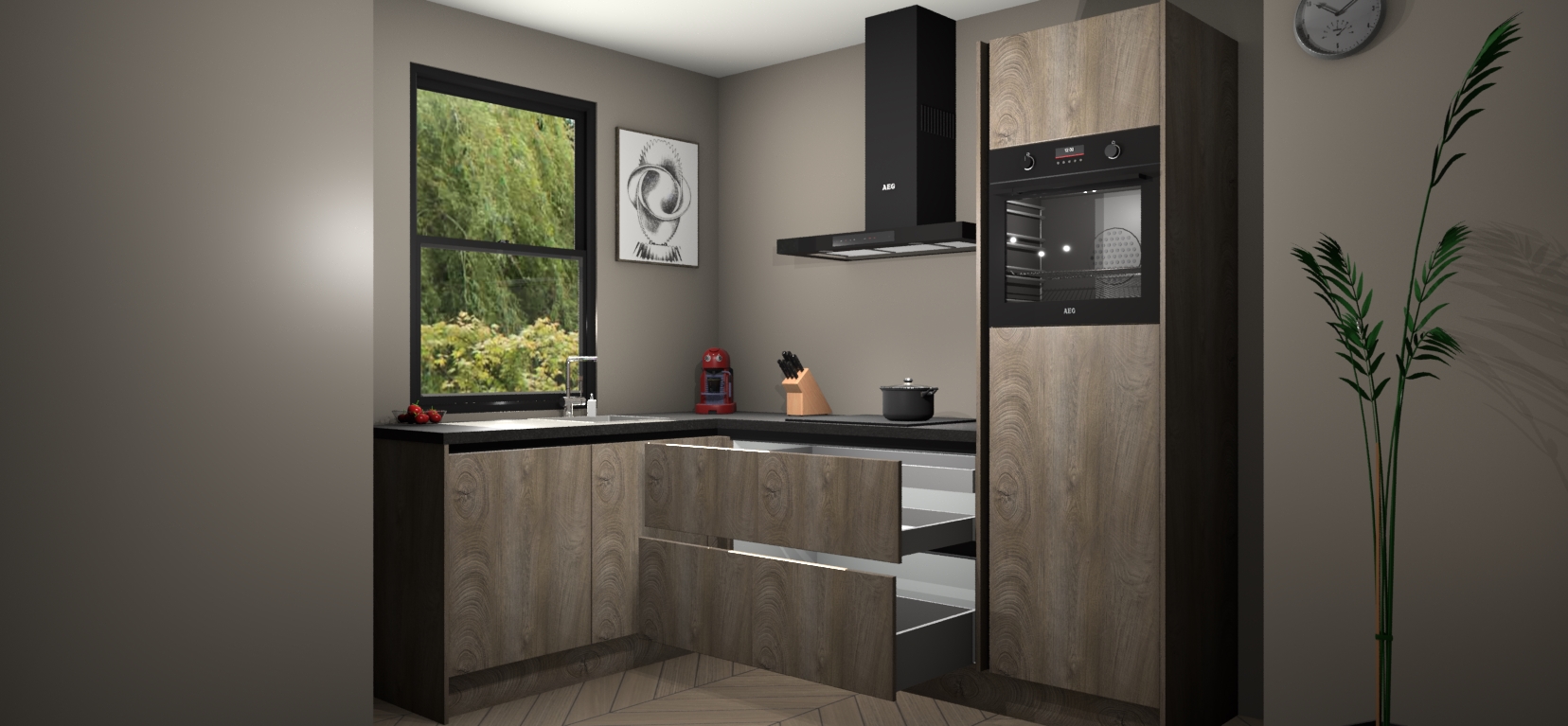Deze prachtige hoekkeuken heeft alle benodigdheden om uw droomkook- en eetruimte compleet te maken. De Cantaro Eiken kasten bieden een echo van raffinement, terwijl de 5 inbouwapparaten genoeg opties bieden voor het bereiden van heerlijke maaltijden. De oven, inductiekookplaat, afzuigkap, vaatwasser en koelkast zorgen ervoor dat u tijd in de keuken zo efficiënt mogelijk verloopt, terwijl ze ook dat extra vleugje luxe bieden.