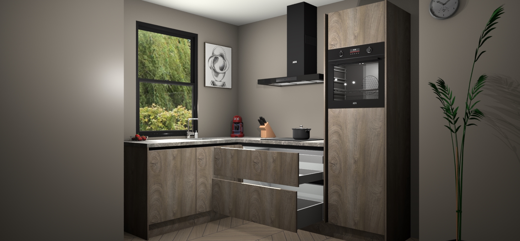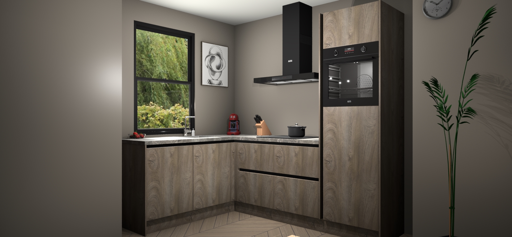 Deze prachtige hoekkeuken heeft alle benodigdheden om uw droomkook- en eetruimte compleet te maken. De Cantaro Eiken kasten bieden een echo van raffinement, terwijl de 5 inbouwapparaten genoeg opties bieden voor het bereiden van heerlijke maaltijden. De oven, inductiekookplaat, afzuigkap, vaatwasser en koelkast zorgen ervoor dat u tijd in de keuken zo efficiënt mogelijk verloopt, terwijl ze ook dat extra vleugje luxe bieden.