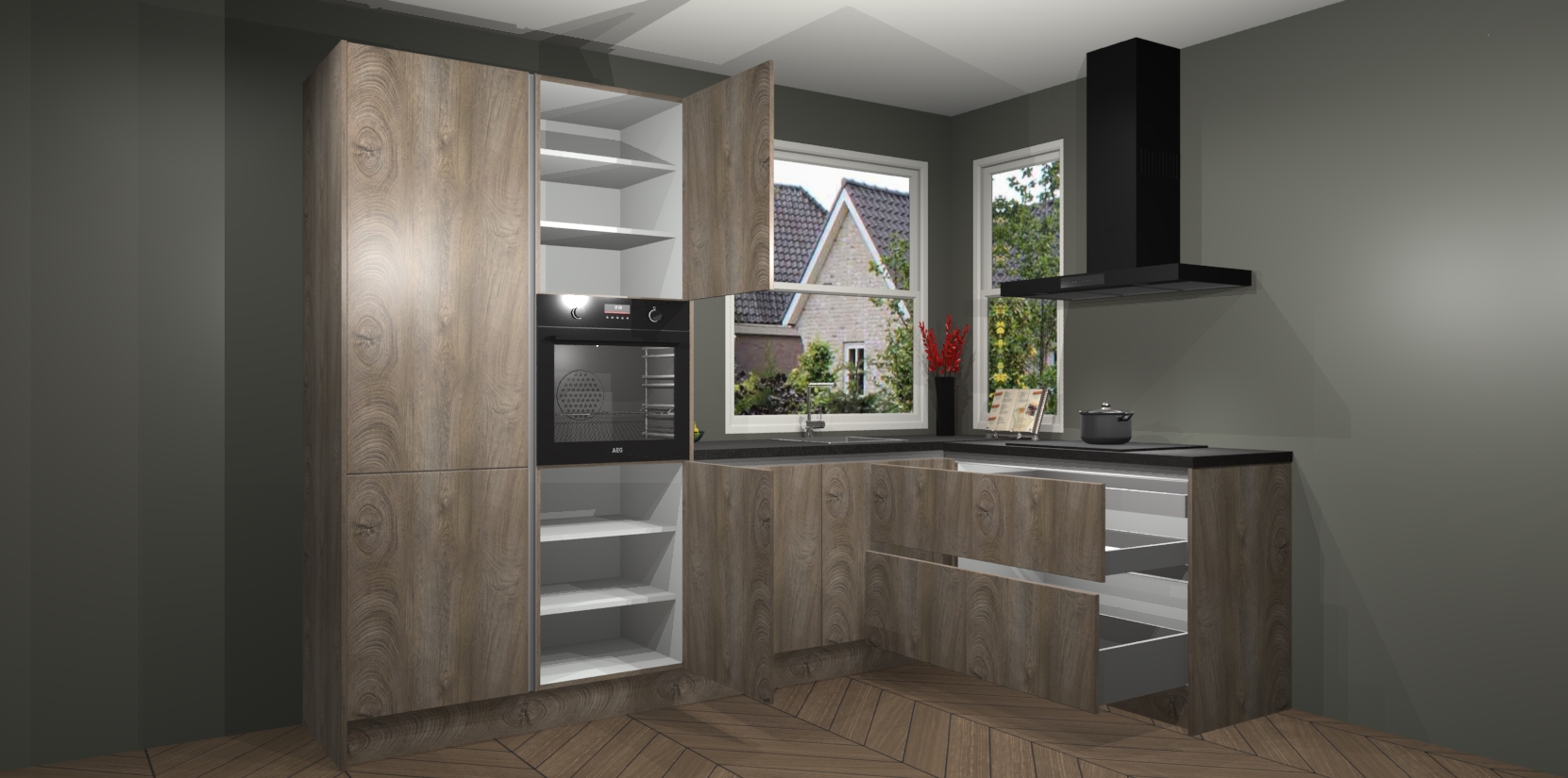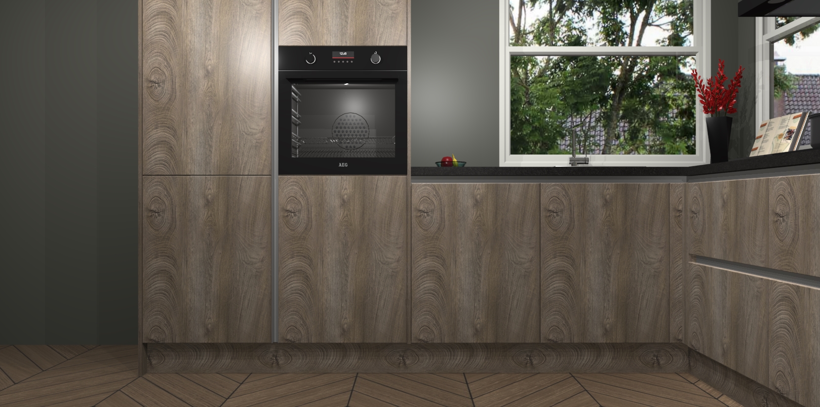 De Cantaro Eiken greeploze keuken Kotor wordt geleverd met vijf inbouwapparaten, waaronder een oven, inductiekookplaat, afzuigkap, vaatwasser en koelkast. En als u uw apparatuur wilt upgraden, kunnen we u na bestelling eenvoudig helpen overstappen naar AEG. Bovendien heeft deze keuken soft close deuren, zodat lades en kastjes geruisloos en zonder klepperen sluiten!