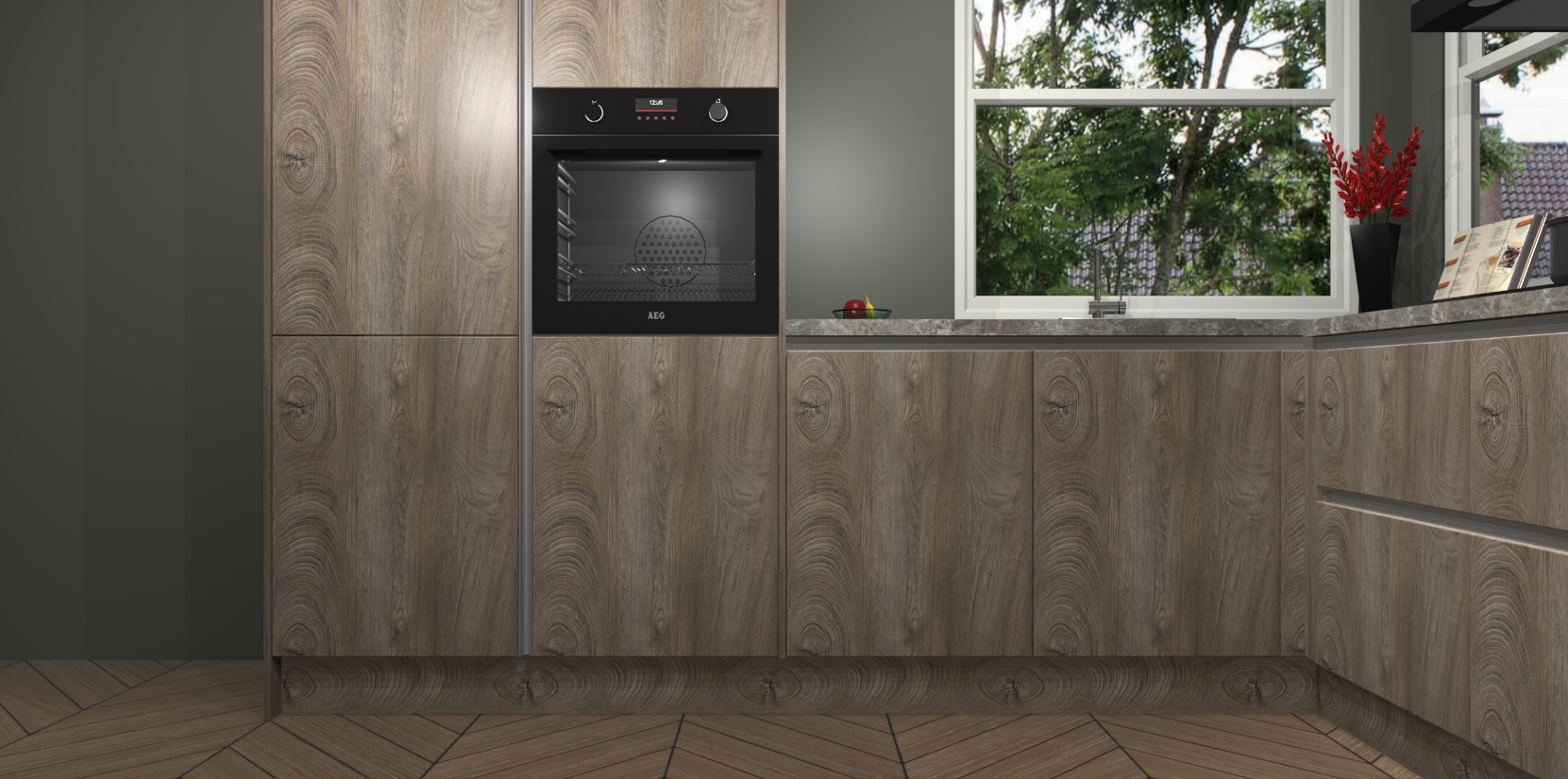 De Cantaro Eiken greeploze keuken Kotor wordt geleverd met vijf inbouwapparaten, waaronder een oven, inductiekookplaat, afzuigkap, vaatwasser en koelkast. En als u uw apparatuur wilt upgraden, kunnen we u na bestelling eenvoudig helpen overstappen naar AEG. Bovendien heeft deze keuken soft close deuren, zodat lades en kastjes geruisloos en zonder klepperen sluiten!