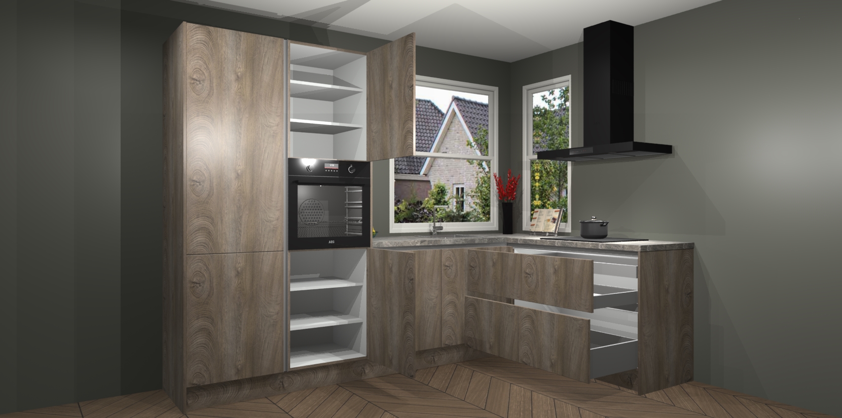 We hebben iets speciaals voor u: de Cantaro Eiken greeploze keuken Kotor. Het is een hoekkeuken die sfeer en warmte uitstraalt, en zijn hout-look geeft hem een unieke touch. Perfect voor elk huis!