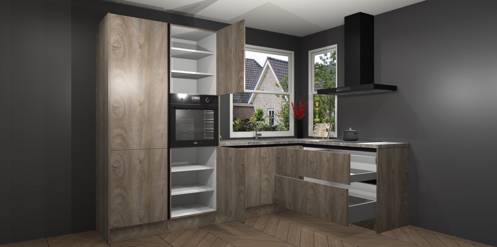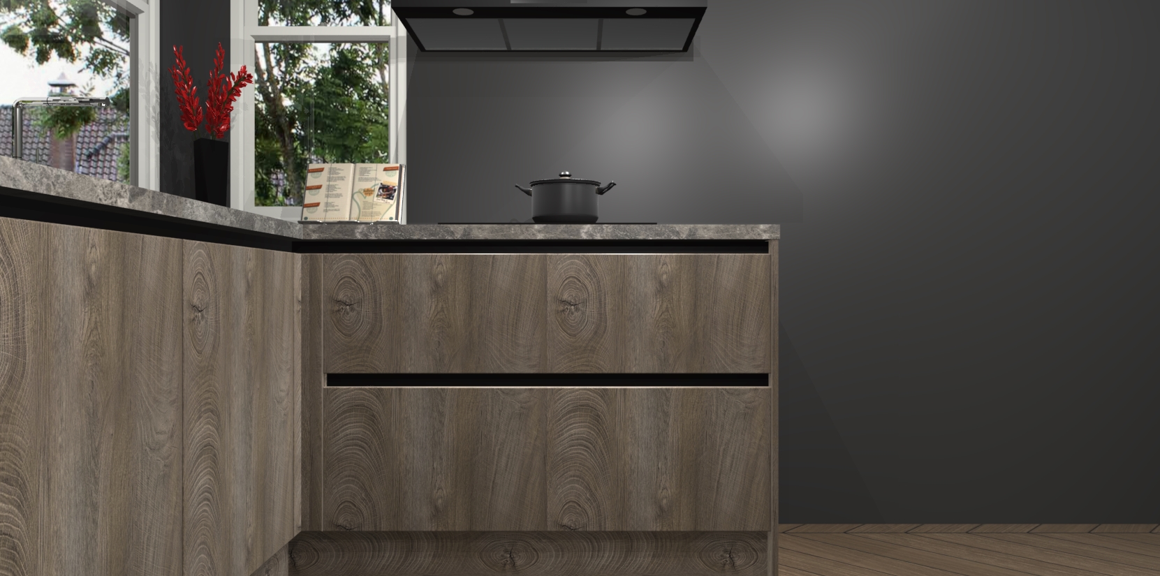 We hebben iets speciaals voor u: de Cantaro Eiken greeploze keuken Kotor. Het is een hoekkeuken die sfeer en warmte uitstraalt, en zijn hout-look geeft hem een unieke touch. Perfect voor elk huis!