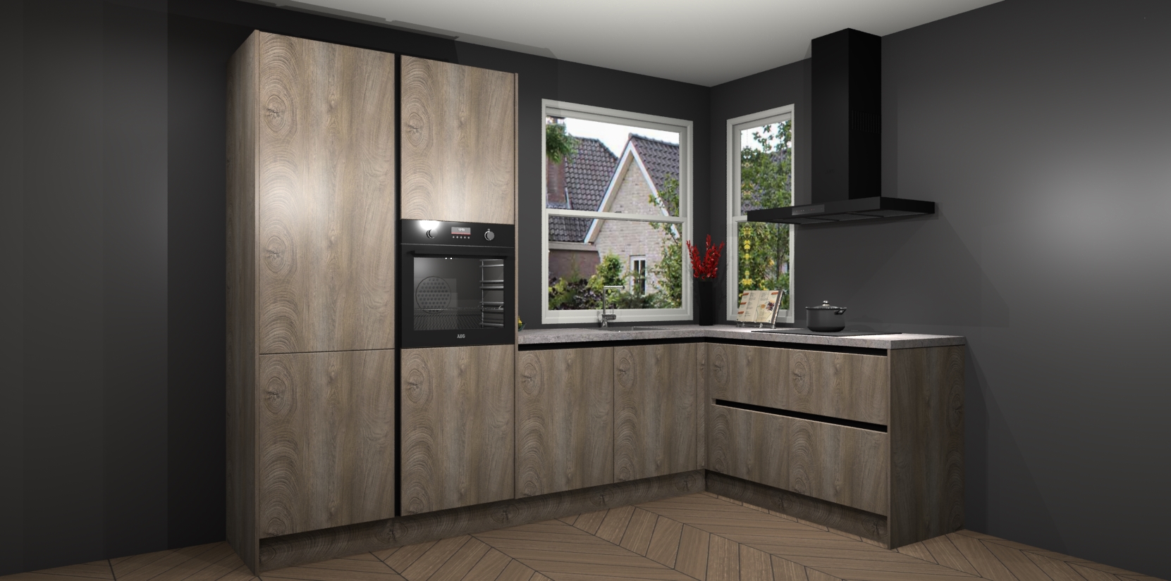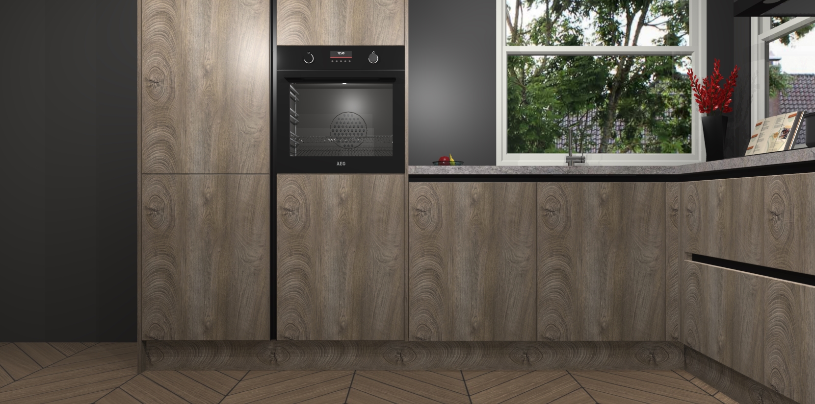 De Cantaro Eiken greeploze keuken Kotor wordt geleverd met vijf inbouwapparaten, waaronder een oven, inductiekookplaat, afzuigkap, vaatwasser en koelkast. En als u uw apparatuur wilt upgraden, kunnen we u na bestelling eenvoudig helpen overstappen naar AEG. Bovendien heeft deze keuken soft close deuren, zodat lades en kastjes geruisloos en zonder klepperen sluiten!