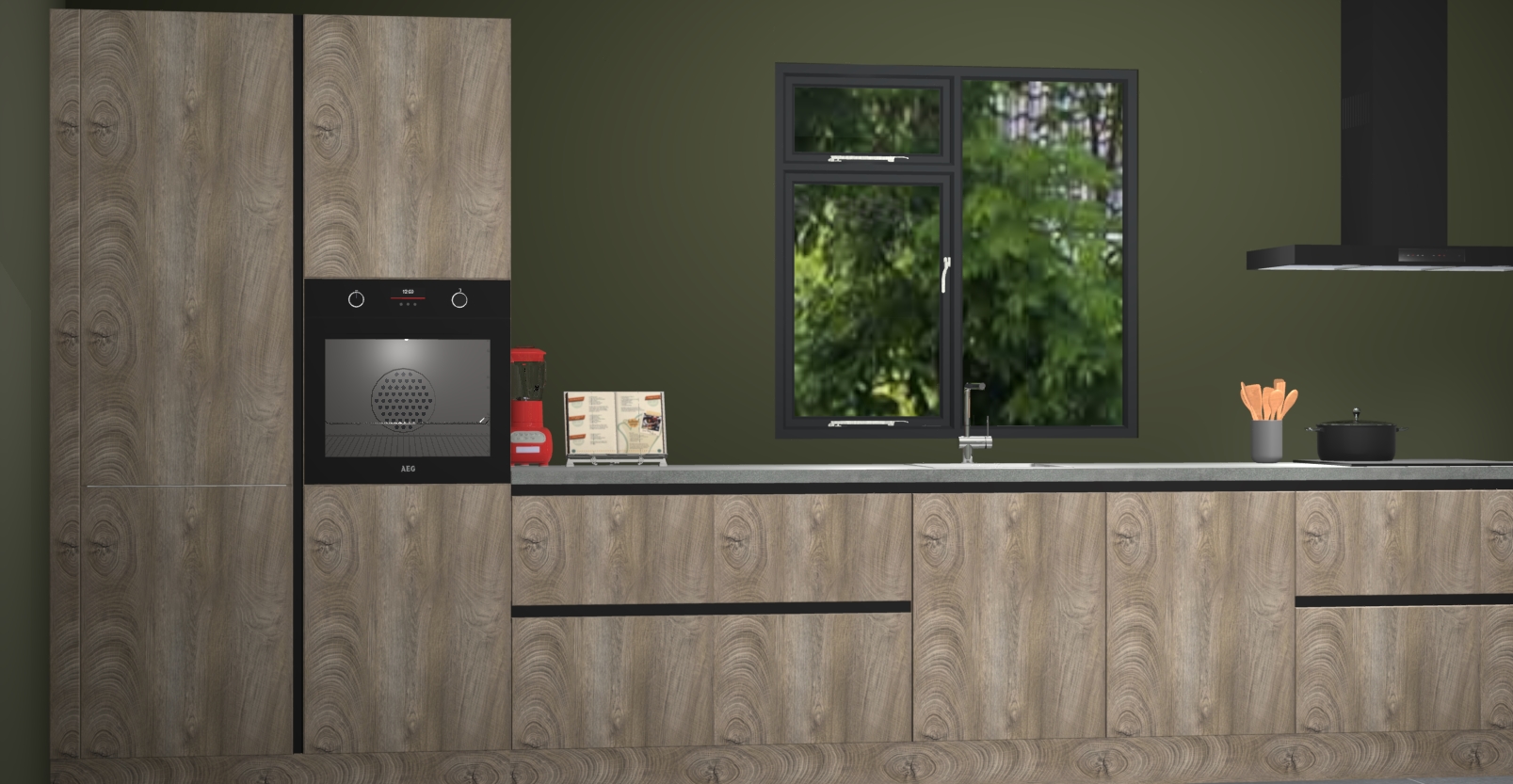 De Cantaro eiken keuken Lille wordt geleverd met vijf inbouwapparaten - een oven, inductiekookplaat, afzuigkap, vaatwasser en koelkast. Maar dat is nog niet alles! Na bestelling kunnen deze apparaten eenvoudig worden geüpgraded naar premium AEG-apparatuur. Bovendien is er zelfs de optie om de oven te vervangen door een combimagnetron of uw inductiekookplaat te vervangen door een kookplaat met geïntegreerde afzuiging.