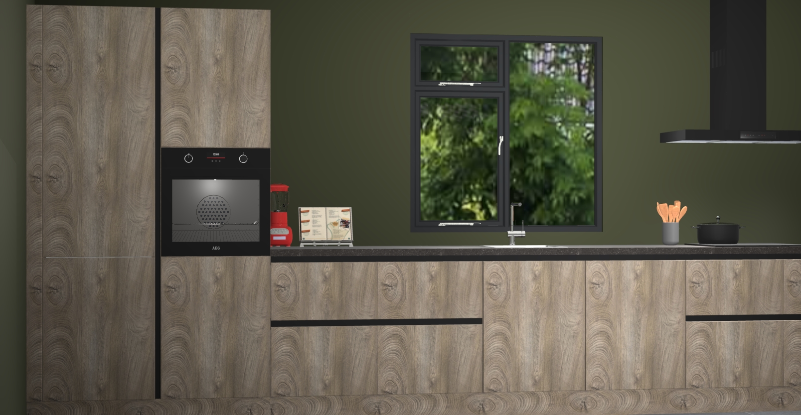 De Cantaro eiken keuken Lille wordt geleverd met vijf inbouwapparaten - een oven, inductiekookplaat, afzuigkap, vaatwasser en koelkast. Maar dat is nog niet alles! Na bestelling kunnen deze apparaten eenvoudig worden geüpgraded naar premium AEG-apparatuur. Bovendien is er zelfs de optie om de oven te vervangen door een combimagnetron of uw inductiekookplaat te vervangen door een kookplaat met geïntegreerde afzuiging.