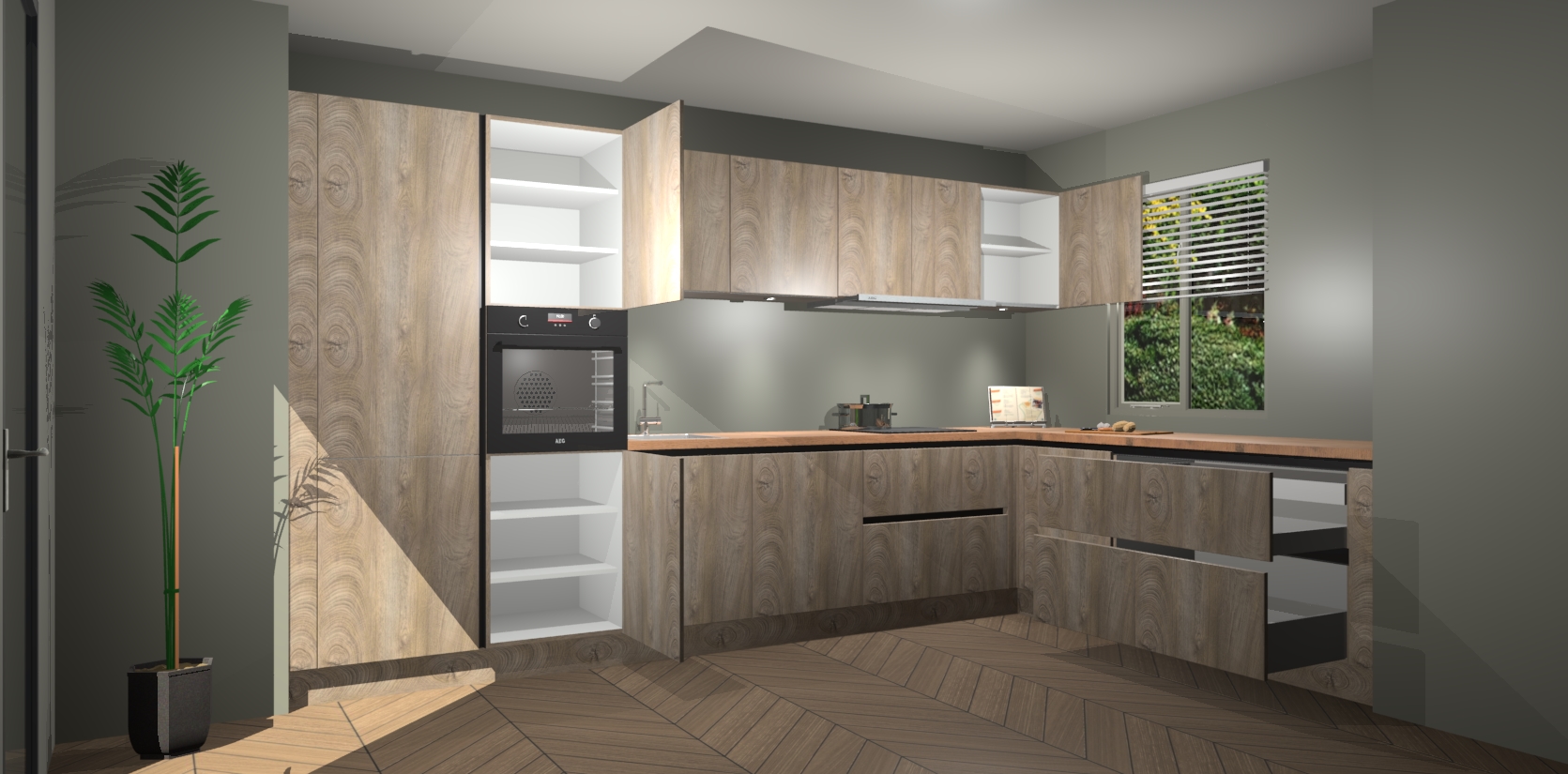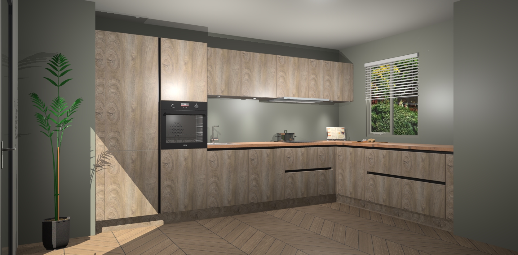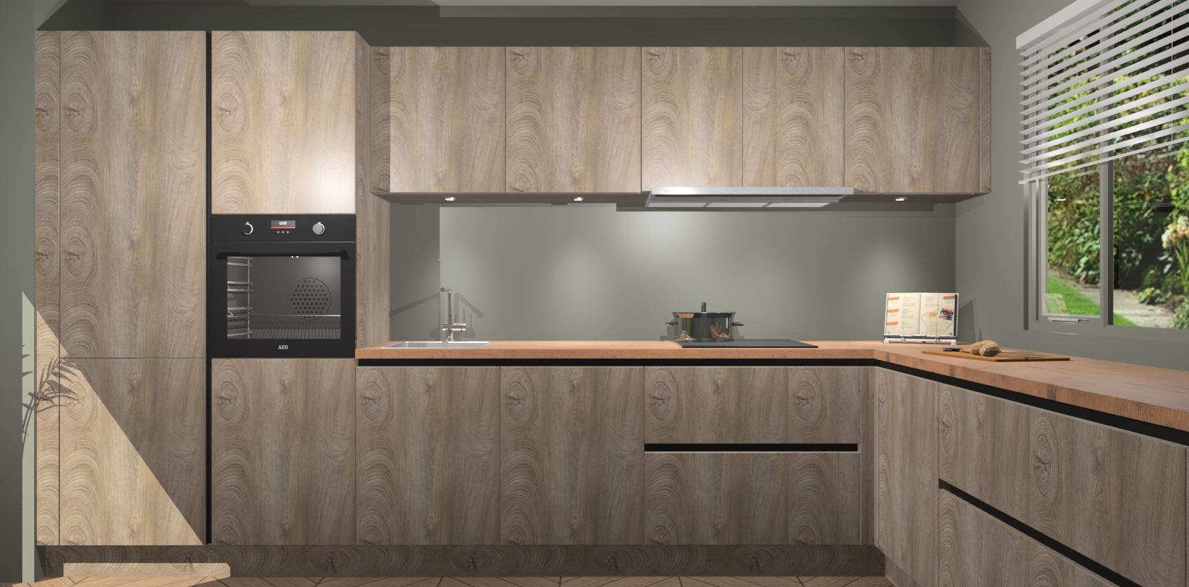 Verwelkom de natuurlijke warmte van de Cantaro Eiken greeploze keuken Petten in uw huis. Deze prachtige hoekkeuken met zijn moderne design en warme houten look geeft u meer dan genoeg opbergruimte om uw comfortabel te voelen in uw keuken. Geniet van soft-close deuren die al uw gasten het gevoel zullen geven dat ze zich in een luxueuze ruimte bevinden.