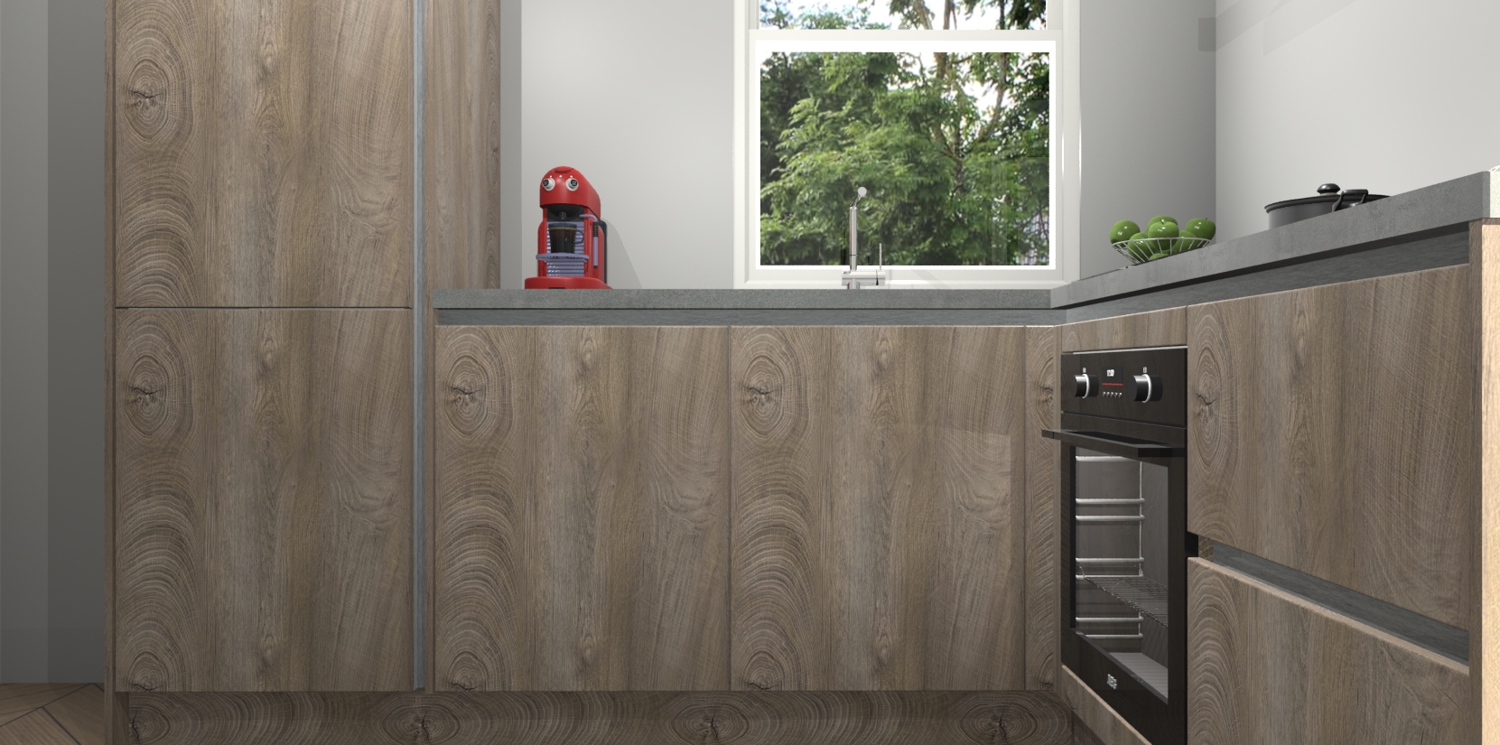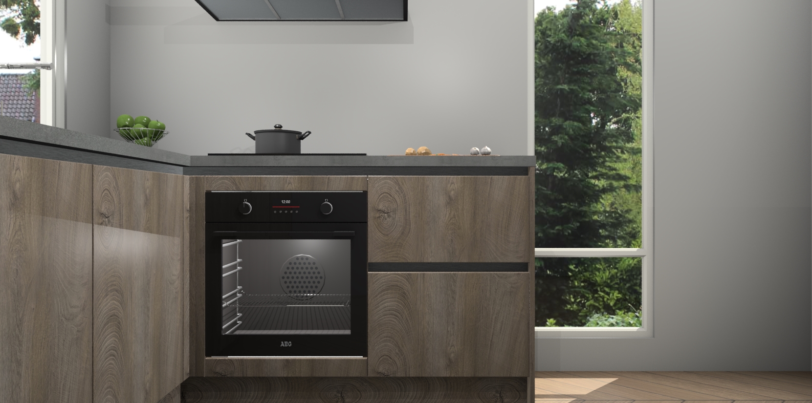 De Cantaro Eiken greeploze keuken Phuket heeft alles wat u maar kunt wensen. Niet alleen zijn er softclose deuren, maar ook 5 ingebouwde apparaten: een oven, inductiekookplaat, afzuigkap, vaatwasser en koelkast - waarbij u later gemakkelijk naar het AEG merk, van inductiekookplaat naar kookplaat met geïntegreerde afzuiging of van oven naar combimagnetron kunt upgraden. Dat alles tegen een vast laag tarief! Bovendien geeft de Cantaro Eiken greeploze keuken Phuket supersnelle levering van 7 weken. Echt iets voor u als u er niet op wilt wachten om het resultaat te zien in eigen keuken!