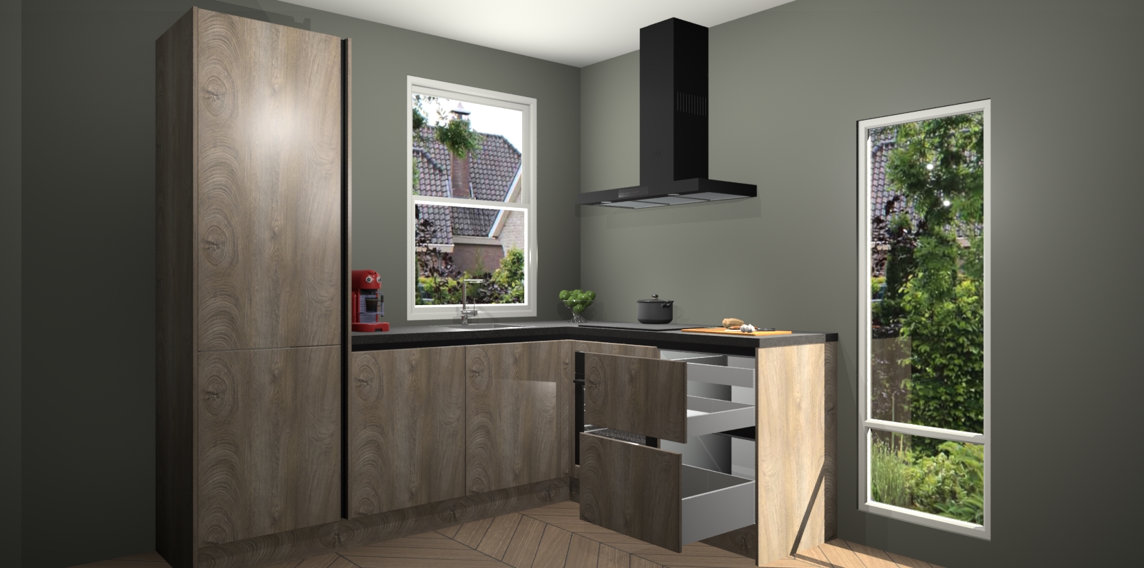 De prachtige Cantaro Eiken greeploze keuken Phuket is de perfecte keuze als u op zoek bent naar een moderne hoekkeuken met alle luxe en comfort die u kunt verwachten! De uitstraling in het houtlook-design draagt bij aan de warme sfeer die u nu al voelt wanneer u er naar kijkt. Heeft u genoeg van ouderwetse keukens? Probeer dan direct deze moderne, mooie hoekkeukens en laat iedereen verbluft achter!