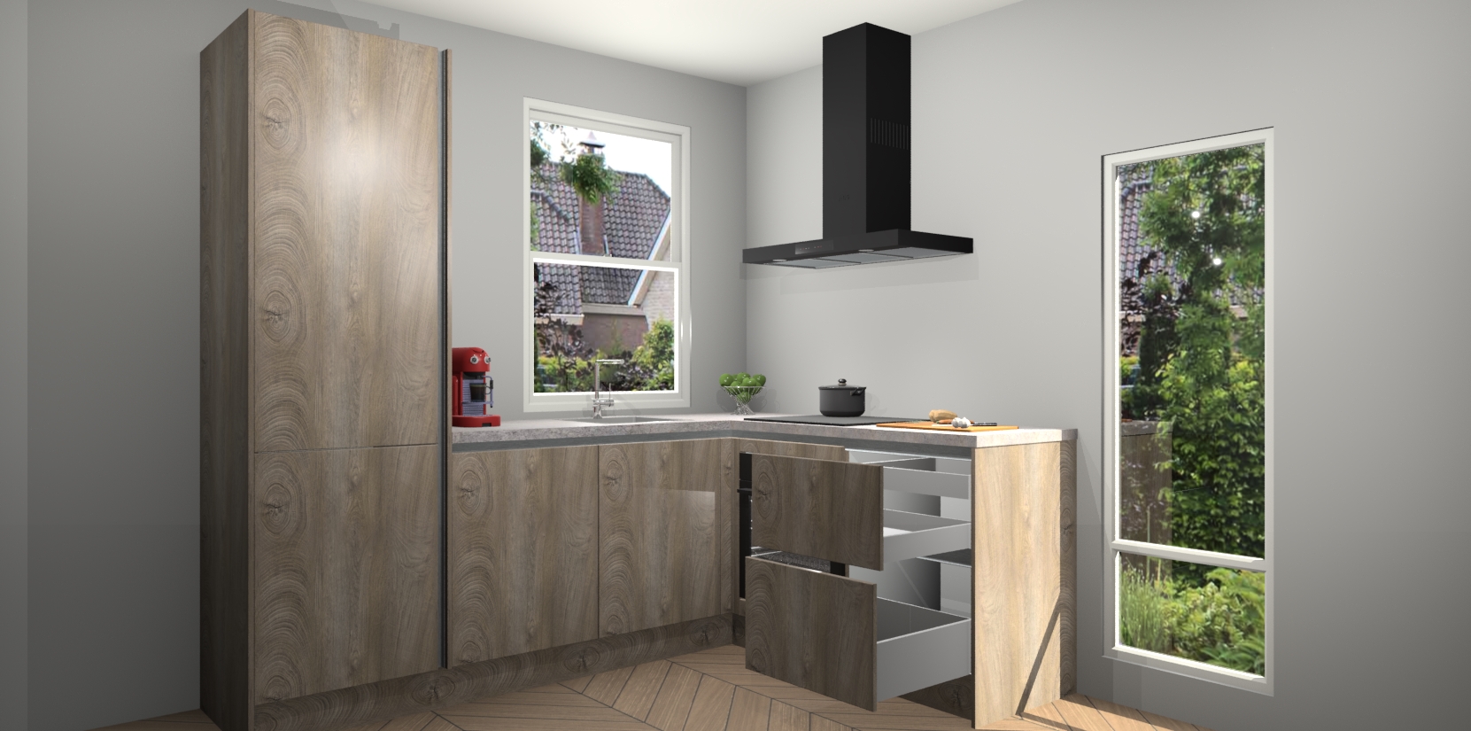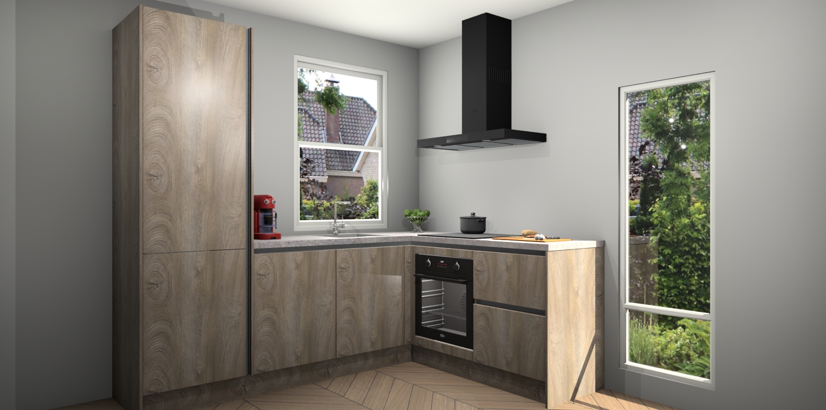 De prachtige Cantaro Eiken greeploze keuken Phuket is de perfecte keuze als u op zoek bent naar een moderne hoekkeuken met alle luxe en comfort die u kunt verwachten! De uitstraling in het houtlook-design draagt bij aan de warme sfeer die u nu al voelt wanneer u er naar kijkt. Heeft u genoeg van ouderwetse keukens? Probeer dan direct deze moderne, mooie hoekkeukens en laat iedereen verbluft achter!