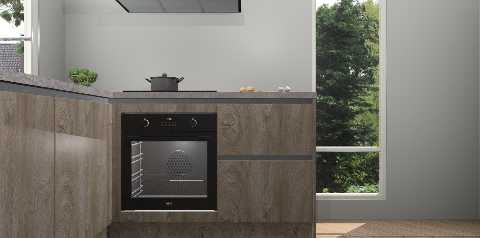 De Cantaro Eiken greeploze keuken Phuket heeft alles wat u maar kunt wensen. Niet alleen zijn er softclose deuren, maar ook 5 ingebouwde apparaten: een oven, inductiekookplaat, afzuigkap, vaatwasser en koelkast - waarbij u later gemakkelijk naar het AEG merk, van inductiekookplaat naar kookplaat met geïntegreerde afzuiging of van oven naar combimagnetron kunt upgraden. Dat alles tegen een vast laag tarief! Bovendien geeft de Cantaro Eiken greeploze  keuken Phuket supersnelle levering van 7 weken. Echt iets voor u als u er niet op wilt wachten om het resultaat te zien in eigen keuken!