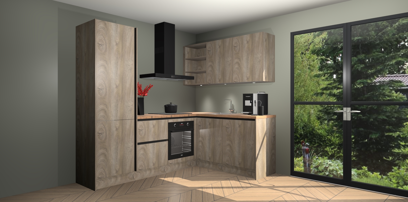 Wauw, dit is de Cantaro Eiken greeploze keuken Pilsen! U kunt gerust zeggen dat u elegantie combineert met functionaliteit met deze keuken. Met een modern en chique ontwerp is de keuken precies wat u nodig heeft om uw ruimte te verfraaien. De binnenzijde van de kasten is in dezelfde donkere kleur als de buitenzijde voor een uniforme look, compleet met softclose-kasten die stil sluiten.