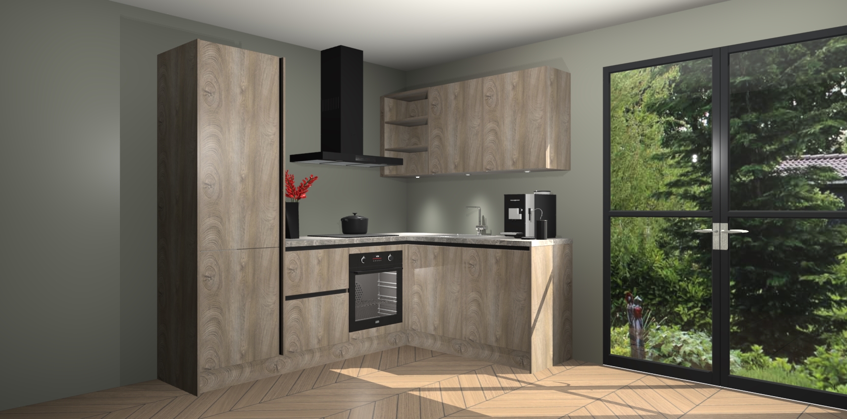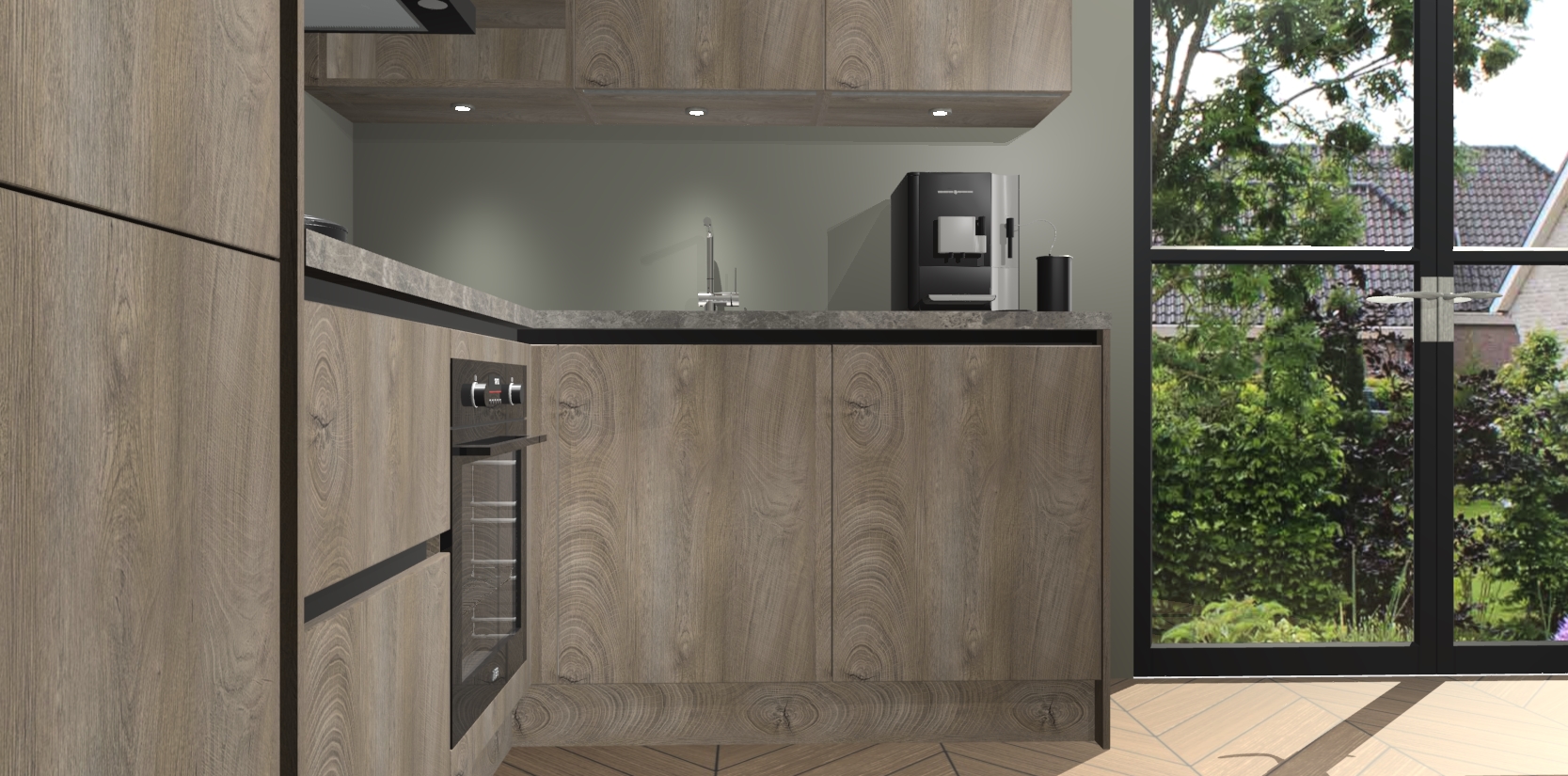 Wauw, dit is de Cantaro Eiken greeploze keuken Pilsen! U kunt gerust zeggen dat u elegantie combineert met functionaliteit met deze keuken. Met een modern en chique ontwerp is de keuken precies wat u nodig heeft om uw ruimte te verfraaien. De binnenzijde van de kasten is in dezelfde donkere kleur als de buitenzijde voor een uniforme look, compleet met softclose-kasten die stil sluiten.