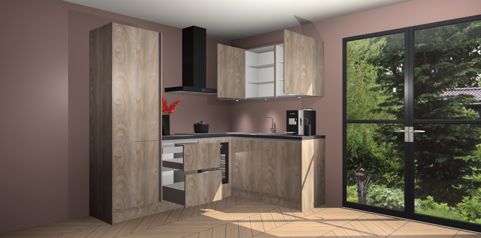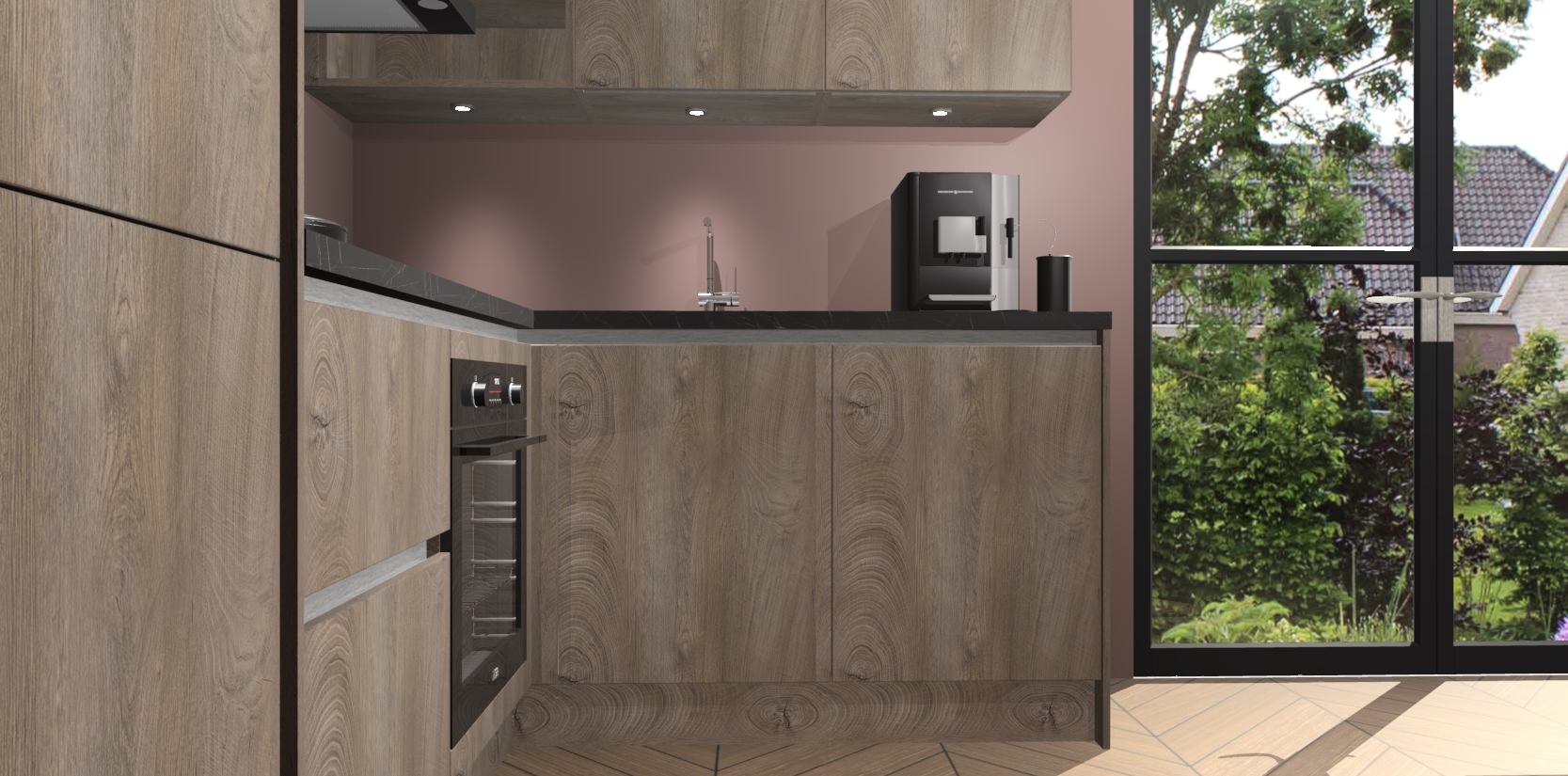Wauw, dit is de Cantaro Eiken greeploze keuken Pilsen! U kunt gerust zeggen dat u elegantie combineert met functionaliteit met deze keuken. Met een modern en chique ontwerp is de keuken precies wat u nodig heeft om uw ruimte te verfraaien. De binnenzijde van de kasten is in dezelfde donkere kleur als de buitenzijde voor een uniforme look, compleet met softclose-kasten die stil sluiten.