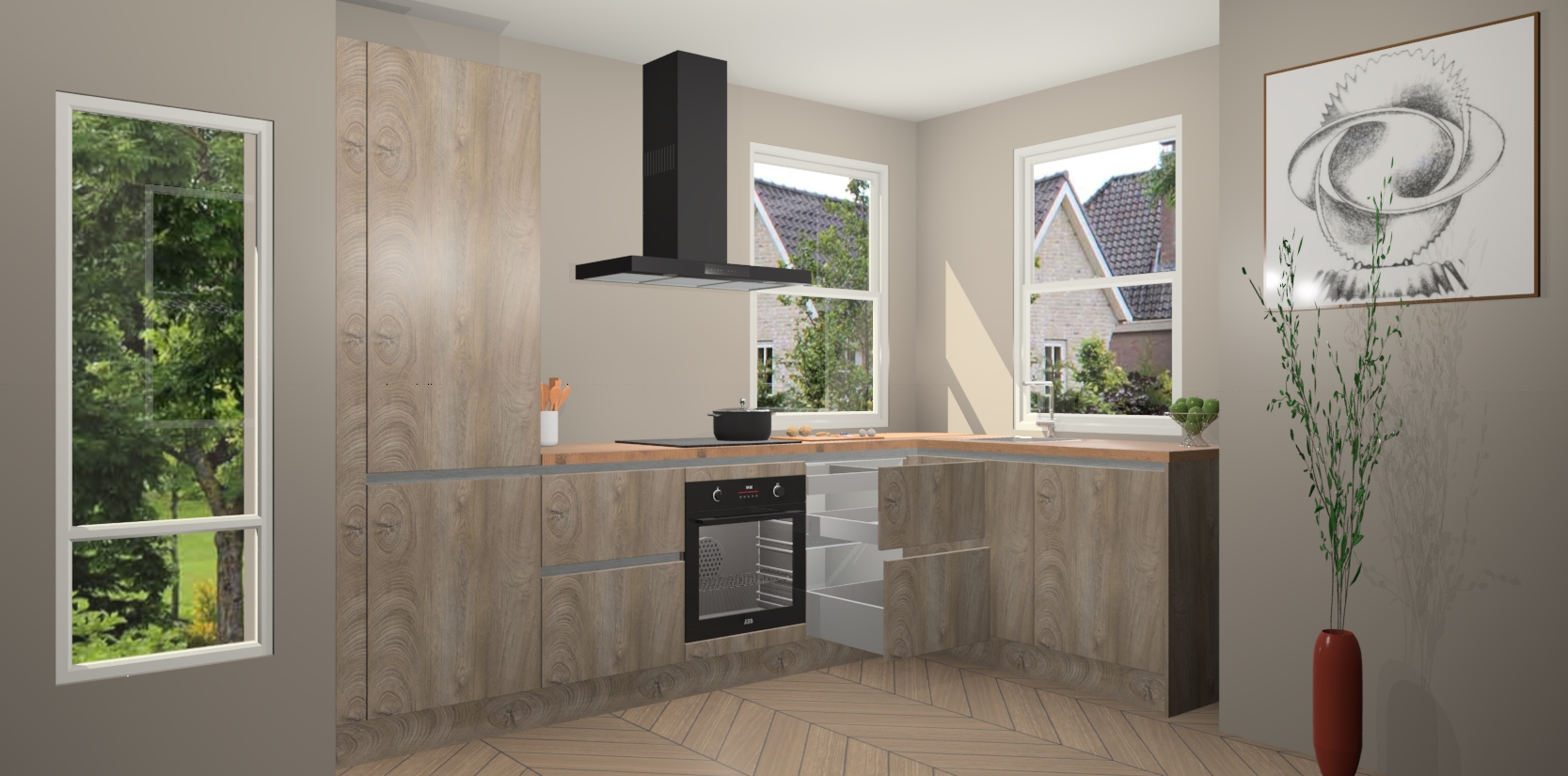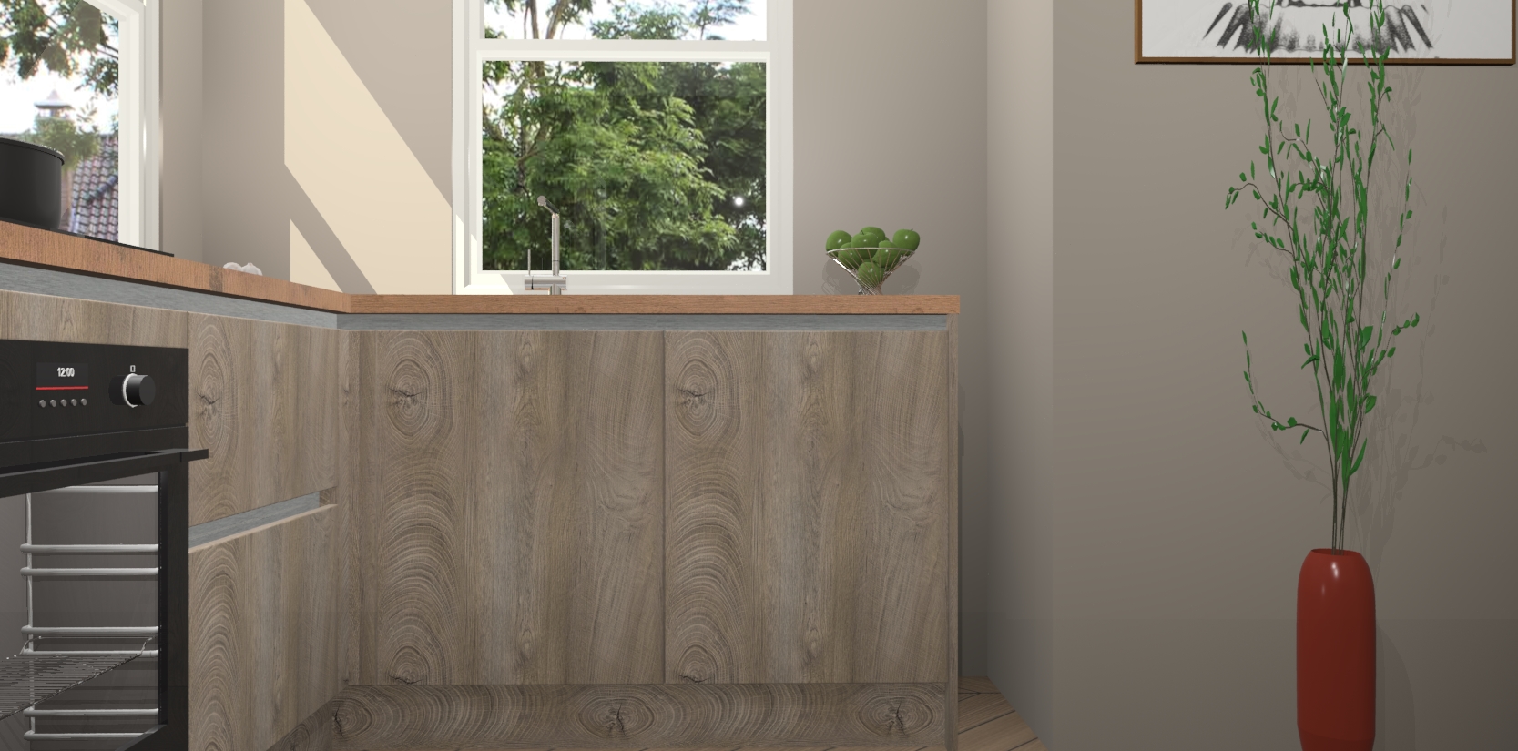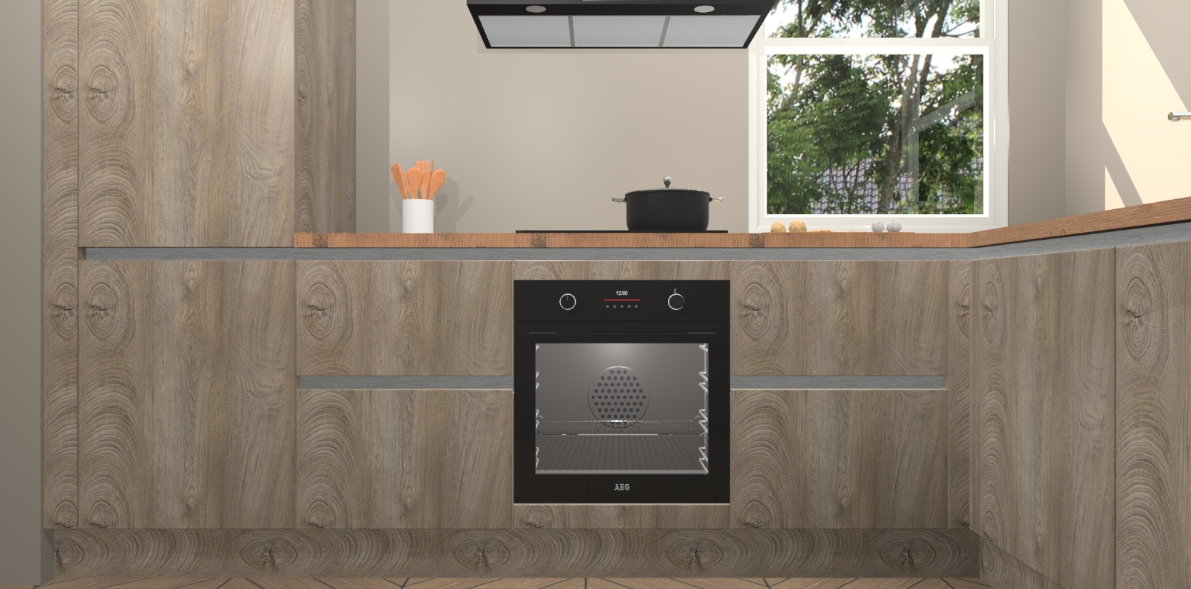 Wat maakt deze keuken zo bijzonder? Ten eerste geeft het houten werkblad uw ruimte een onmiskenbaar klassieke uitstraling. De natuurlijke afwerking roept warmte en elegantie op die nooit uit de mode zullen raken. Bovendien is het gemakkelijk schoon te houden en te onderhouden, zodat je er jarenlang plezier van kunt hebben. Als u op zoek bent naar extra gemak in uw keuken, dan heeft u bij het plaatsen van een bestelling bij ons ook de optie om uw toestellen te upgraden naar AEG-modellen - zo haalt u moderne innovatie van topmerken in apparatentechnologie rechtstreeks in huis.