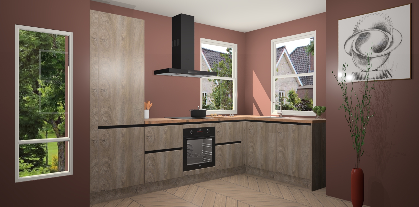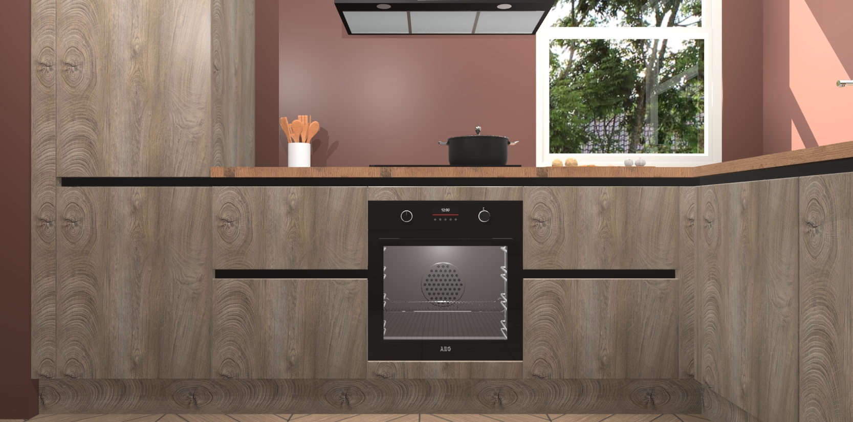 Wat maakt deze keuken zo bijzonder? Ten eerste geeft het houten werkblad uw ruimte een onmiskenbaar klassieke uitstraling. De natuurlijke afwerking roept warmte en elegantie op die nooit uit de mode zullen raken. Bovendien is het gemakkelijk schoon te houden en te onderhouden, zodat je er jarenlang plezier van kunt hebben. Als u op zoek bent naar extra gemak in uw keuken, dan heeft u bij het plaatsen van een bestelling bij ons ook de optie om uw toestellen te upgraden naar AEG-modellen - zo haalt u moderne innovatie van topmerken in apparatentechnologie rechtstreeks in huis.