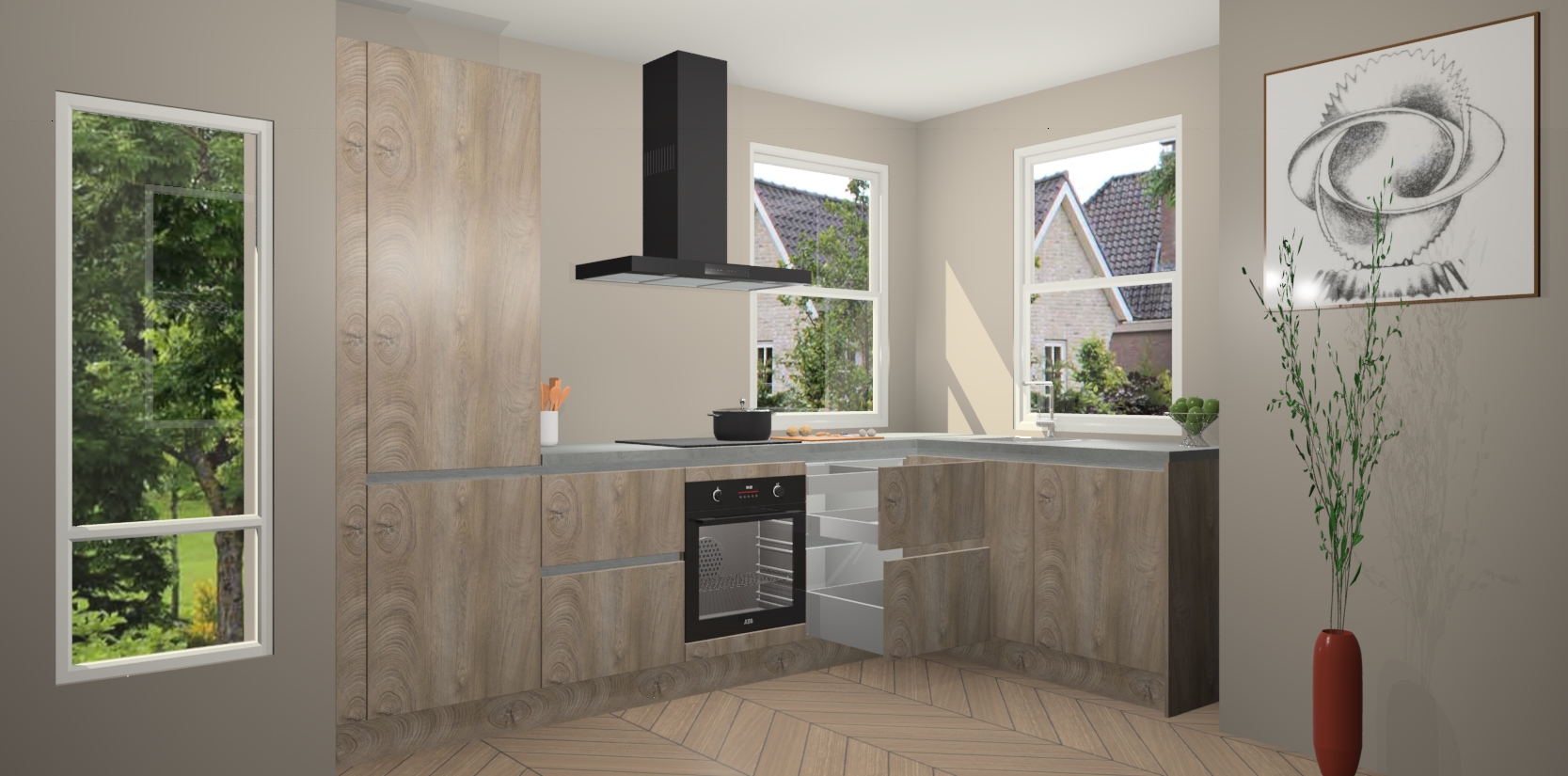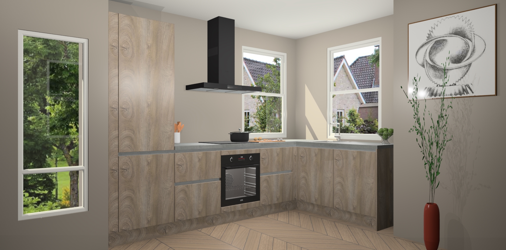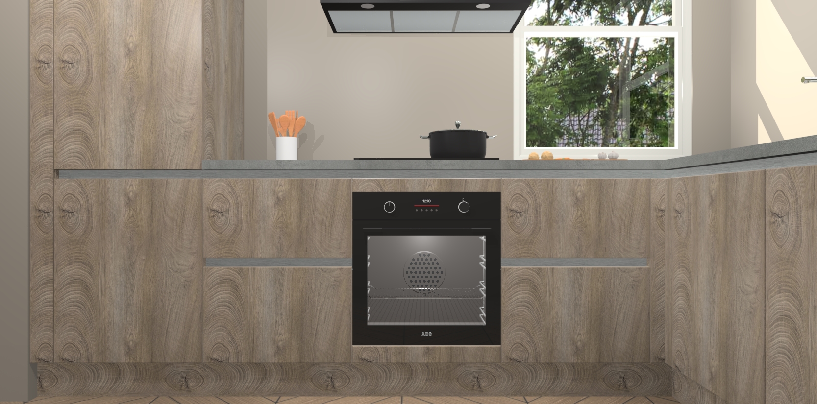 Wat maakt deze keuken zo bijzonder? Ten eerste geeft het houten werkblad uw ruimte een onmiskenbaar klassieke uitstraling. De natuurlijke afwerking roept warmte en elegantie op die nooit uit de mode zullen raken. Bovendien is het gemakkelijk schoon te houden en te onderhouden, zodat je er jarenlang plezier van kunt hebben. Als u op zoek bent naar extra gemak in uw keuken, dan heeft u bij het plaatsen van een bestelling bij ons ook de optie om uw toestellen te upgraden naar AEG-modellen - zo haalt u moderne innovatie van topmerken in apparatentechnologie rechtstreeks in huis.