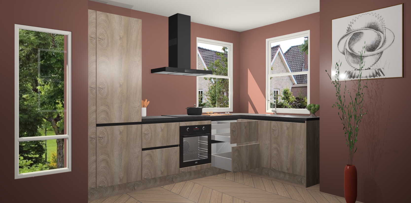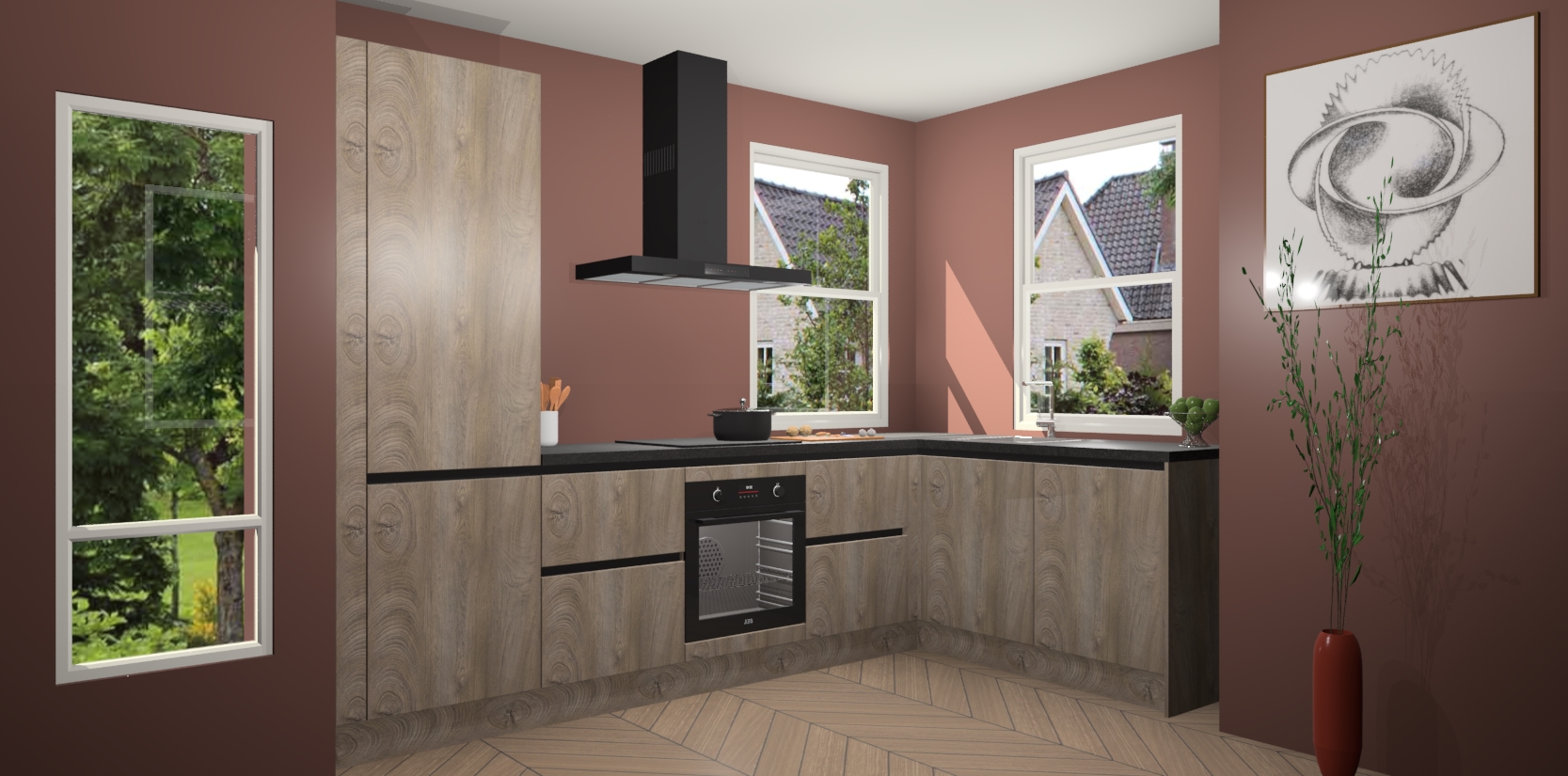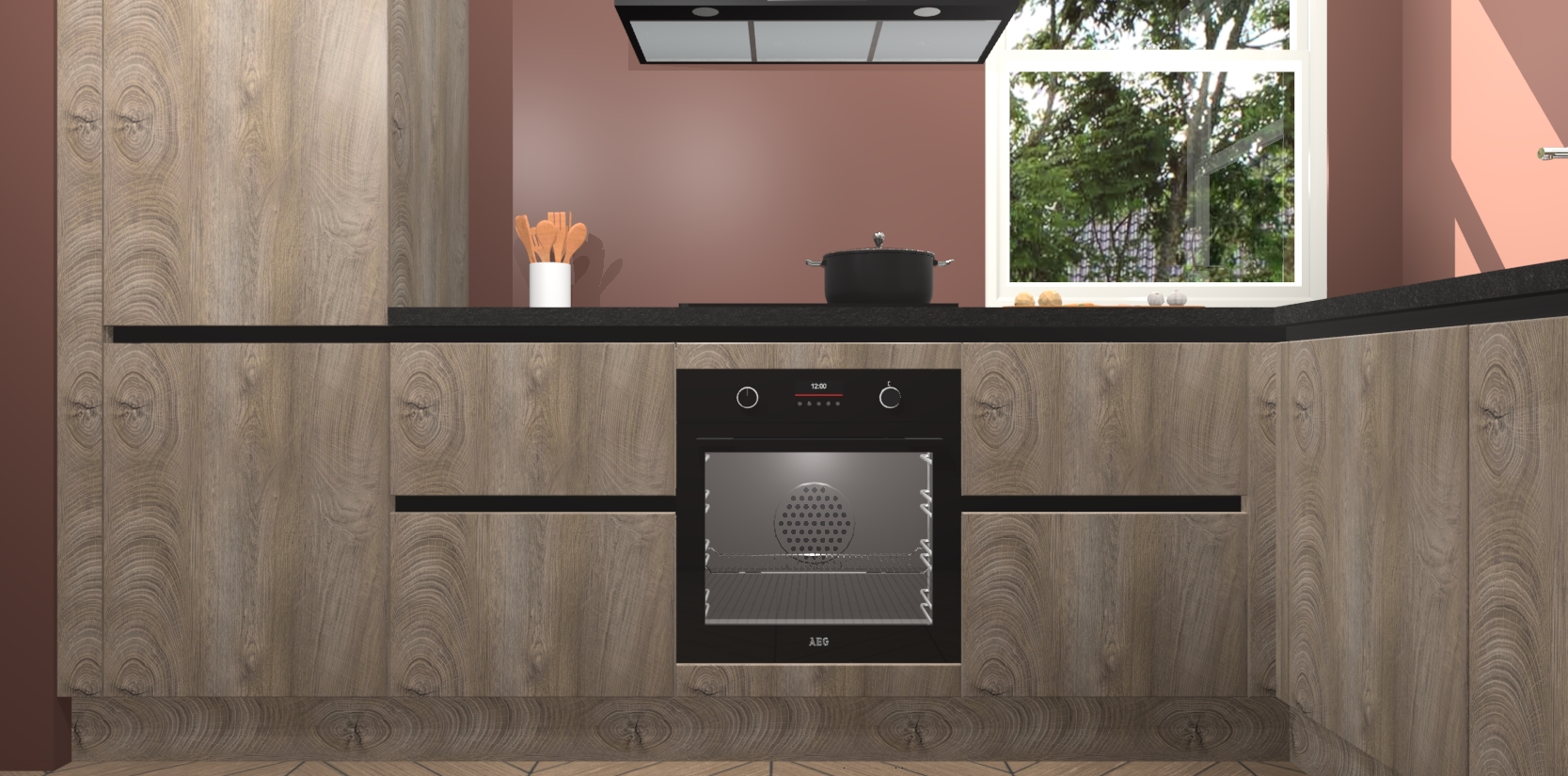 Wat maakt deze keuken zo bijzonder? Ten eerste geeft het houten werkblad uw ruimte een onmiskenbaar klassieke uitstraling. De natuurlijke afwerking roept warmte en elegantie op die nooit uit de mode zullen raken. Bovendien is het gemakkelijk schoon te houden en te onderhouden, zodat je er jarenlang plezier van kunt hebben. Als u op zoek bent naar extra gemak in uw keuken, dan heeft u bij het plaatsen van een bestelling bij ons ook de optie om uw toestellen te upgraden naar AEG-modellen - zo haalt u moderne innovatie van topmerken in apparatentechnologie rechtstreeks in huis.