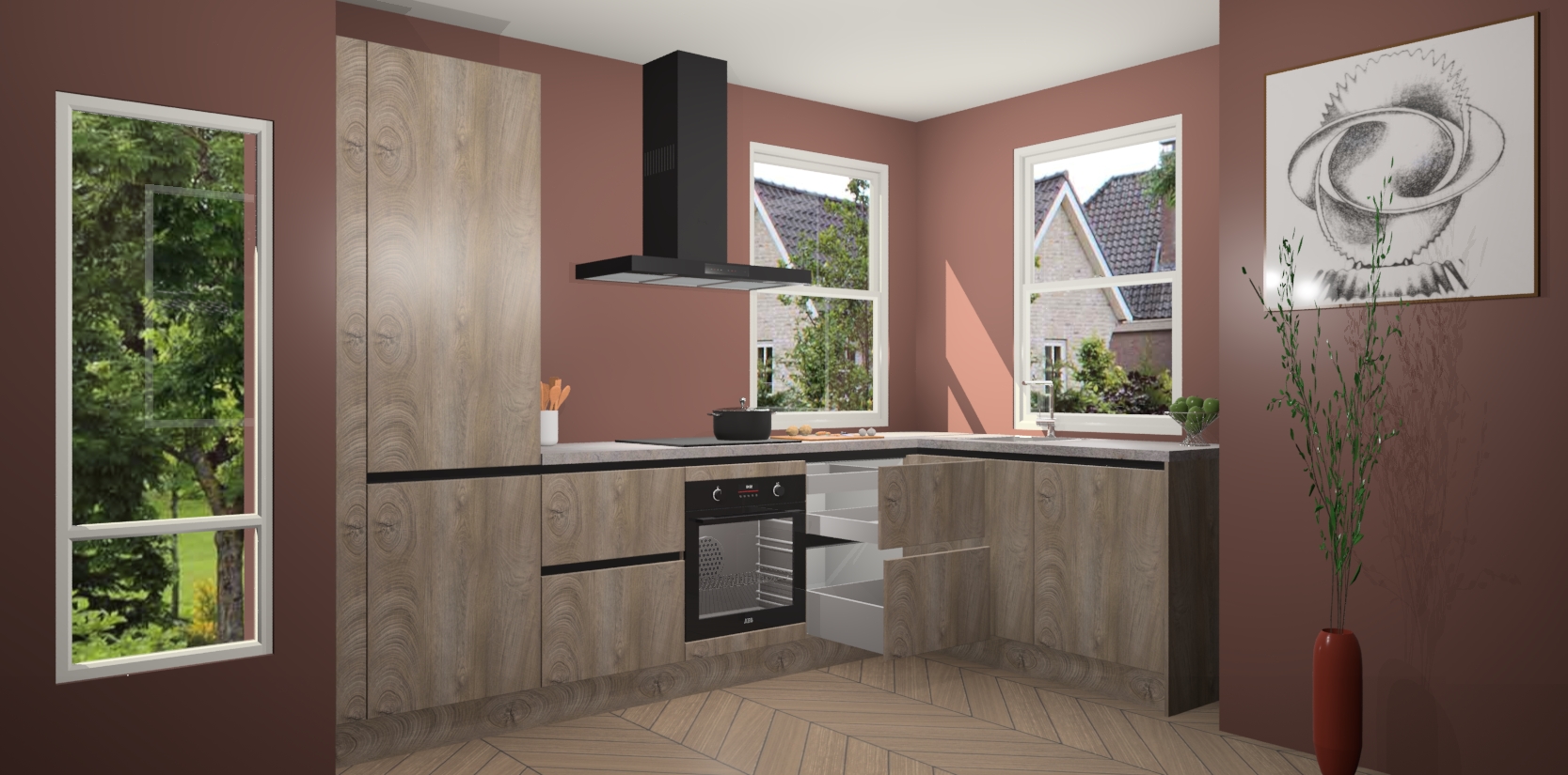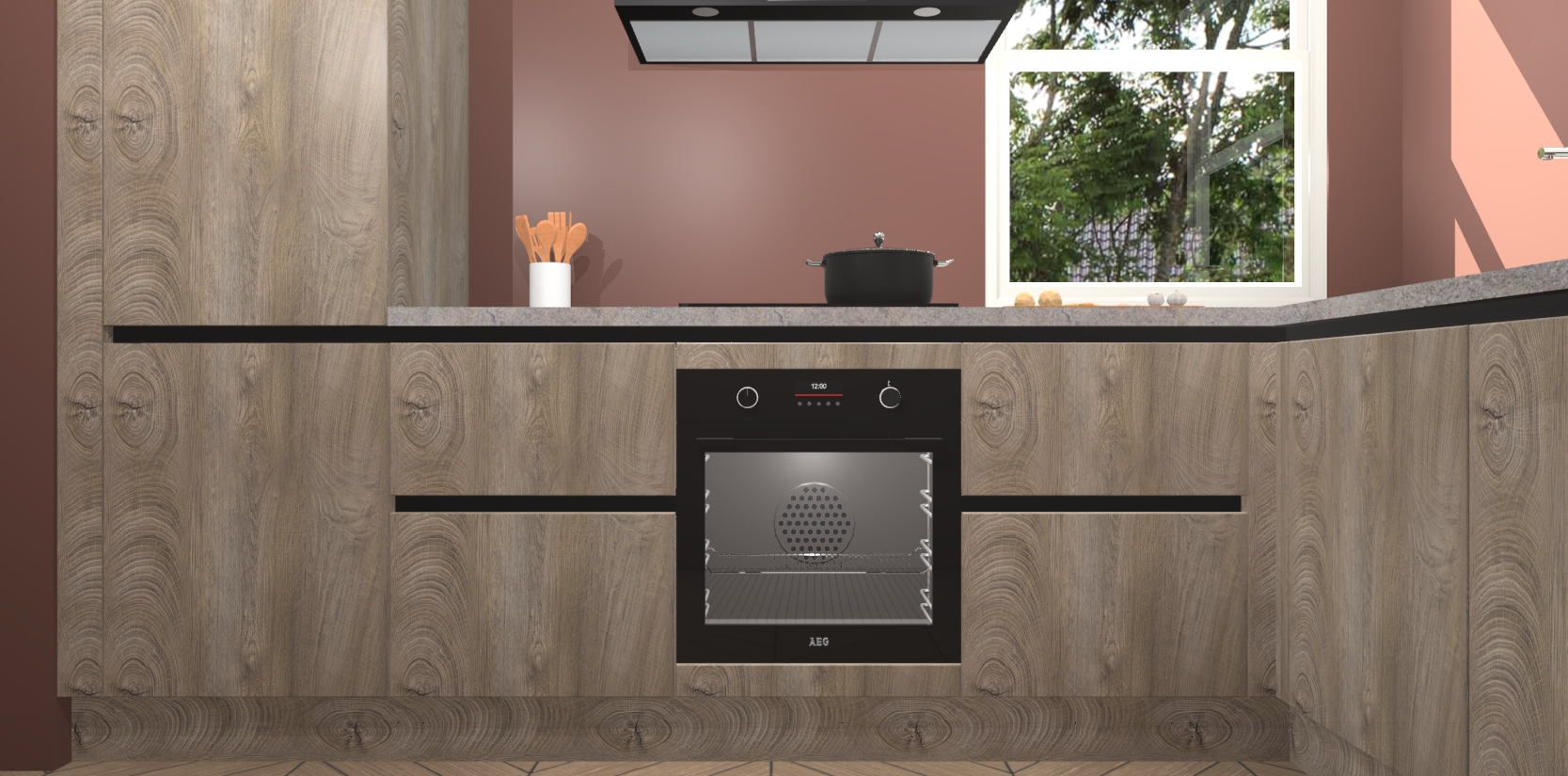 Wat maakt deze keuken zo bijzonder? Ten eerste geeft het houten werkblad uw ruimte een onmiskenbaar klassieke uitstraling. De natuurlijke afwerking roept warmte en elegantie op die nooit uit de mode zullen raken. Bovendien is het gemakkelijk schoon te houden en te onderhouden, zodat je er jarenlang plezier van kunt hebben. Als u op zoek bent naar extra gemak in uw keuken, dan heeft u bij het plaatsen van een bestelling bij ons ook de optie om uw toestellen te upgraden naar AEG-modellen - zo haalt u moderne innovatie van topmerken in apparatentechnologie rechtstreeks in huis.