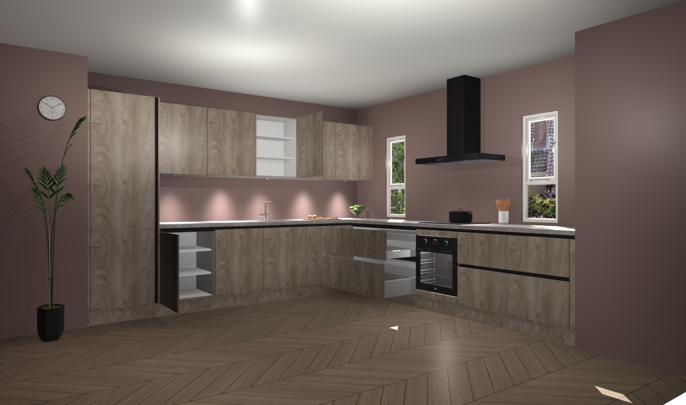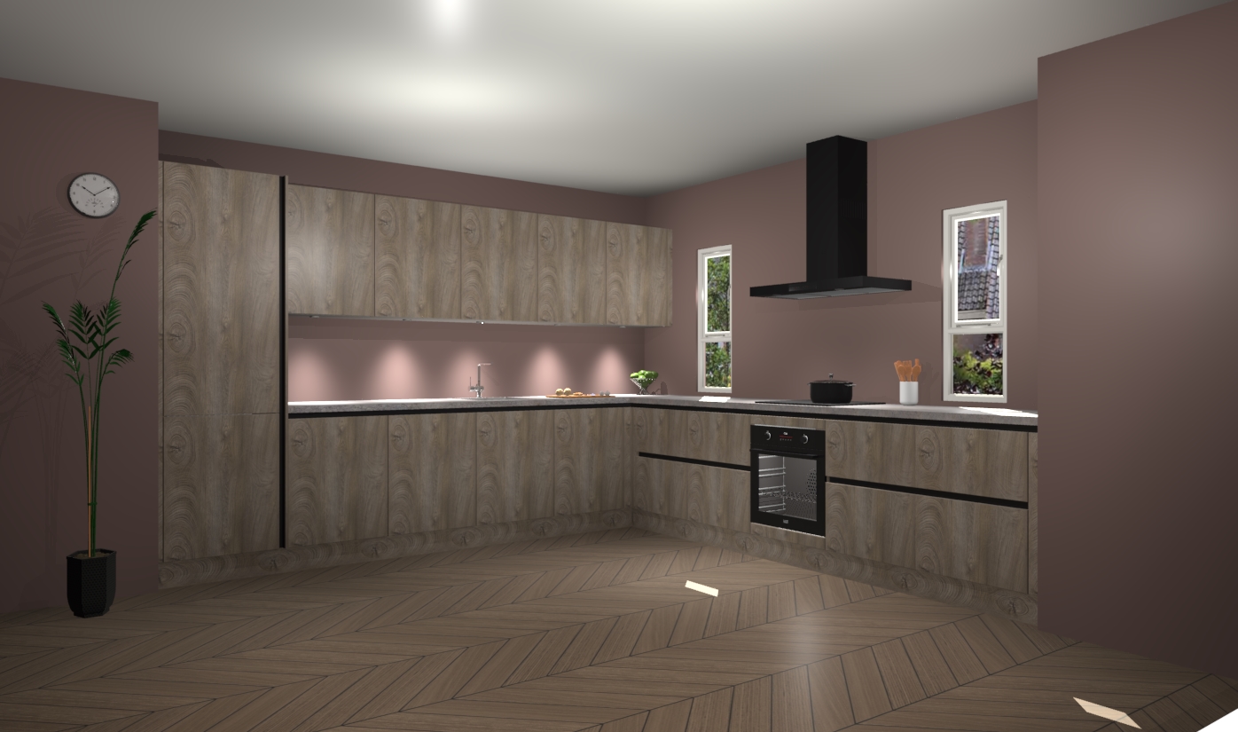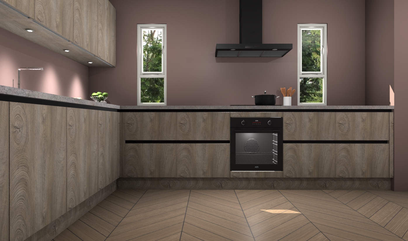 De cantaro eiken greeploze keuken is een ideale hoekkeuken en heeft alle functies en apparatuur die u maar nodig kunt hebben. Bij de bestelling krijgt u een oven, inductiekookplaat, afzuigkap, vaatwasser en koelkast - deze kunnen desgewenst eenvoudig worden uitgebreid naar AEG na bestellen. Elke kast wordt ook voor gemonteerd geleverd met soft close deuren die jarenlang gebruik beloven. Stelt u zich voor dat u geen gedoe heeft met vervelende montage - vanaf het moment dat u uw bestelling plaats, duurt het slechts 7 weken voor het bij u thuis geleverd wordt.