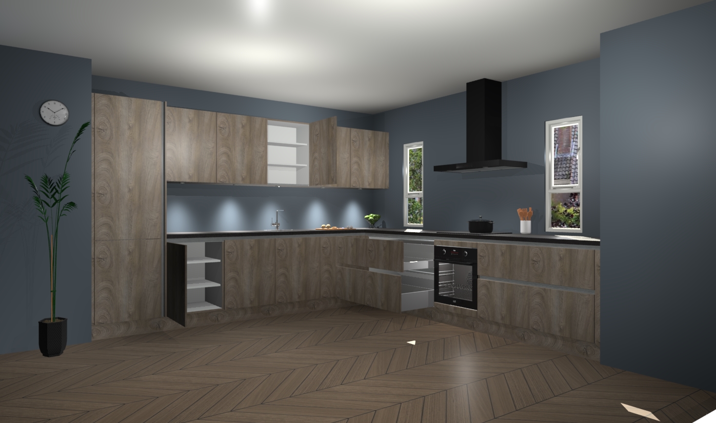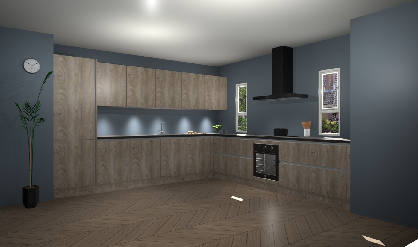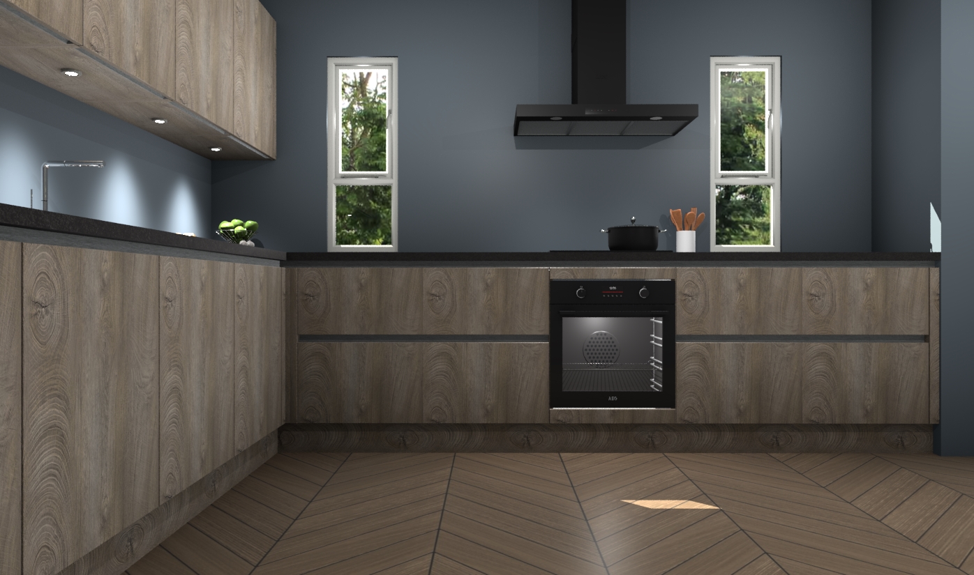 De cantaro eiken greeploze keuken is een ideale hoekkeuken en heeft alle functies en apparatuur die u maar nodig kunt hebben. Bij de bestelling krijgt u een oven, inductiekookplaat, afzuigkap, vaatwasser en koelkast - deze kunnen desgewenst eenvoudig worden uitgebreid naar AEG na bestellen. Elke kast wordt ook voor gemonteerd geleverd met soft close deuren die jarenlang gebruik beloven. Stelt u zich voor dat u geen gedoe heeft met vervelende montage - vanaf het moment dat u uw bestelling plaats, duurt het slechts 7 weken voor het bij u thuis geleverd wordt.