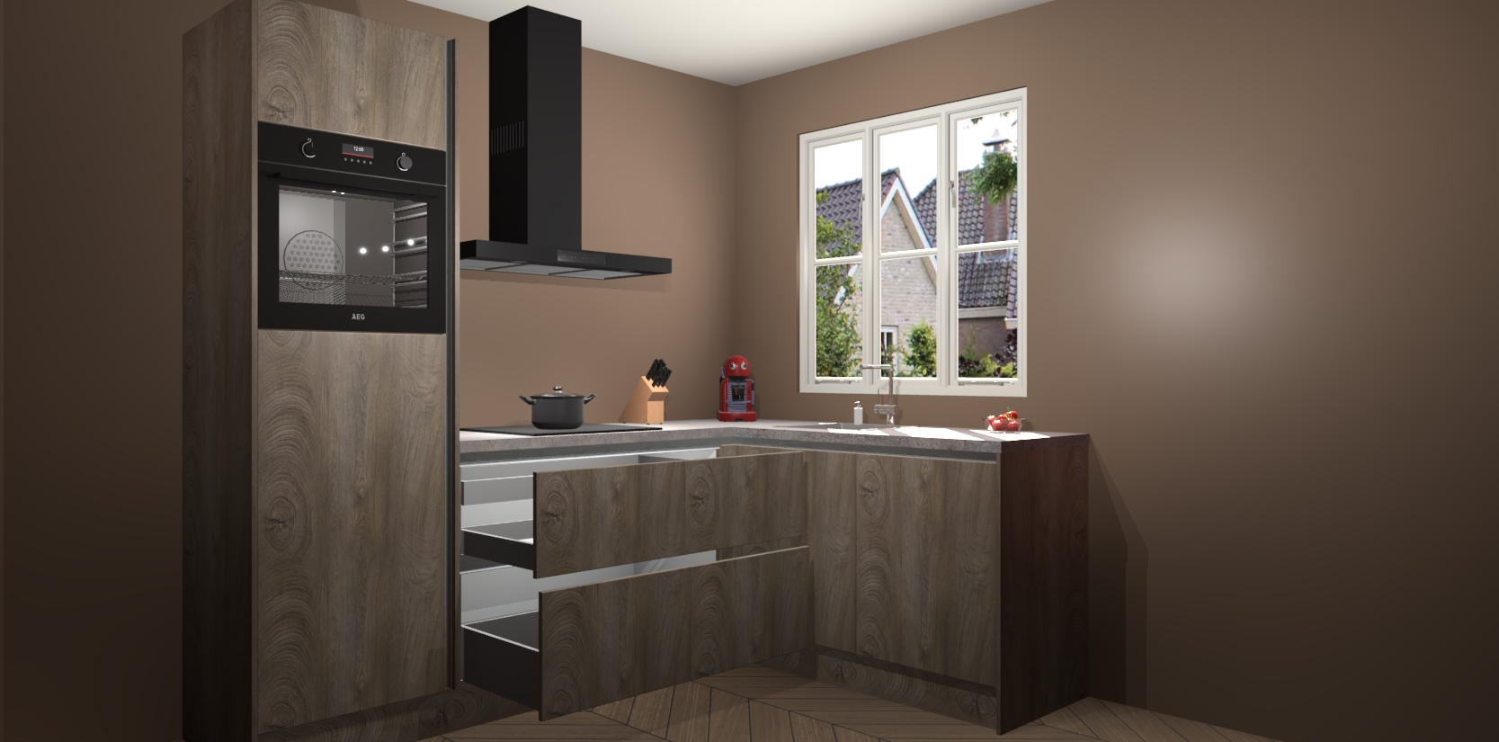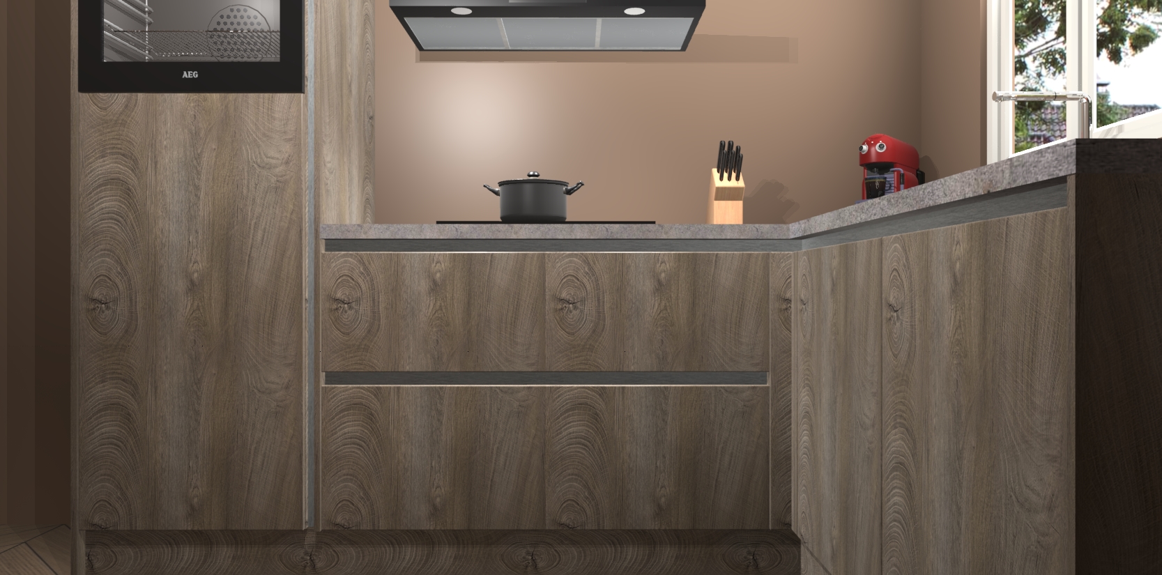 Dit model biedt u voldoende opbergruimte en vijf ingebouwde apparaten: een oven, inductiekookplaat, afzuigkap, vaatwasser en koelkast. Deze apparaten kunnen gemakkelijk worden geüpgrade naar AEG nadat u besteld heeft. De verschillende laden en kastjes bevatten softclose-deuren waardoor ze gezellig dichtvallen met een geruststellend helemaal geruisloos geluid. En dat is nog niet alles! We garanderen ook dat de prijs altijd laag blijft - dus haal nu uw Cantaro Eiken greeploze keuken Victoria terwijl het kan.